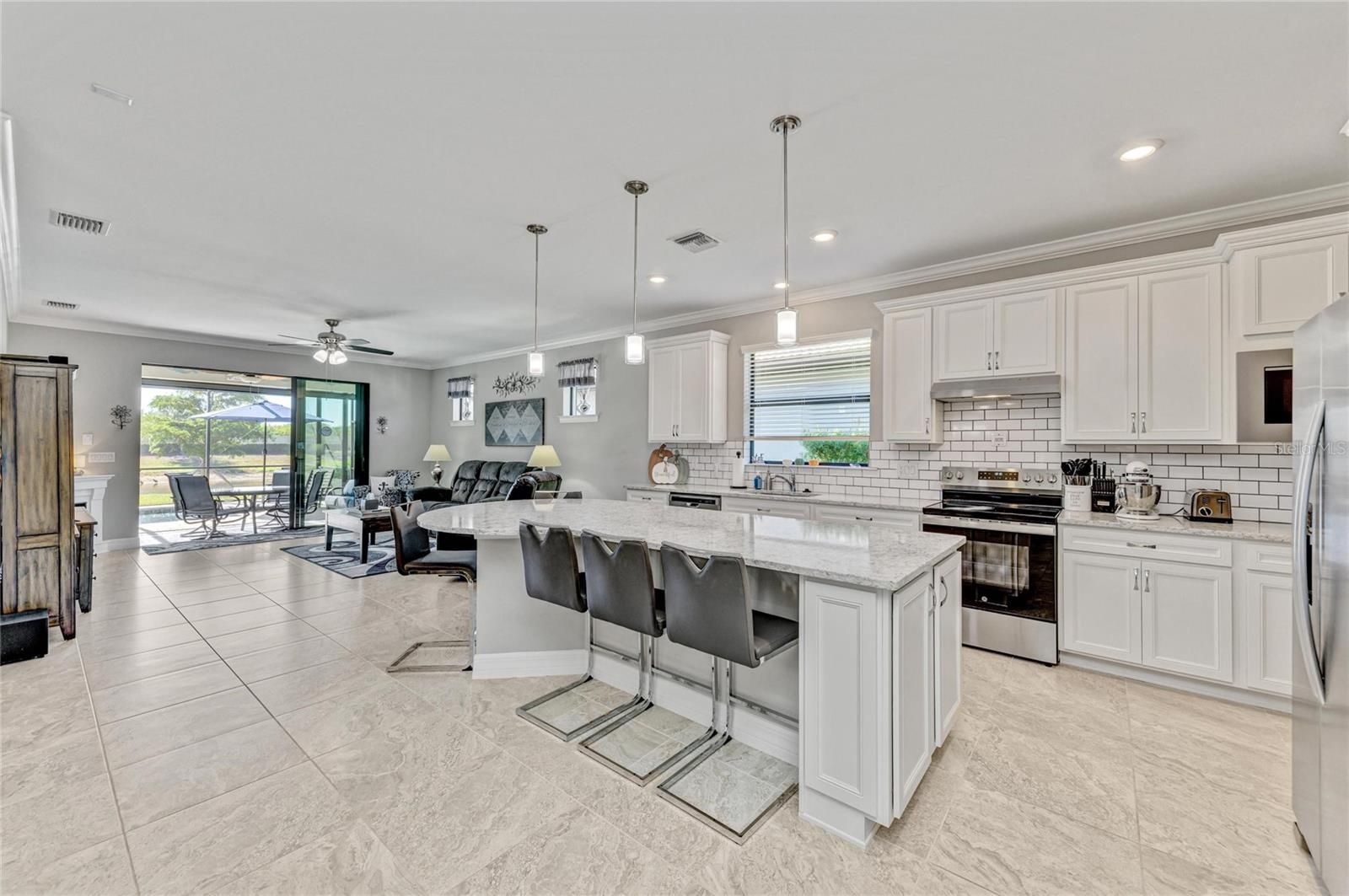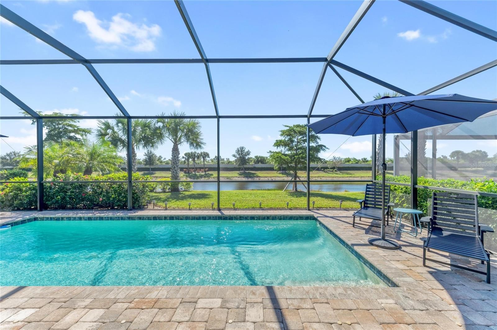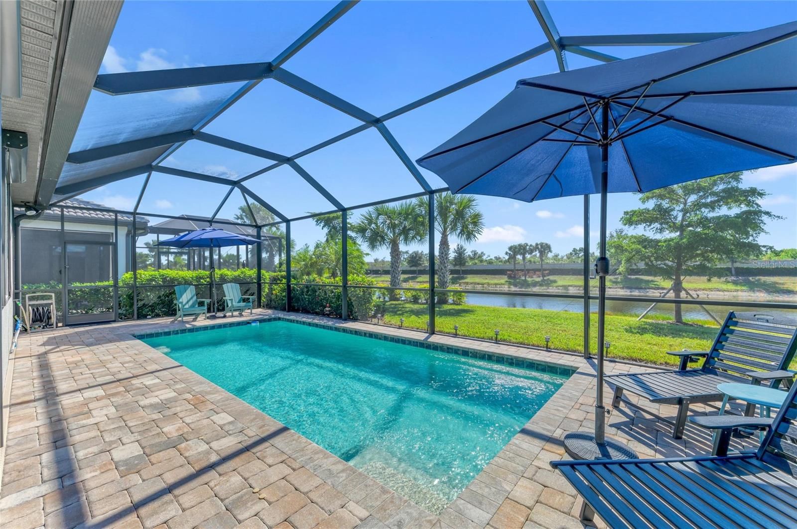 Discover the highly sought-after Martin Ray model with private heated swimming pool, impeccably maintained and enhanced with upgrades throughout, offering luxury, functionality, and style at every turn. This beautifully updated two-bedroom home, featuring an additional den and two full baths, is truly move-in ready. The exterior impresses with outstanding curb appeal, an extended paver driveway and walkway, and a screened front entry that sets the stage for the elegance found inside. Upon entering, you’ll find tile flooring throughout the main living areas, complemented by neutral paint tones and refined crown molding. The front den or office showcases glass French doors, creating an ideal space for remote work or quiet relaxation. The chef’s kitchen is a standout, boasting quartz countertops, a custom backsplash, 42-inch upper cabinets, pull-out drawers, a butler’s pantry, and stainless-steel appliances. The spacious great room flows seamlessly to the southern-facing lanai through sliding glass pocket doors, allowing you to enjoy the home’s stunning private waterfront setting. Recent upgraded storm protection, including roll-down shutters and hurricane screens on the lanai provides added peace of mind as well as privacy. The oversized tandem garage features epoxy flooring, pull down attic stairs as well as additional attic storage, additional lighting, and abundant storage options, while the laundry room includes a washer, dryer, and generous storage space. The serene primary suite offers beautiful water views and a luxurious bathroom with dual sinks, a tiled shower with decorative inlay, and an expansive walk-in closet. The dining and living room furniture may also convey if desired. This home is a remarkable blend of elegant design, thoughtful upgrades, and inviting outdoor living—an exceptional opportunity to own one of the area’s most desirable floor plans. IslandWalk is known as one of Venice’s most social and vibrant communities, offering a full-time activities director, countless events, clubs, and recreational options. Residents enjoy two community clubhouses, an event center, two resort-style pools, a lap pool, twelve pickleball courts, eight Har-Tru tennis courts, a dog park, playground, basketball court, community garden, and miles of golf cart paths, walking and biking trails, Venetian-style bridges, and waterways. The Atlanta Braves stadium is just a short bike ride away, offering year-round entertainment. The newly completed marketplace features Publix, restaurants, shopping, and essential services. Nearby Downtown Wellen Park offers an 80-acre lake, waterfront dining, rooftop decks, boutique retail, pedestrian-friendly streets, a splash pad, playground, and a public town hall that hosts live theater and music events, with a hammock grove and food truck park coming soon. The IslandWalk HOA includes grounds maintenance, cable, Wi-Fi, amenities, and 24-hour guard services. Don’t miss your chance to tour this exceptional home.