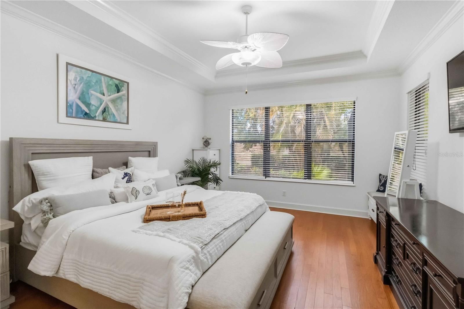 - Built-in Features, Ceiling Fan(s), Crown Molding, Eat-in Kitchen, High Ceilings, Living/Dining Room, Open Floorplan, Main Level Primary, Stone Counters, Thermostat, Tray Ceiling(s), Walk-In Closet(s), Window Treatments