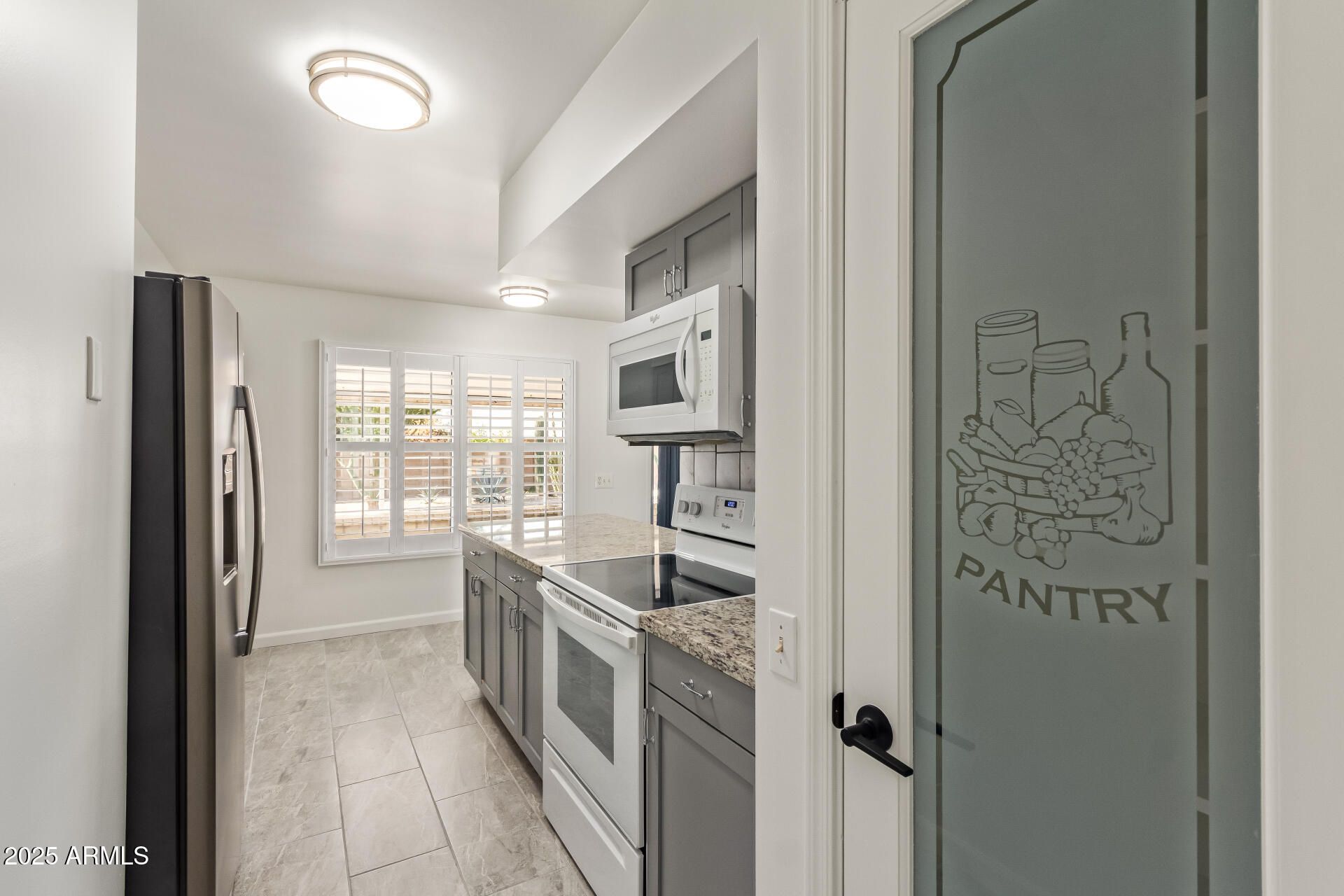 This beautifully updated Expanded Woodbury model offers 1,480 sq ft of comfortable living space, designed for both relaxation and entertainment. Recent upgrades include a newer roof and A/C unit for added peace of mind. Inside, you'll find an open floor plan with flat ceilings, ceiling fans, plantation shutters, six-panel doors, and tile flooring throughout the main living areas. The spacious living and dining room combination provides an inviting setting. The updated kitchen features modern shaker cabinets, granite countertops, tile backsplash, updated fixtures, and appliances. The bedrooms offer new carpet, walk-in closets, and remodeled bathrooms complete with raised vanities, granite countertops, new toilets, fixtures, and a walk-in shower in the primary bathroom. Additional features include inside laundry, a large utility room perfect for an office or hobby space, and a two-car garage with built-in storage cabinets. Step outside to enjoy Arizona living at its best with a private fenced backyard, extended paver patio, and new irrigation system.