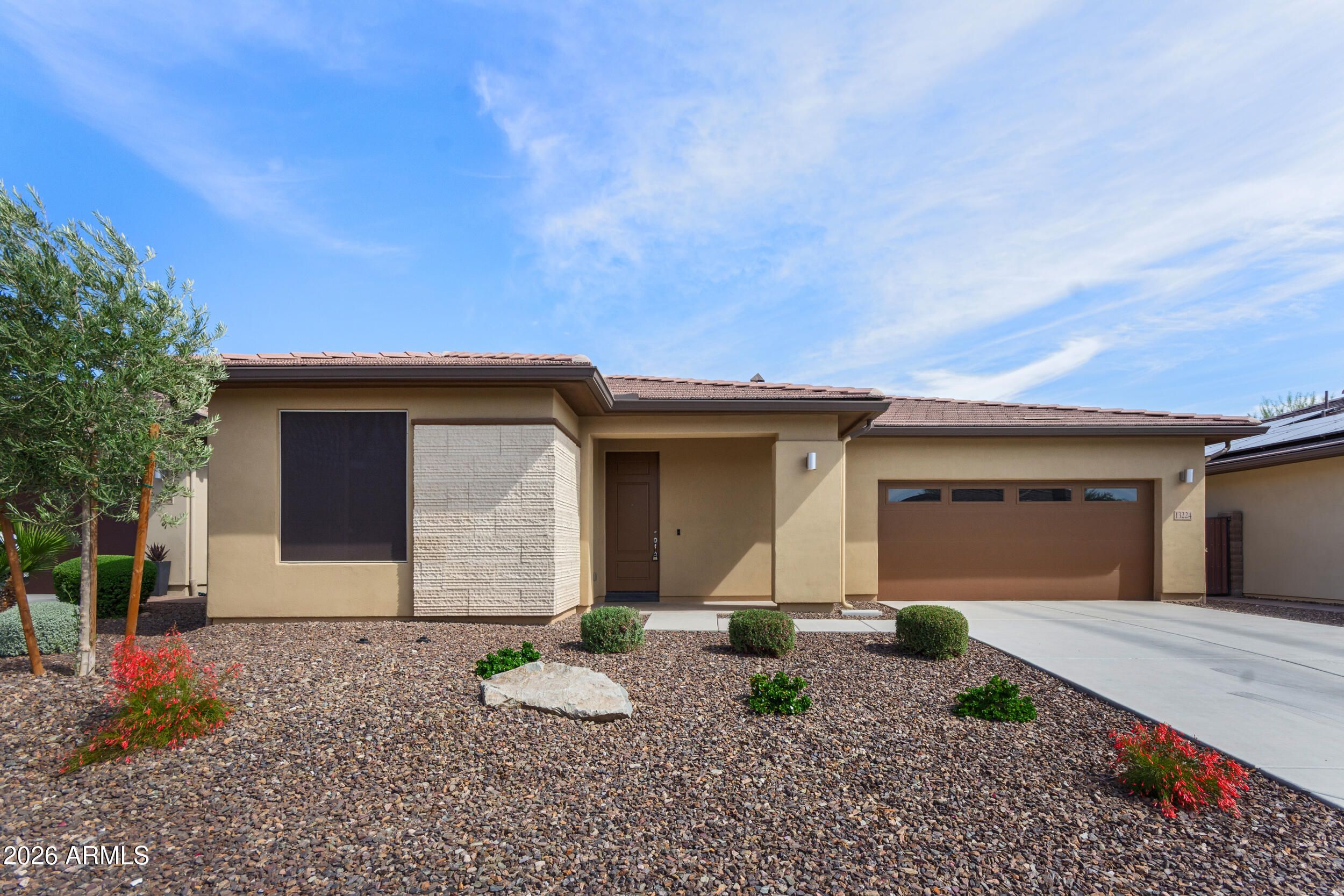 55+ community Move-in ready this home features a spacious open floor plan with an abundance of windows that fill the space with natural light. The seamless layout creates an inviting atmosphere. The kitchen flows effortlessly into the main living areas, enhancing both functionality and connection throughout the home. Step outside to enjoy the low-maintenance desert landscaping, offering great curb appeal while keeping upkeep simple and efficient. The backyard provides a peaceful setting to relax. The primary suite serves as a private retreat, highlighted by beautiful and large bathroom designed with elegance. With its functional layout, natural light, and thoughtful design, this home is truly move-in ready and ready to be enjoyed from day one.