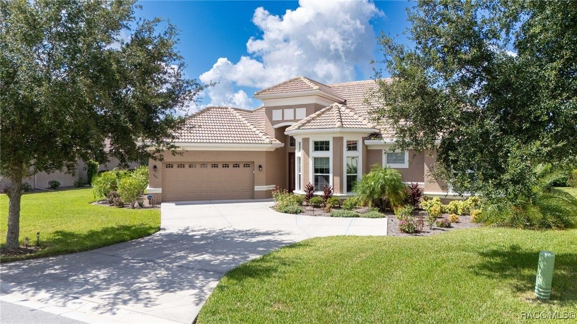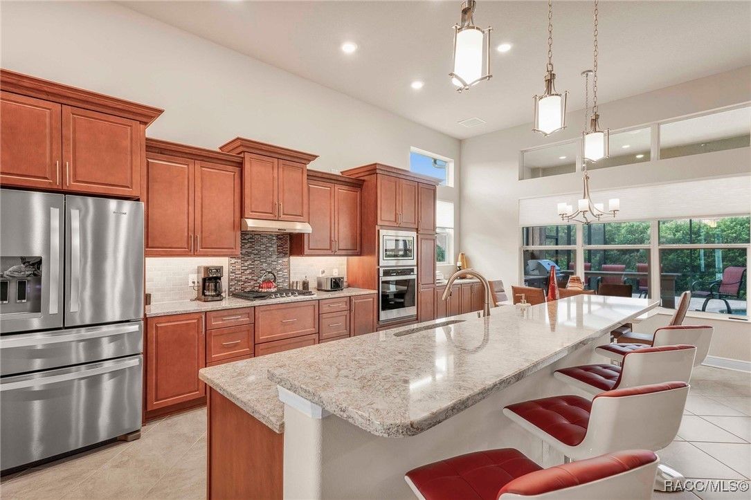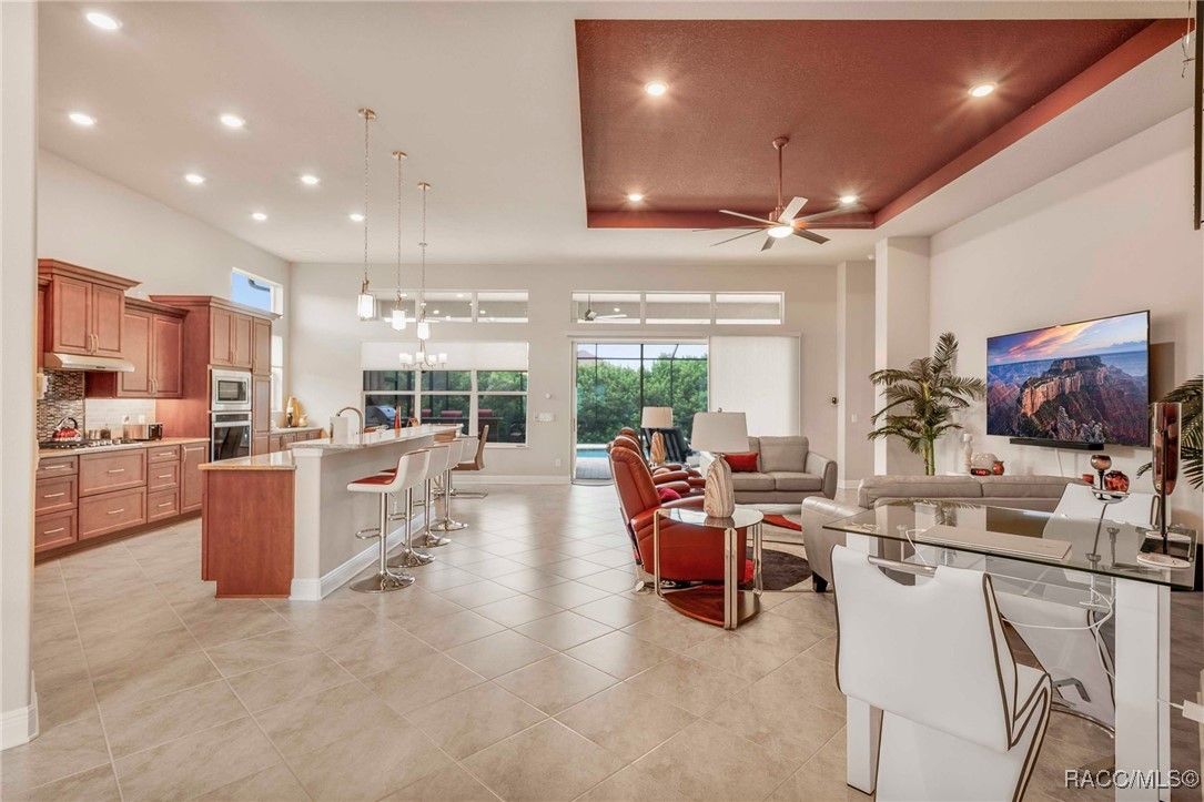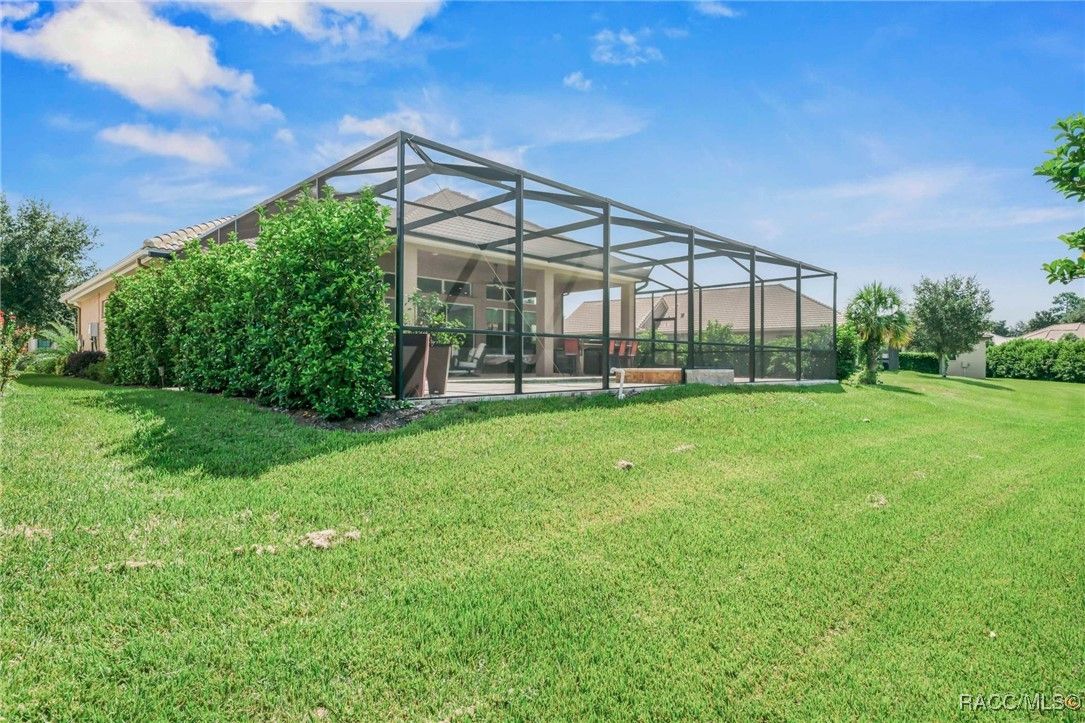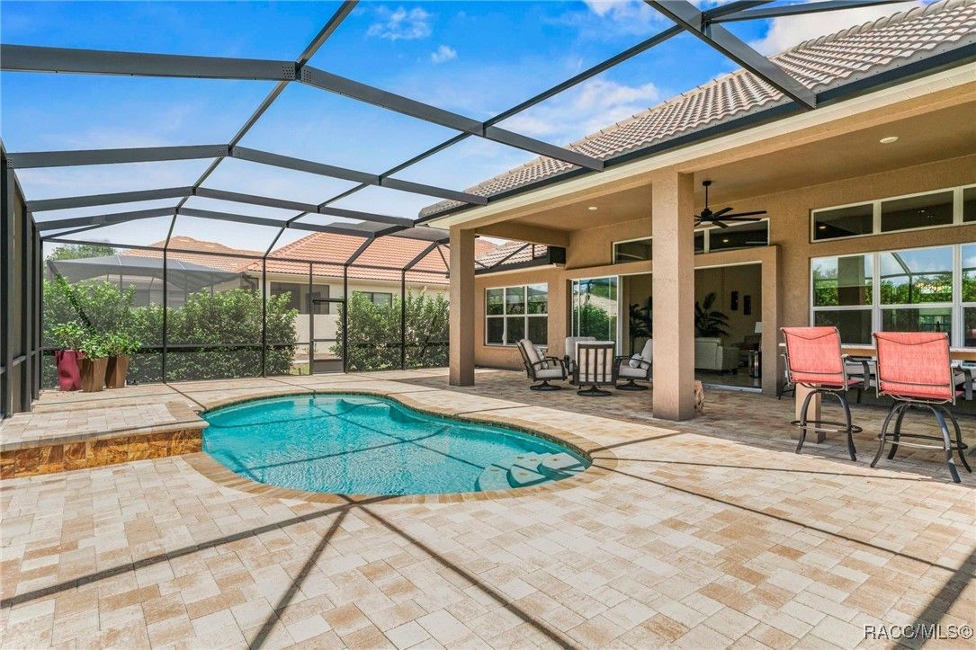 ELEGANCE AND STYLE await you in this nearly-new home. Built in 2023, this beauty has fabulous lighting and fans throughout the entire home. The transom windows in the large living area create a light-filled space which opens to a beautiful oversized lanai and waterfall pool - complete with an outdoor kitchen! The interior kitchen boasts loads of cabinets with granite countertops, a gas cooktop and a walk-in pantry. The built-in oven and microwave complete this impressive kitchen. An oversized laundry room also features a large sink with additional cabinetry. The primary bedroom boasts two walk-in closets and two separate vanities in the bathroom. The guest room and additional den/office/bedroom are flanked by two full bathrooms as well. The oversized two car garage is perfect for two cars and a golf cart. Surrounded by lush landscaping, the outside of the home is as beautiful as the inside - and its high above sea level, no flood insurance required. All this and the amenities of Citrus Hills Golf and Country Club!