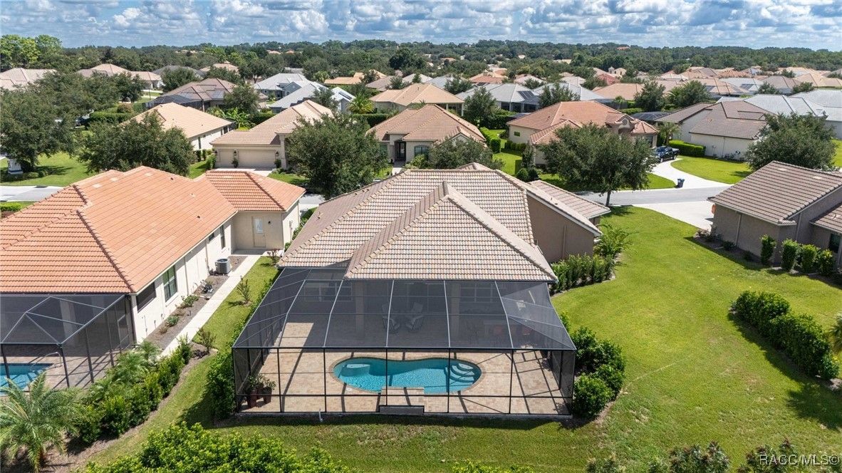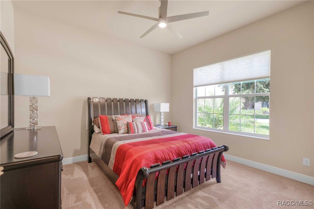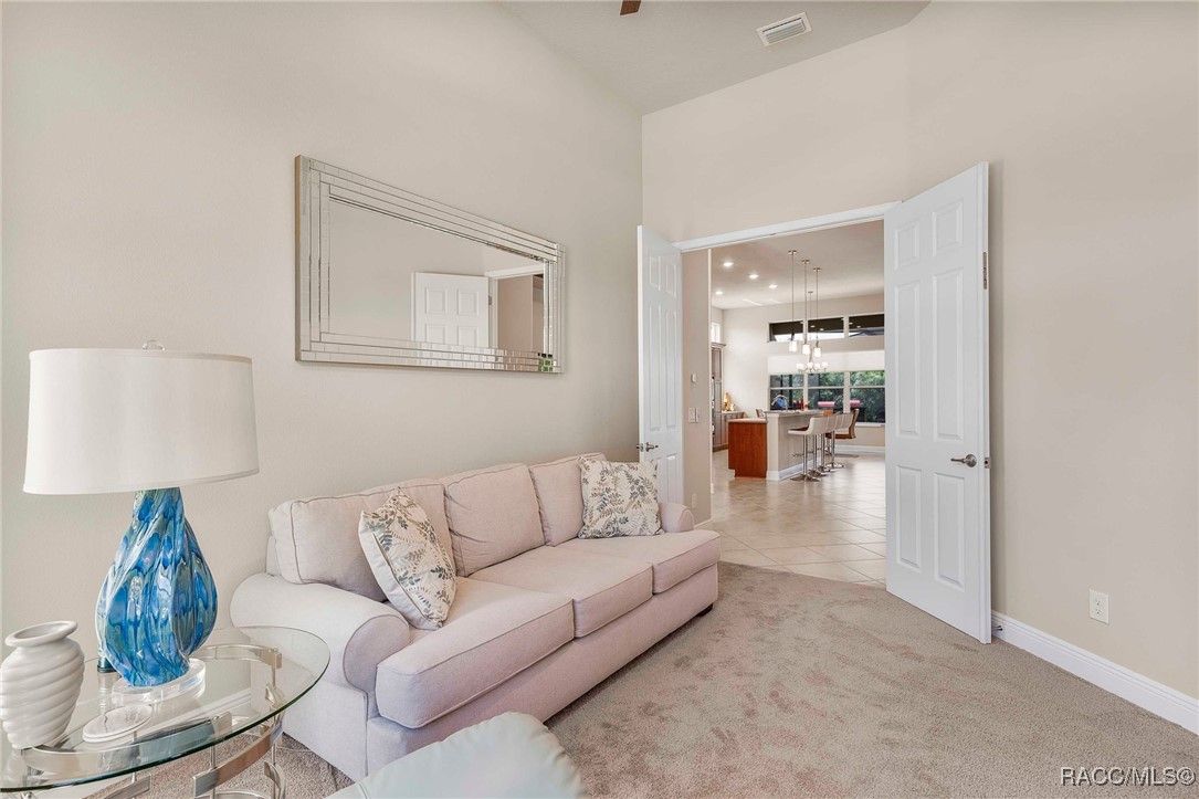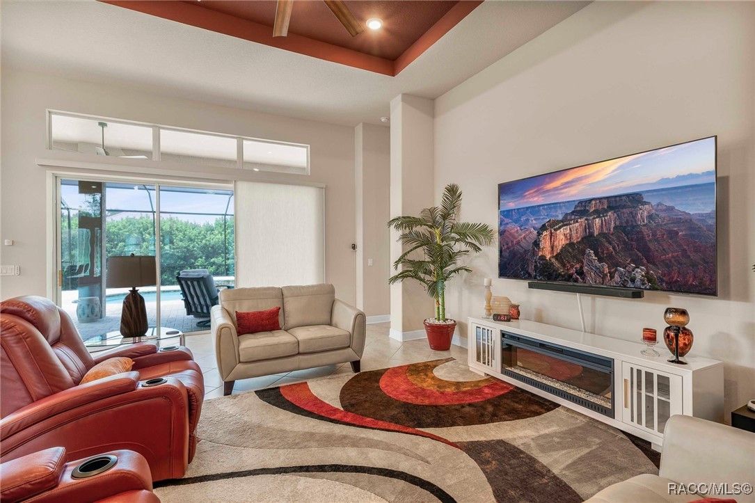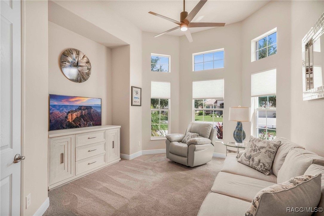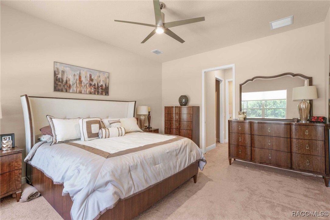 ELEGANCE AND STYLE await you in this nearly-new home. Built in 2023, this beauty has fabulous lighting and fans throughout the entire home. The transom windows in the large living area create a light-filled space which opens to a beautiful oversized lanai and waterfall pool - complete with an outdoor kitchen! The interior kitchen boasts loads of cabinets with granite countertops, a gas cooktop and a walk-in pantry. The built-in oven and microwave complete this impressive kitchen. An oversized laundry room also features a large sink with additional cabinetry. The primary bedroom boasts two walk-in closets and two separate vanities in the bathroom. The guest room and additional den/office/bedroom are flanked by two full bathrooms as well. The oversized two car garage is perfect for two cars and a golf cart. Surrounded by lush landscaping, the outside of the home is as beautiful as the inside - and its high above sea level, no flood insurance required. All this and the amenities of Citrus Hills Golf and Country Club!