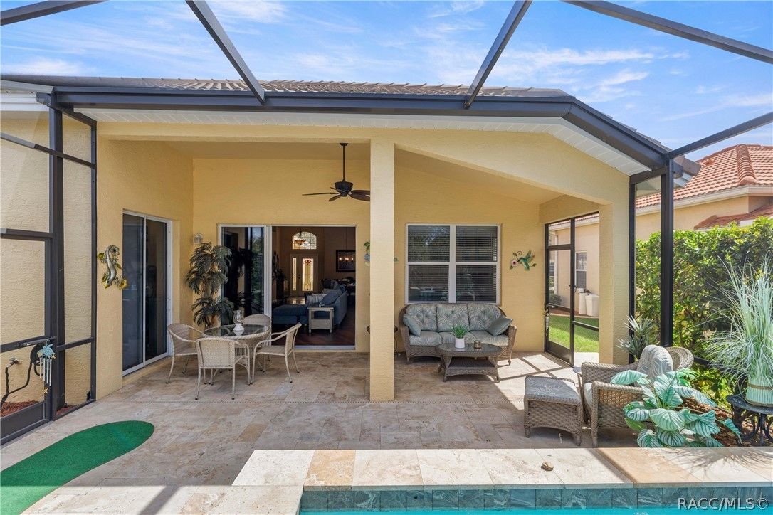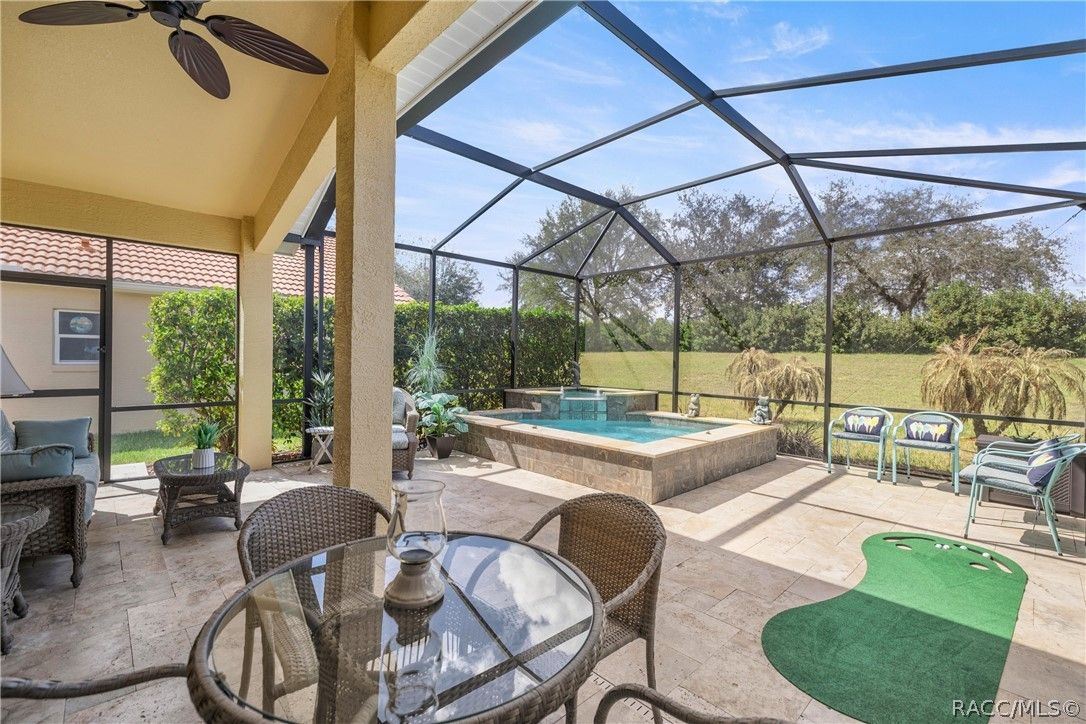 Dream of a beautiful Carefree Home with a custom Saltwater Pool/Spa, Waterfall/Fountain and Travertine Pavers, you have found your Oasis! Now imagine this home sitting at 110 Ft above Sea Level in the Amenity Rich Gated Community of Terra Vista and it spells Paradise! Enjoy your custom gas-heated saltwater pool and spa, supported by the Pentair IntelliCenter Pool System, and lighted Waterfall/Fountain that is surrounded by elegant travertine pavers and a private extended lanai, creating the perfect setting to relax or entertain. The pool, spa, and decking were installed in 2020, and the home also features a brand-new high-efficiency HVAC system. Step through the beautiful, fused glass front door into a bright open floor plan with stylish luxury vinyl flooring and tasteful accent paint throughout. The upgraded kitchen features shaker-style maple cabinets, granite countertops, stainless steel appliances, a gas range, textured subway tile backsplash, and a spacious breakfast nook. A flexible dining room can easily serve as an office or additional living space. The large laundry room offers granite counters, shaker cabinetry, and stainless-steel washer and dryer. With 3 bedrooms, including two oversized bedrooms comparable to primary suites, the 1,705 sq ft layout provides comfortable, flexible living. All this while enjoying making friends while dancing at the Tiki Bar, playing pickleball, swimming at the three pools, soon to be four! Love dining? Enjoy the three restaurants, work it off at one of the two fitness centers, and the luxurious spa. How about 3 championship Golf course, and one nine. Har Tru and Traditional Tennis Courts are energetic and fun! Love cycling, walking, dog walking at the dog park, lots of events and clubs. So much to enjoy here at Citrus Hills. Convenient access to the Suncoast Parkway provides an easy drive to Tampa and surrounding areas, with excellent healthcare nearby including Tampa General Hospital. Experience the perfect blend of comfort, privacy, and resort-style living.