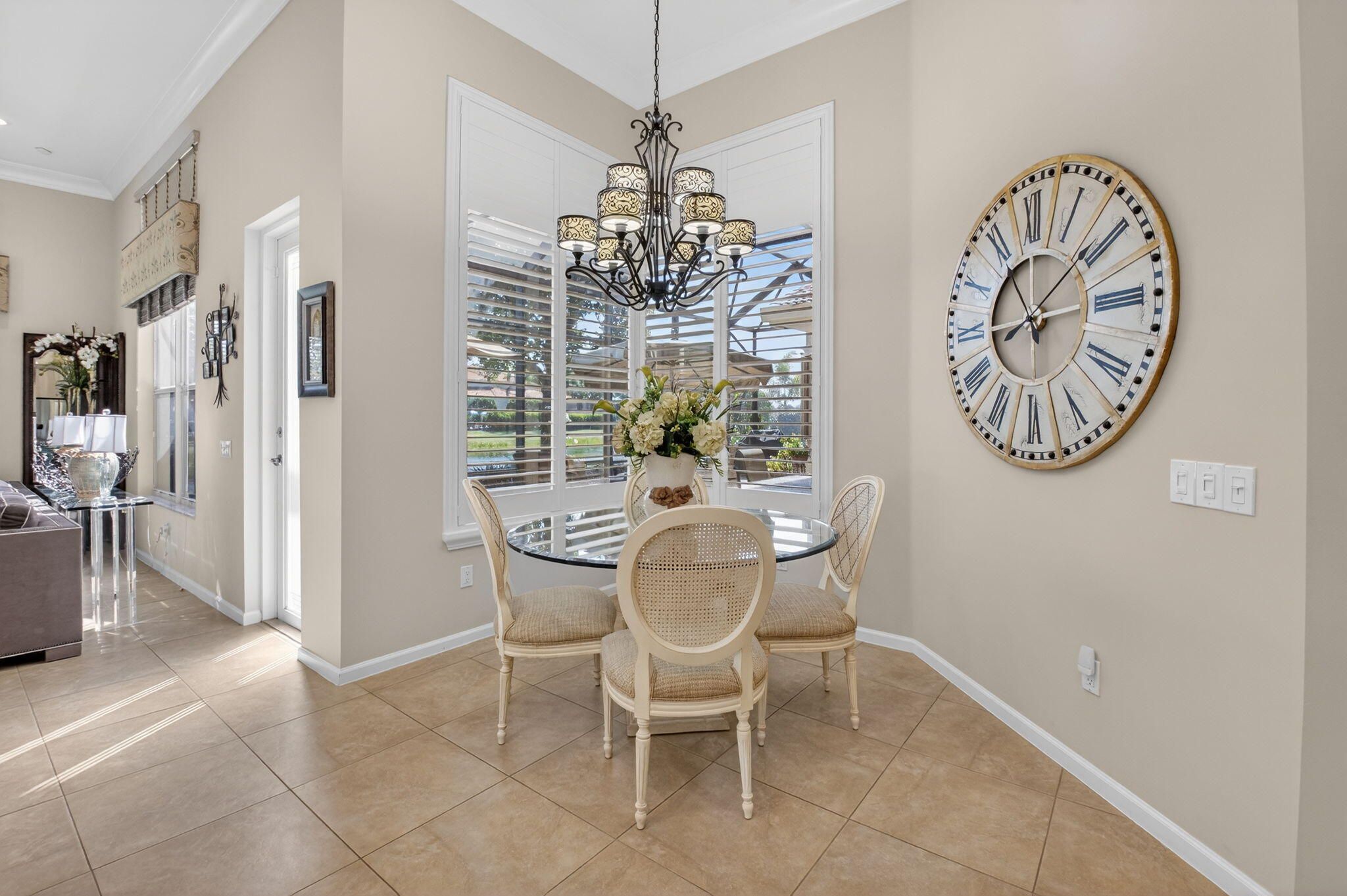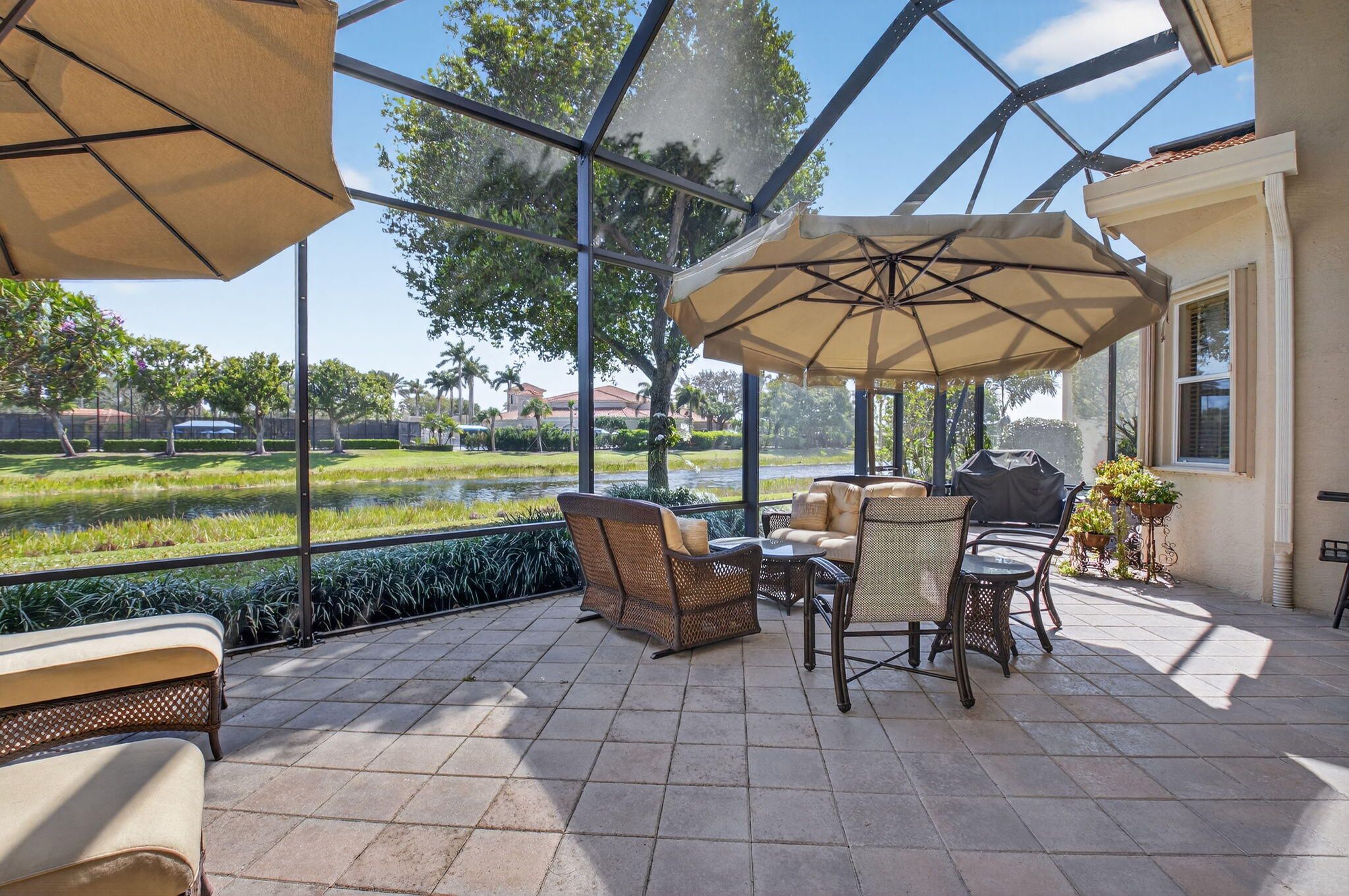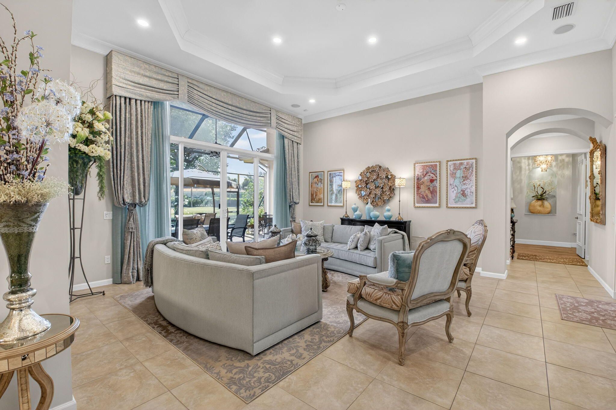 Experience luxury in this 3bdrm/3.1bath 3000sq' lakefront Imperial model home in the prestigious Royal Estates of Valencia Palms. This impeccably maintained home offers ultimate peace of mind with a brand-new 2025 roof and a full-house generator. The gourmet kitchen, renovated 3 years ago, features high-end cabinetry, pull-outs, top-of-the-line LG appliances with an induction cooktop. Enjoy a carpet-free interior with luxury vinyl and ceramic tile, complemented by plantation shutters and custom window treatments throughout. The primary suite boasts a renovated spa-like bath and custom-outfitted closets. Crown moldings, wainscotting throughout. Relax on the screened lanai with a stunning lake view. perfect for relaxing or entertaining.Every detail has been carefullyconsidered, more making this home truly move in ready.This is Florida living at its finest in a premier 55+ community with a 31,000 sq. ft. clubhouse and resort amenities.Valencia Palms has the best location close to beaches, restaurants and shopping.There is a gorgeous Clubhouse, Fitness Center,Resort Pools, Lap Pool, Resistance Pool, Billiard Room, Cafe', Social Events, Clubs,Shows, Grand Ball Rm. Pickleball, Tennis. Bocce Ball. Maintenance fee includes cafe card, Cable with all channels, internet, landline,ext. house painting,alarm,lawn/ tree care and so much more. Come enjoy the Valencia Palms Lifestyle. Buyer pays 1X capital contribution $5090. Maintenance fee $2520/quarter includes exterior house painting, lawncare, cable, internet, house phone, exterior pest control, power washing roofs and more.