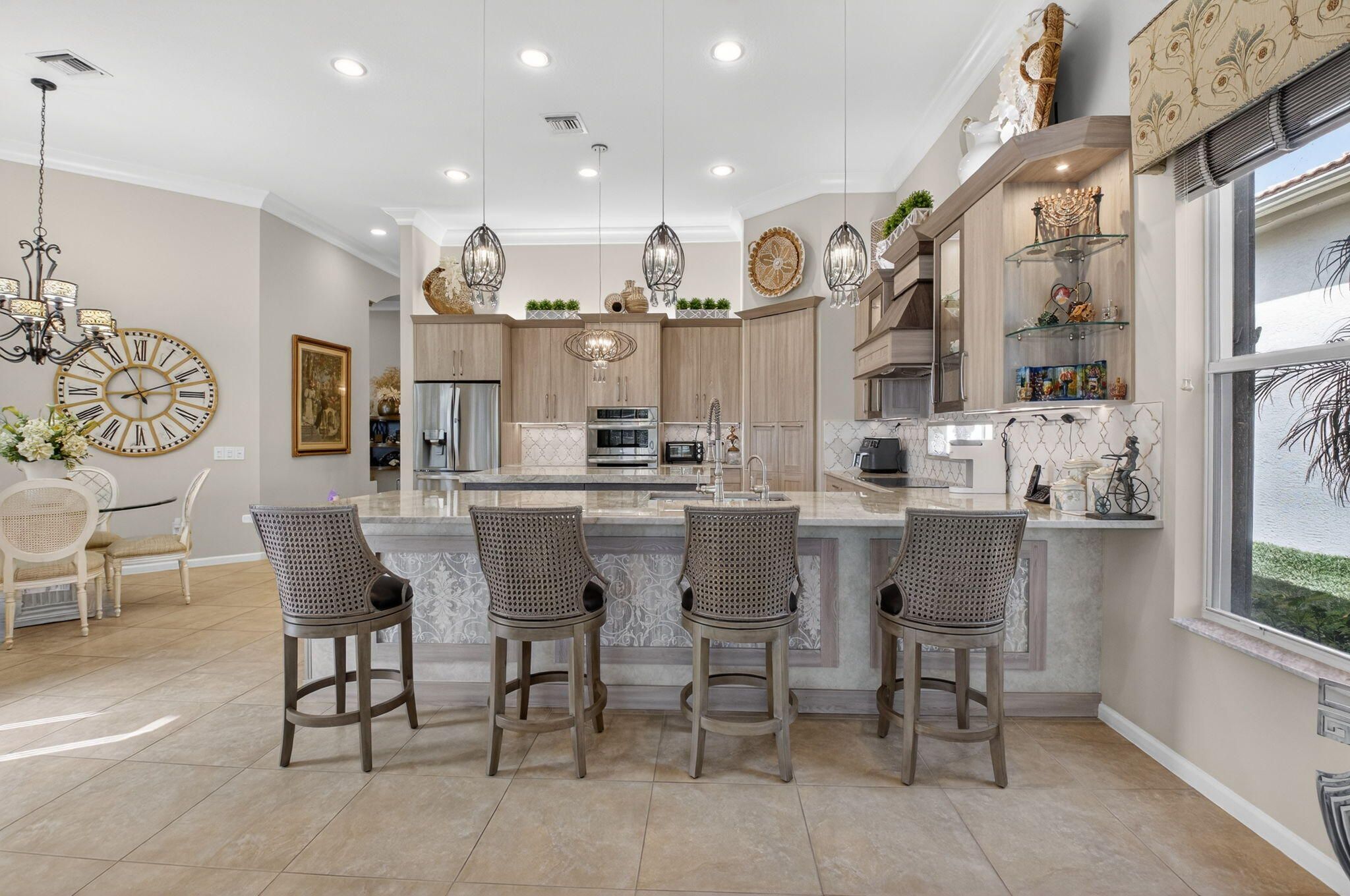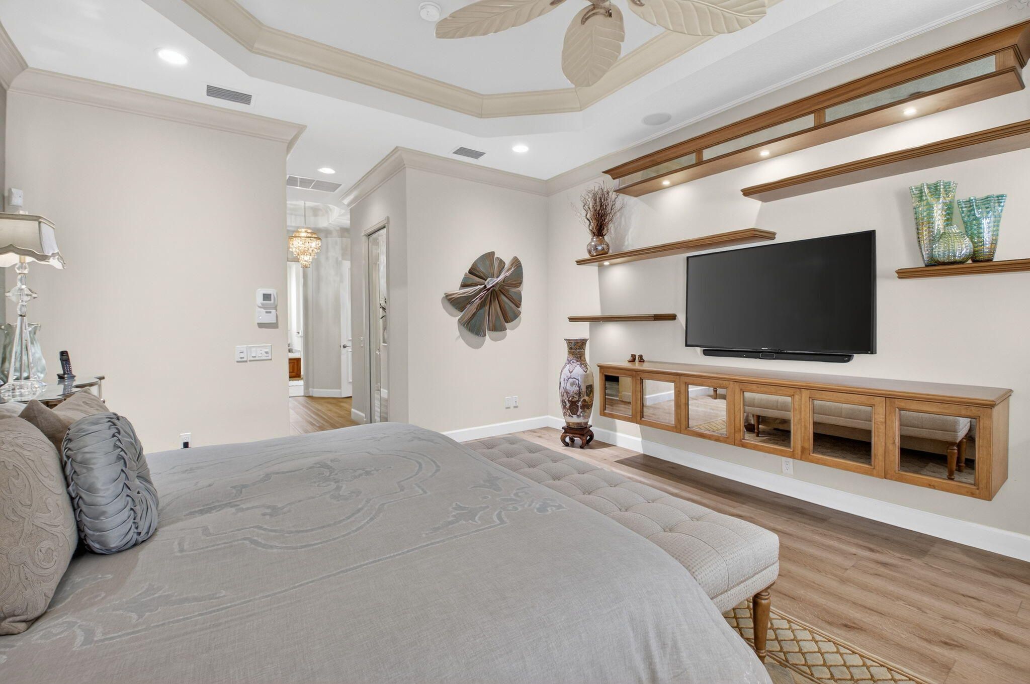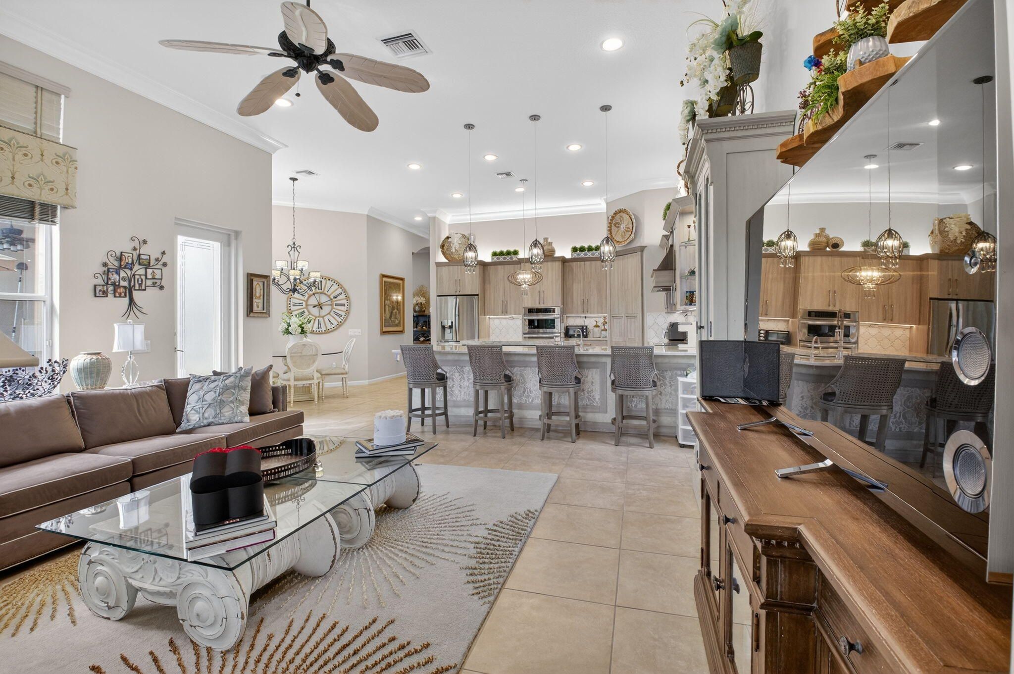 Experience luxury in this 3bdrm/3.1bath 3000sq' lakefront Imperial model home in the prestigious Royal Estates of Valencia Palms. This impeccably maintained home offers ultimate peace of mind with a brand-new 2025 roof and a full-house generator. The gourmet kitchen, renovated 3 years ago, features high-end cabinetry, pull-outs, top-of-the-line LG appliances with an induction cooktop. Enjoy a carpet-free interior with luxury vinyl and ceramic tile, complemented by plantation shutters and custom window treatments throughout. The primary suite boasts a renovated spa-like bath and custom-outfitted closets. Crown moldings, wainscotting throughout. Relax on the screened lanai with a stunning lake view. perfect for relaxing or entertaining.Every detail has been carefullyconsidered, more making this home truly move in ready.This is Florida living at its finest in a premier 55+ community with a 31,000 sq. ft. clubhouse and resort amenities.Valencia Palms has the best location close to beaches, restaurants and shopping.There is a gorgeous Clubhouse, Fitness Center,Resort Pools, Lap Pool, Resistance Pool, Billiard Room, Cafe', Social Events, Clubs,Shows, Grand Ball Rm. Pickleball, Tennis. Bocce Ball. Maintenance fee includes cafe card, Cable with all channels, internet, landline,ext. house painting,alarm,lawn/ tree care and so much more. Come enjoy the Valencia Palms Lifestyle. Buyer pays 1X capital contribution $5090. Maintenance fee $2520/quarter includes exterior house painting, lawncare, cable, internet, house phone, exterior pest control, power washing roofs and more.
