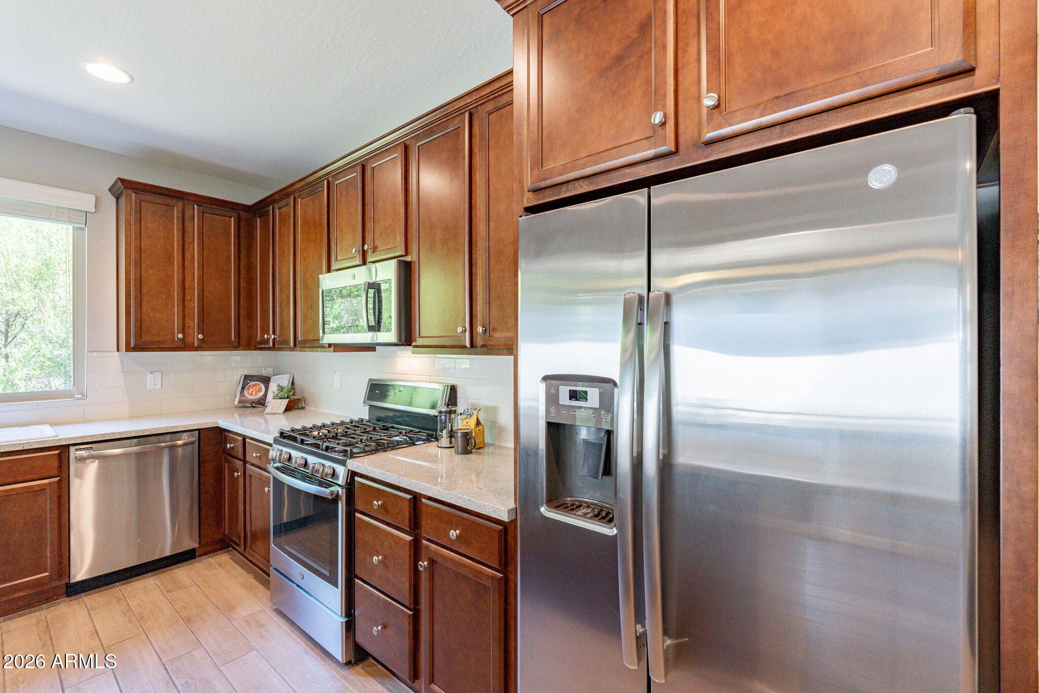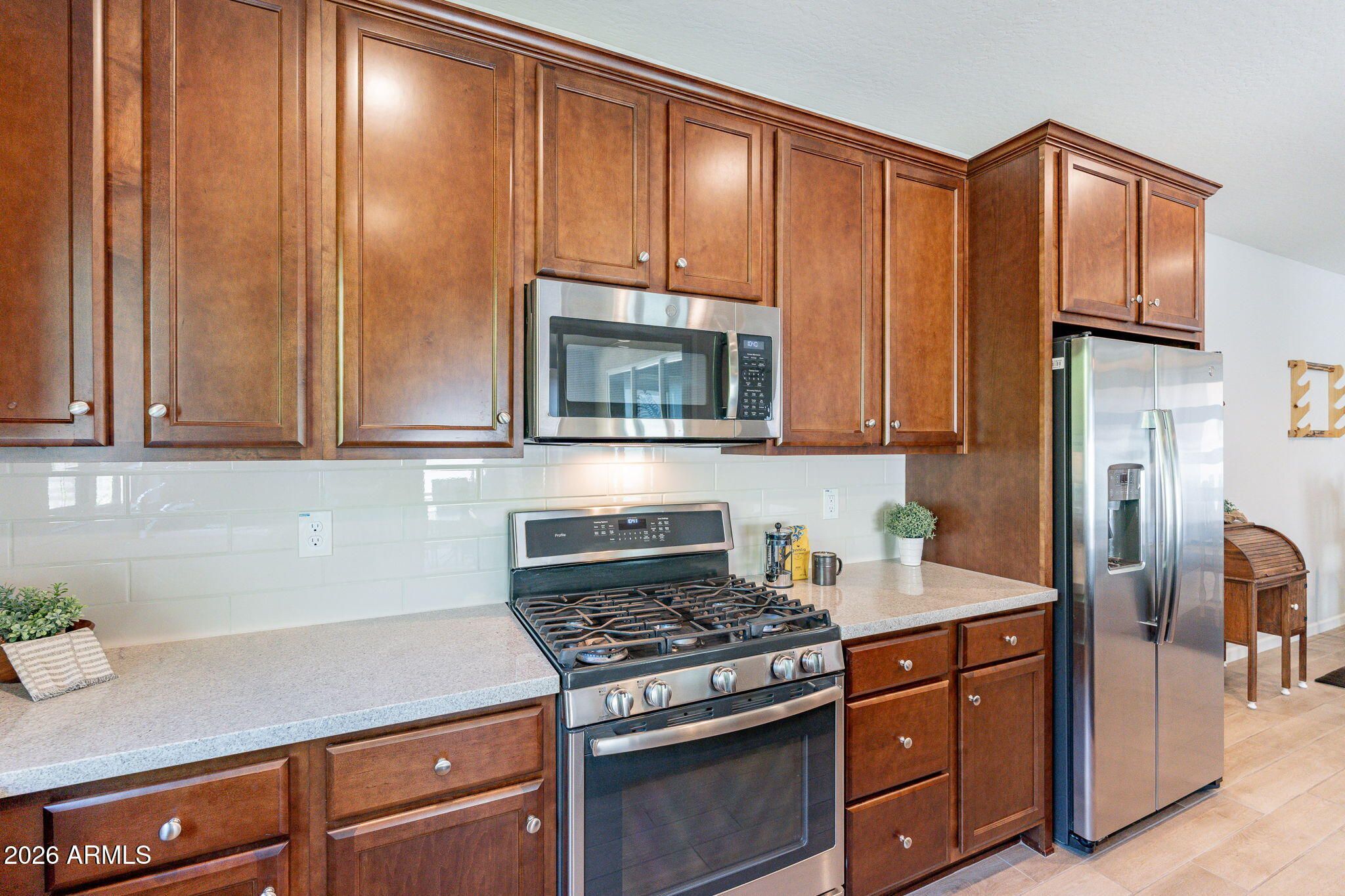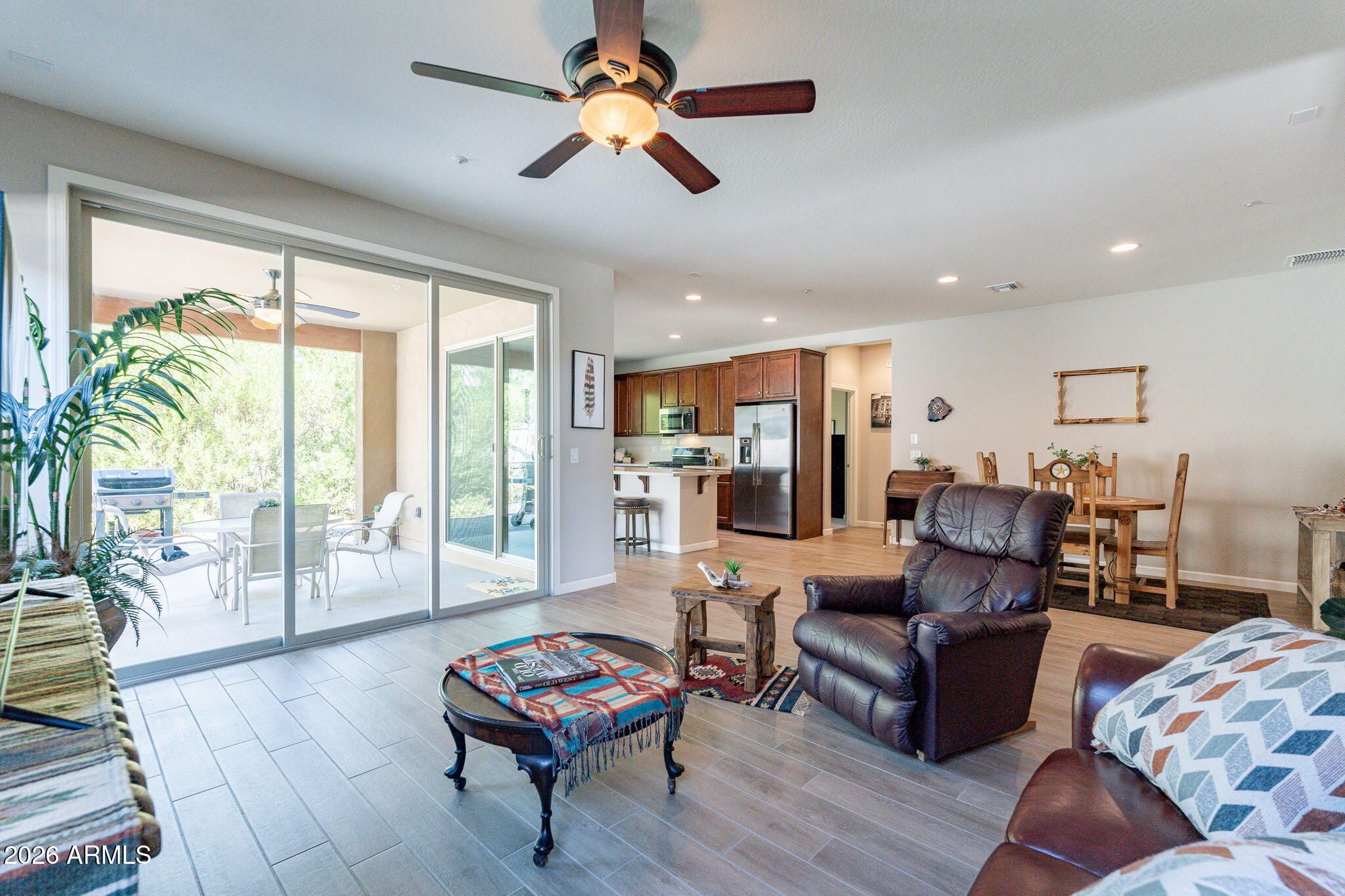 Welcome to this beautifully maintained home in the stunning, gated community of Trilogy at Vistancia. This popular Optic model offers 1,443 sq. ft. of open-concept living with 2 bedrooms, 2 bathrooms, a spacious great room, and dedicated dining area. As a former builder model, the home showcases plank tile flooring, oak cabinetry, granite countertops, a gas range, stainless steel appliances, and convenient pull-out drawers. The primary suite features granite countertops, a tiled backsplash, double vanity, and an oversized tiled shower with a built-in bench. Double and triple sliding glass doors open to a covered patio and low-maintenance backyard with a connected outdoor gas BBQ that conveys. Exterior painted 2026. HOA-maintains front yard for beautiful curb appeal with zero effort. TRILOGY AT VISTANCA is a resort style 55+ active adult community in NW Peoria. Trilogy has 2 beautiful clubhouses, 2 cafes, 2 outdoor heated pools, 1 heated indoor lap pool, 2 fitness centers, tennis courts, pickleball courts and bocce ball courts. Gary Panks designed 18 hole Championship Golf Course including V's Taproom. Trilogy at Vistancia also offers 3.5 miles of walking trails within the community. Trilogy offers numerous fitness classes, hosted lifestyle events/escorted trips and numerous lifestyle clubs ie: STEM Club, History Club, Women's Club, Veteran's Club, Wine Club, Hiking Club, Pickleball Club, Bocce Club & Car Club just to name a few.