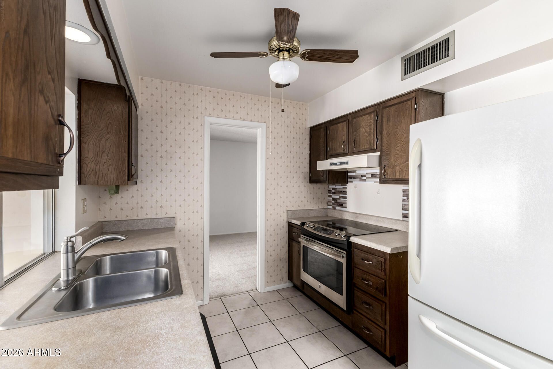 Charming move-in ready home in the heart of Sun City's 55+ community! This bright residence features new carpet flooring and an open living/dining area filled with natural light. The functional kitchen offers ample cabinetry and a stainless steel oven/range. Generous two bedrooms, a full bathroom, and abundant storage provide comfortable living, while the large enclosed Arizona room adds versatile year-round space. In-unit laundry with washer/dryer is included. Outside, enjoy a covered patio and a low-maintenance private outdoor area. Located near Sun City's renowned recreation centers, golf courses, pools, and activities.