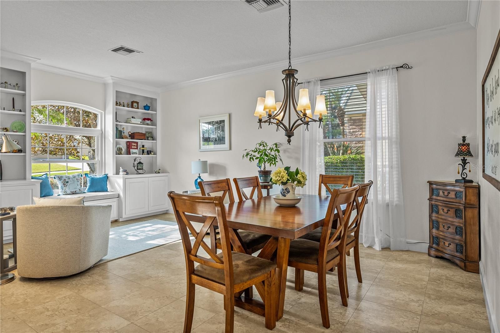 - Built-in Features, Ceiling Fan(s), Crown Molding, Eat-in Kitchen, High Ceilings, Kitchen/Family Room Combo, Living/Dining Room, Open Floorplan, Main Level Primary, Solid-Wood Cabinets, Split Bedrooms, Stone Counters, Walk-In Closet(s)