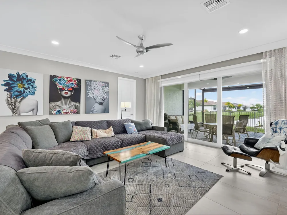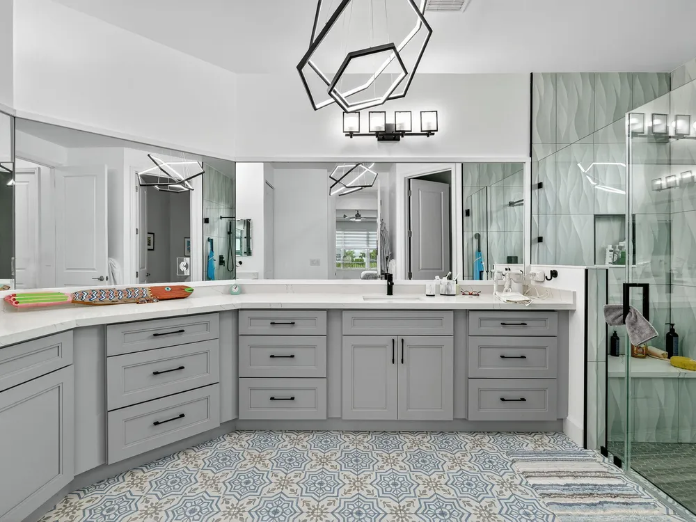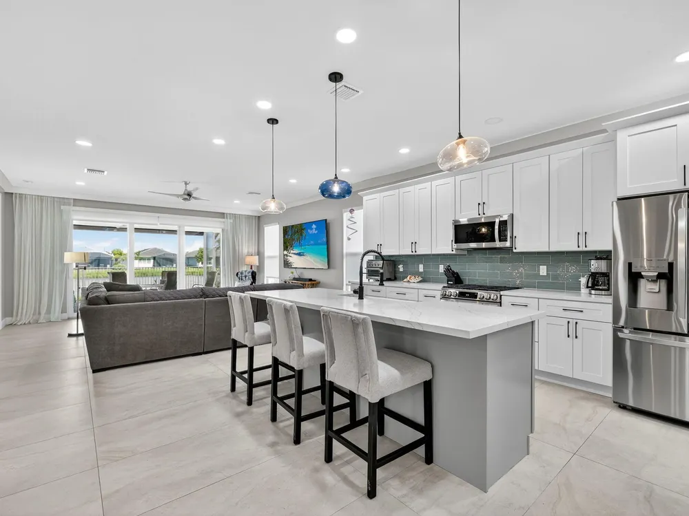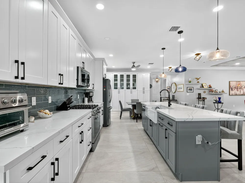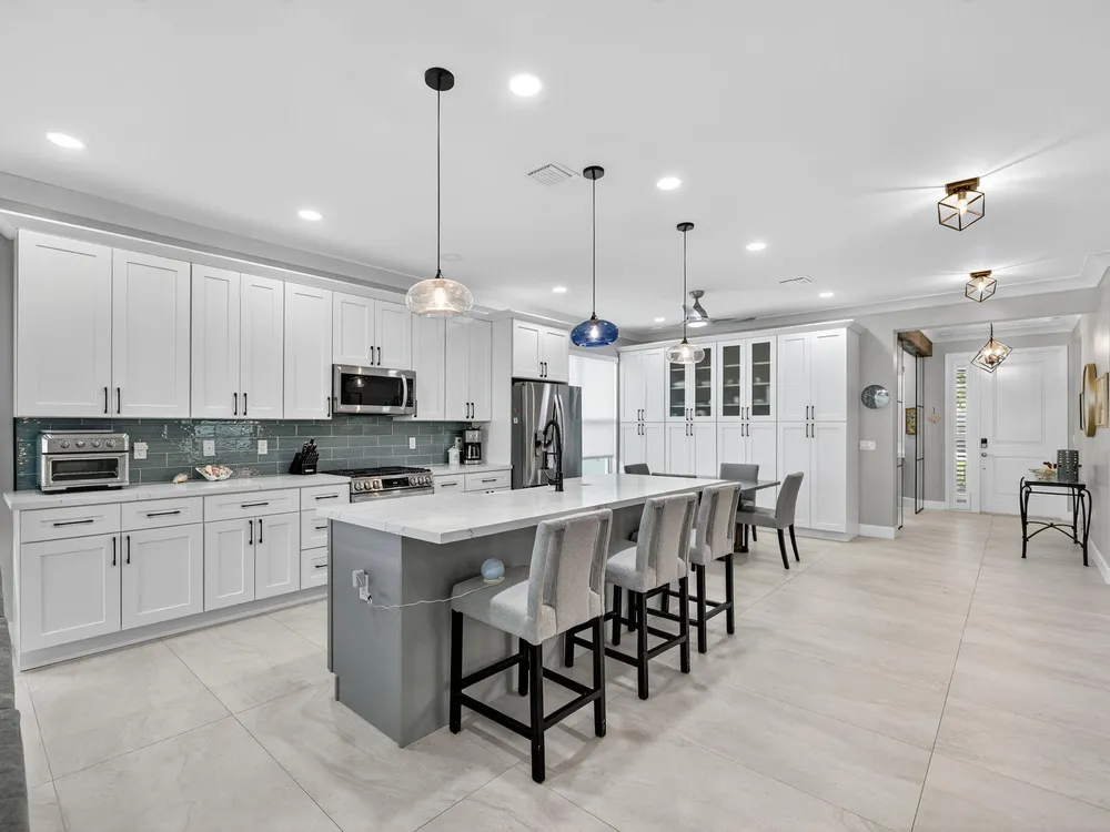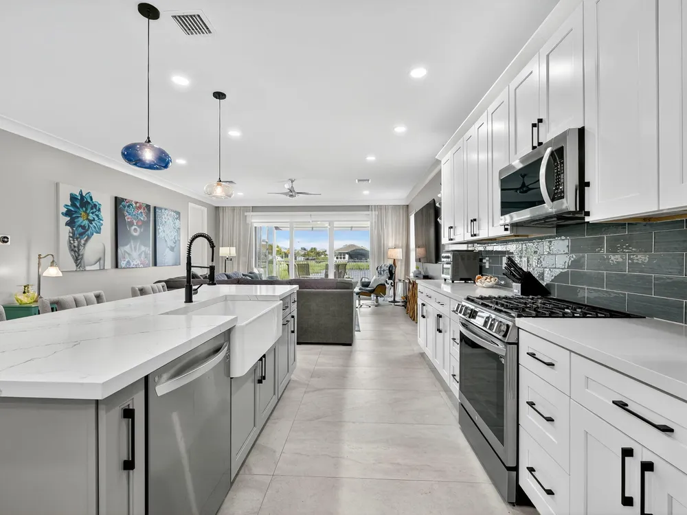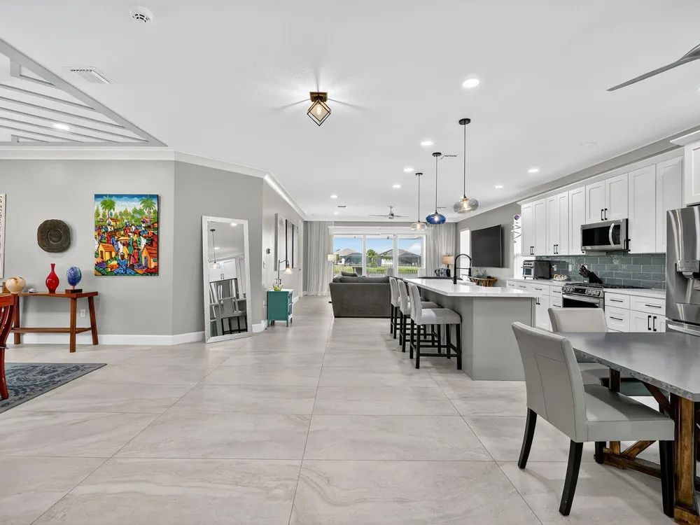 Welcome to GL's premier 55+ community of Valencia Grove at Riverland--where sophistication meets thoughtful design. Originally a Marsala model, this exceptional home has been custom reimagined and reconfigured by an architect to create a truly one-of-a-kind residence offering luxury, comfort, and functionality throughout its 2,127 square feet under air. From the moment you arrive, the widened driveway, sealed pavers, and refreshed landscaping make a striking first impression. Inside, every detail has been meticulously curated, featuring 24'' x 36'' porcelain tile flooring, crown molding, designer lighting, premium paint, and solar shades throughout. The chef's kitchen is a showpiece with custom cabinetry, a full pantry, pull-out shelving, a farmhouse-style island sink, high-end backsplash,