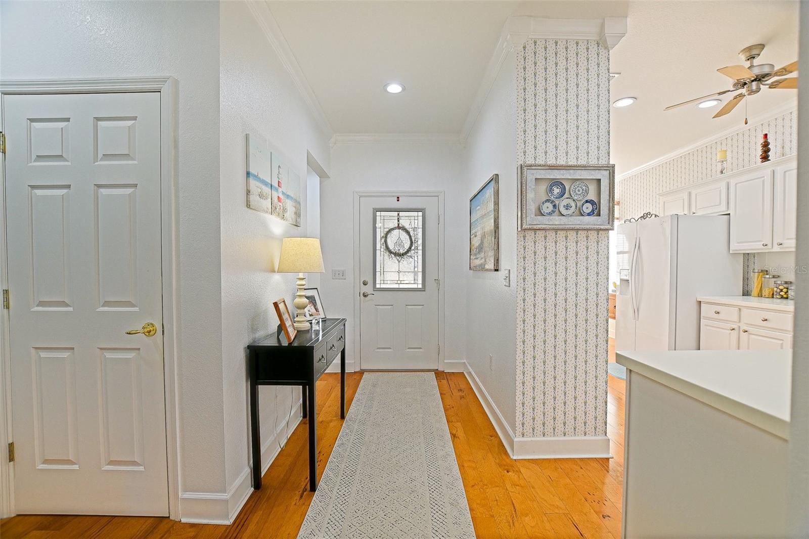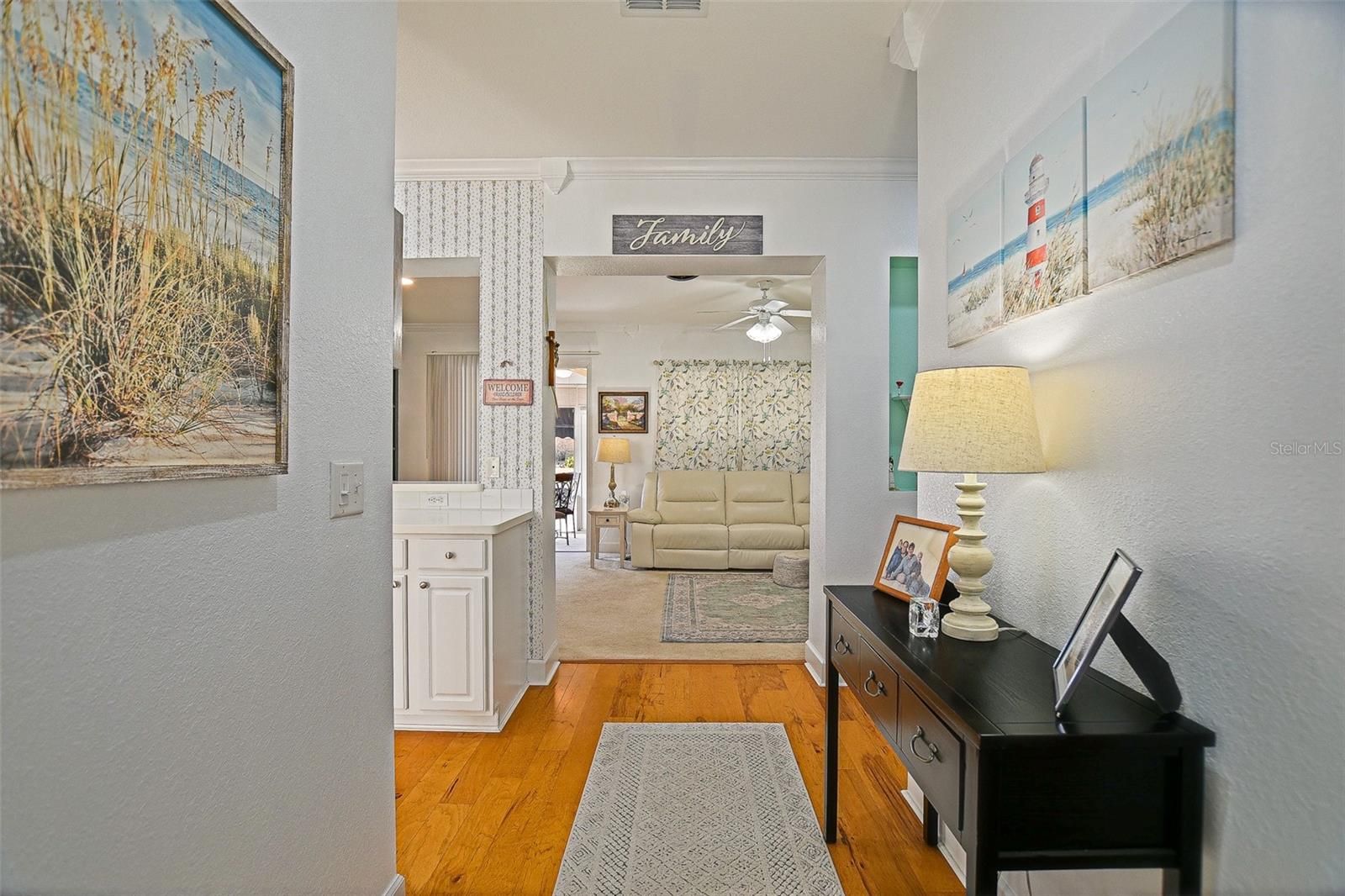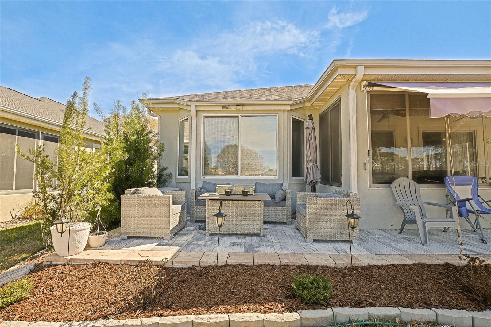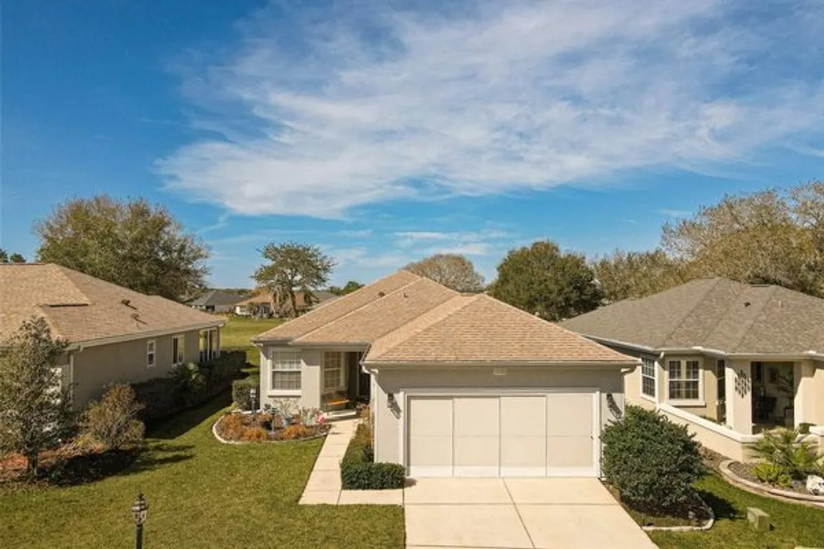 Stunning Golf course Patio Home-Former Model in Del Webb Spruce Creek Golf & Country Club! Beautifully maintained and ideally located on the 9th fairway of the Memorial Golf Course, this charming Kingston patio floor plan offers the perfect blend of comfort, updates, and scenic golf course living. Originally a Del Webb model home, this residence features 9-foot ceilings, mature landscaping, and thoughtful designer touches throughout. From the moment you arrive, the home showcases inviting curb appeal with mature landscape, and inviting front porch, and a screened garage door. Enter through the leaded glass front door and discover beautiful hickory hardwood flooring that flows throughout the hallway, kitchen, breakfast nook, and guest bathroom. The bright kitchen features white cabinetry, Carian countertops, new LED lighting, and a breakfast bar that overlooks the open living area, creating a comfortable space for everyday living and entertaining. The breakfast nook with charming wainscoting offers the perfect spot for casual dining. The primary suite includes elegant designer details, a bow window, crown molding, and peaceful golf course views. Both bathrooms are spacious, and the entire home features crown molding and 6 inch baseboards, adding a refined touch throughout. Step outside to the lania for added living space and additional views with glass windows. Enjoy the Florida lifestyle with breathtaking golf course views from the outdoor patio-perfect for relaxing and enjoying sunsets over the fairway, the retractable awnings allow all day use of this outdoor space. Recent updated and features include: Roof (2014), water heater (2023), LED lighting throughout, New faucets, new toilets with bidets, shower head, new shower door in primary bath with grab bar, water softener, garage sink, extra refrigerator, and portable generator. This home is available turnkey, making it a fantastic opportunity for a seasonal or full-time residence. Additionally, included is the golf cart with a rebuilt motor (approximately 3 years ago). All of this at a great value, don't miss your opportunity to own a piece of tranquility!