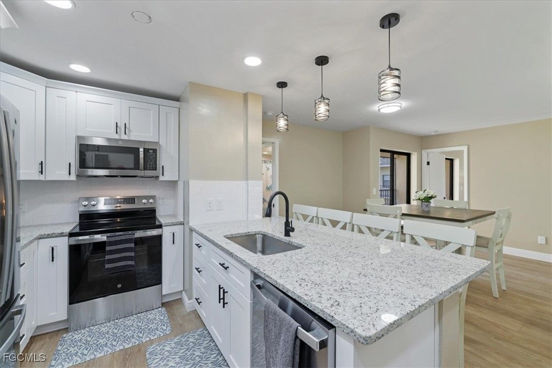 Here's your chance to scoop up the MOST BEAUTIFUL & MODERN condo in Cross Creek Country Club with BUNDLED GOLF! This 2+DEN/2 bath condo was FULLY REMODELED with neutral wood-look WIDE PLANK LVP flowing seamlessly from room to room with high baseboards. The OPENED KITCHEN is a chef and entertainer's dream with white shaker cabinets, STAINLESS STEEL APPLIANCES, a large single basin sink, updated lighting, black accents, GRANITE, and a stunning black stack W/D set. The spacious primary offers a WALK-IN CLOSET, access to the balcony, and a gorgeous bath with a WALK-IN SHOWER. The SECOND SUITE is just as lovely but provides a tub/shower combo, perfect for a soak or bathing little ones and pets. The DEN with pocket doors is a truly FLEXIBLE SPACE that can be used as a guest room, playroom, office, craft room, and more. The LARGE TILED & SCREENED BALCONY is quiet, private, nestled in the canopy of the palms, and offers NE views of lush, green landscape. You can relax and unwind at 1 of 2 community pools or enjoy one of the many sports courts in the community: tennis, pickleball, and bocce! Whether you're a seasoned pro or just starting out, this condo offers the perfect opportunity to perfect your swing and enjoy the great outdoors. With its prime location off Daniel's Pkwy, you'll have easy access to shopping, dining, entertainment, RSW International Airport, 2 Spring Training Stadiums, and the pristine beaches of SWFL. Whether you're looking for a permanent residence, a vacation home, or an investment property, this condo has it all. With its inclusions, amenities, PRIME LOCATION, LOW TAXES and LOW HOA FEES, this home qualifies as a "BEST VALUE BUY," and you'll have everything you need to live the Florida lifestyle to the fullest!