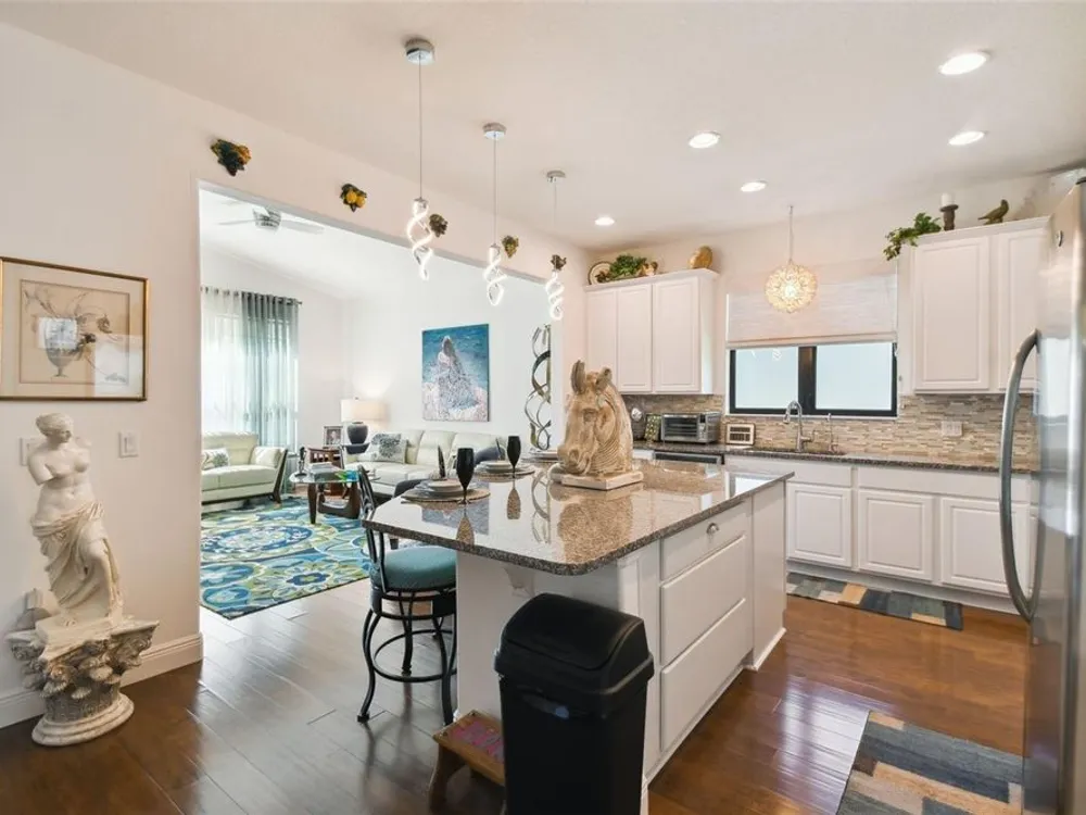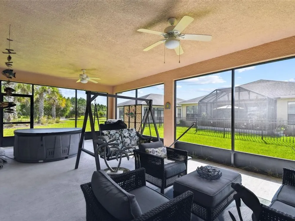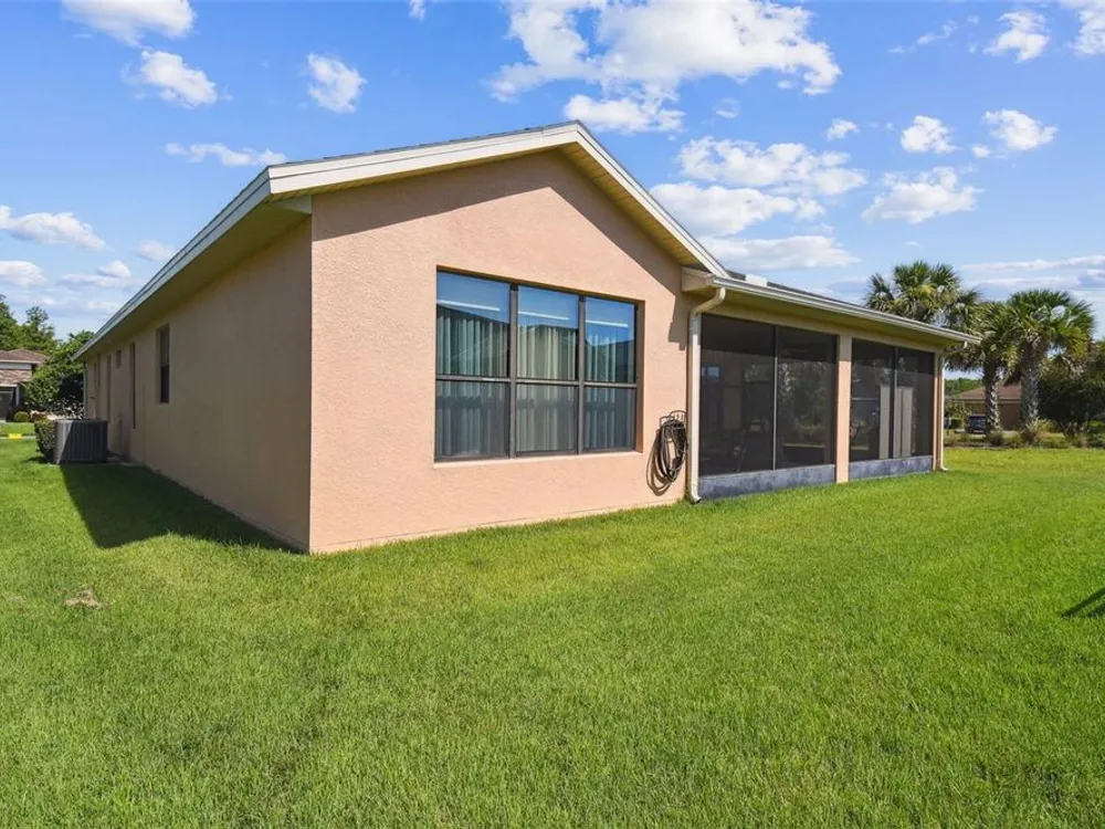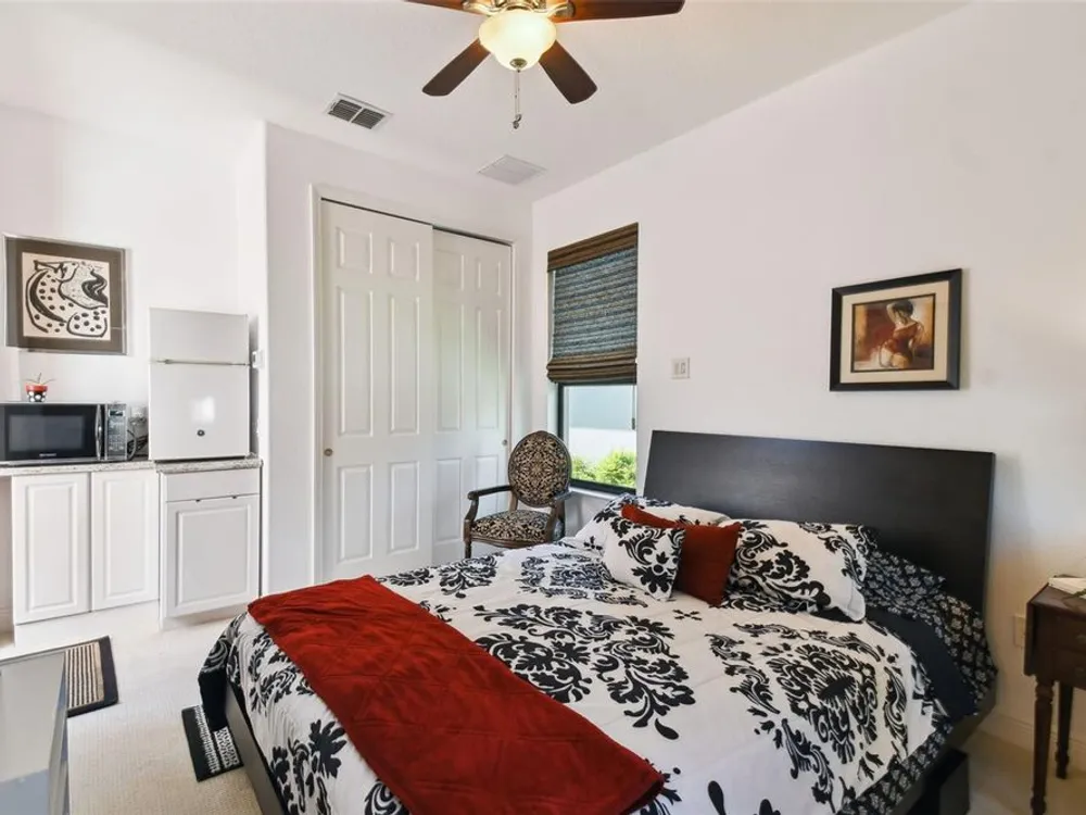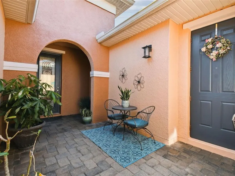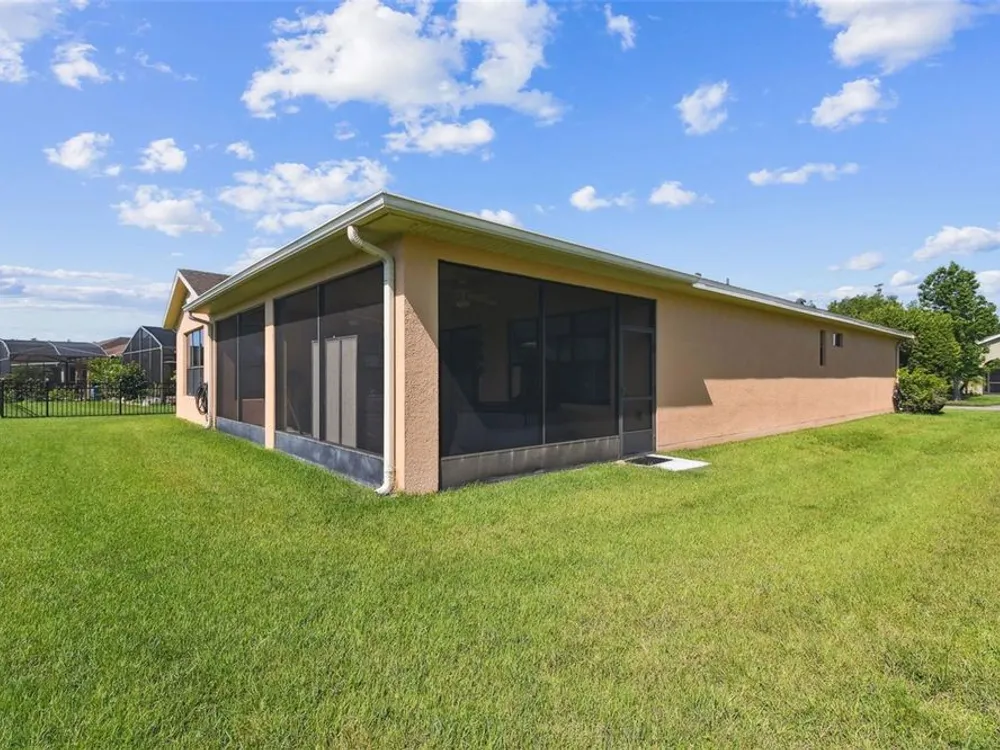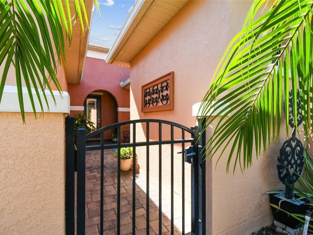 Welcome to this sought-after 2013 St. Augustine model, featuring 3 bedrooms, 3 bathrooms, a den/study, and a private casita/in-law suite—perfect for multi-generational living or hosting guests in style. Nestled on an extra-wide, custom-landscaped lot close to the Palms Resort Amenities Center, this home offers the perfect blend of privacy, comfort, and resort-style living. Enter through a charming gated courtyard and step inside through a leaded glass front door into spacious open-concept living areas. The chef’s kitchen features granite countertops, an eat-at bar, and abundant cabinet and counter space—ideal for cooking and entertaining. The large primary suite boasts a generous walk-in closet and a luxurious en-suite bath with granite counters and a walk-in shower with built-in seat. A second bedroom is tucked away on the opposite side of the home for privacy, adjacent to a full guest bathroom. The separate casita offers its own private entrance from the courtyard and includes a kitchenette, full bathroom with walk-in shower, and plenty of space—making it an ideal guest suite or private home office. Enjoy the flexibility of a dedicated den/study, and unwind in the screened, covered lanai complete with an included hot tub—the perfect spot to relax after a long day. Additional features include: 2-car garage with dedicated golf cart charging. Whole-house water filtration system and New HVAC system (2019). This thoughtfully designed home offers both luxury and practicality in one of the area's most desirable quiet neighborhoods. This beautiful home combines comfort, functionality, and a premier location. Solivita is renowned for its vibrant 55+ community, offering an array of activities and amenities tailored to active adults. Whether you’re enjoying a round of golf, engaging in fitness classes, or simply strolling along scenic walking paths, this neighborhood promotes an active and fulfilling lifestyle with over 230 clubs, sports, and activities to choose from. Enjoy the community’s clubhouse, softball field, 14 swimming pools, an indoor walking track and indoor pool, and much more. Every day offers something new to explore and enjoy! This home also features easy access to nearby shops, dining, and health care, offering the perfect balance of privacy and lifestyle.Don't miss out! Schedule your private showing today!