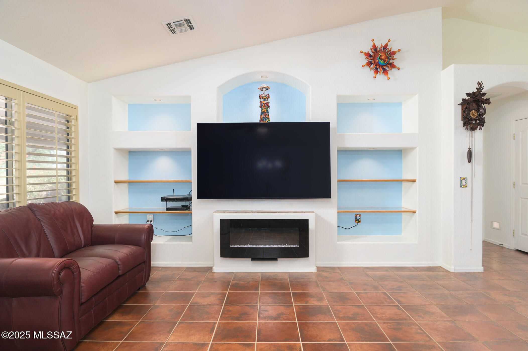 Owned Solar! A majestic old Saguaro cactus stands proudly, complemented by crisp desert landscaping, multi-level Mediterranean-style rooflines, a striking rock facade, and a beautiful front courtyard sets the tone for this special home. Step inside to a spacious great room featuring a vaulted ceiling, warm Southwest tile flooring, a lighted media center, and a sleek contemporary fireplace--perfect for cozy evenings and entertaining. The chef's kitchen is a true highlight, boasting multi-tone granite countertops, stainless steel appliances including a gas range, an undercounter sink with gooseneck fixture, a prep island, and a breakfast nook overlooking the courtyard. A versatile den or office is accessed through double French doors, offering privacy and flexibility.