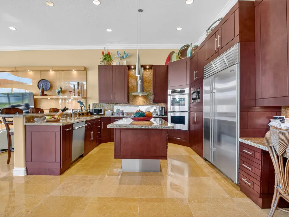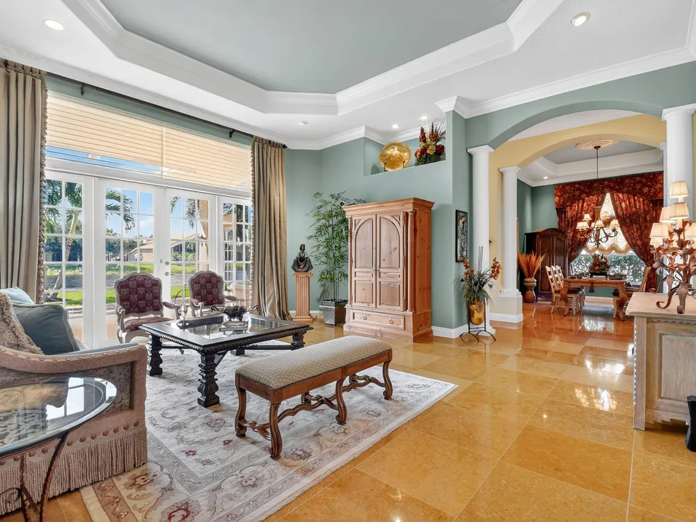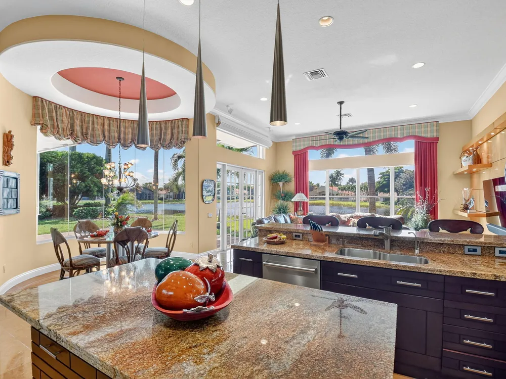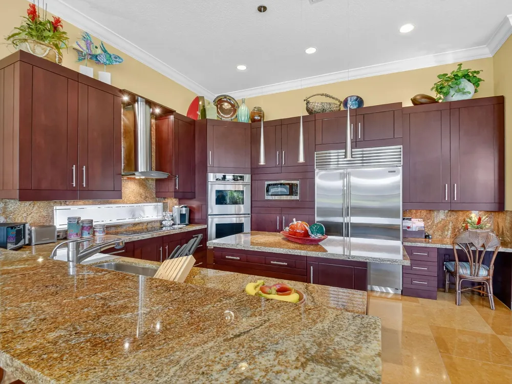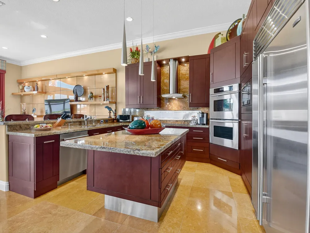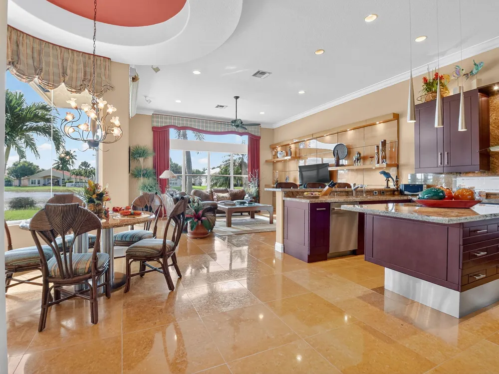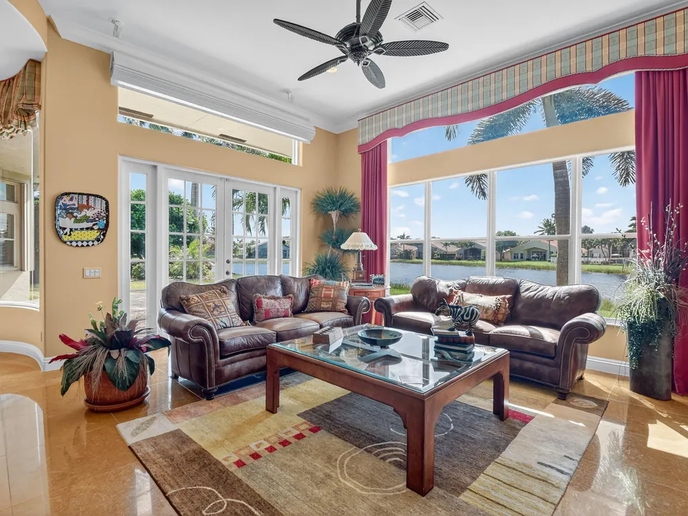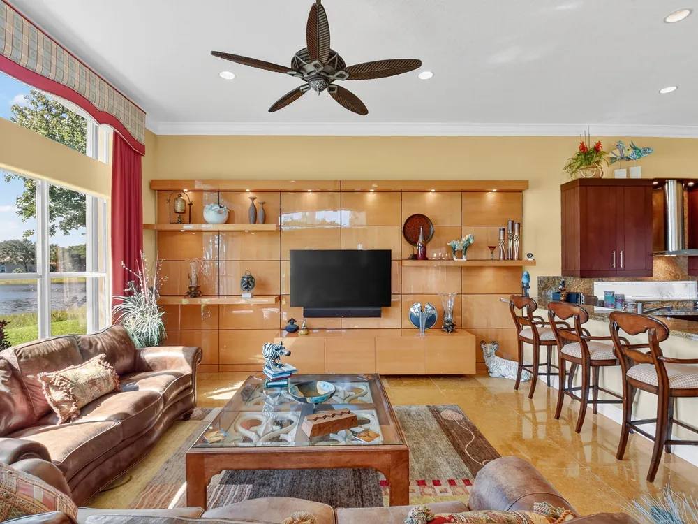 Stunning & Oversized Lakefront 4BR/4BA/3Garage home. This sprawling 3206 liv sqft ranch triple split home has impressive upgrades including rich 24'' marble floors in main living areas, wood cabinets & stone counters throughout & solid core doors. One-of-a-kind Columbian Mahogany Kitchen with 54'' cabinets, soft-close drawers, Thermador double oven, Sub Zero frig, Dacor Stove. Primary oversized bedroom has built-out walk-in closets, Elegant light fixtures throughout.-French doors lead to oversized patio on the lake. Excellent for Entertaining. Magnificent Wall Unit in Family Rm. Walk to Multi-Million Clubhouse. Maintenance includes: Internet, lawn, exterior paint, SHO, HBO & alarm. 1X cap fee $5,090.00. 4th bedrm used as den. Buyer/Buyers agent to verify all information.