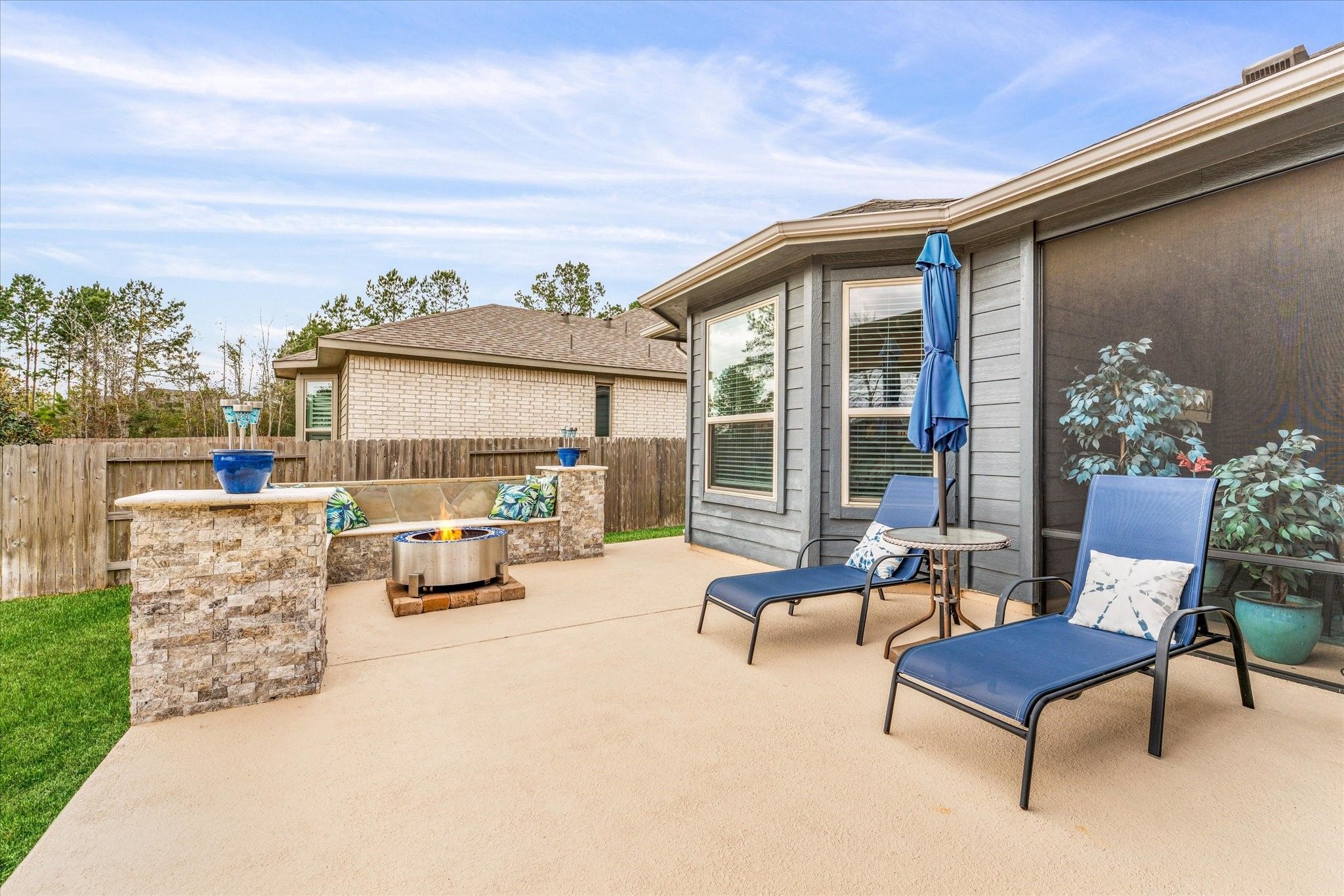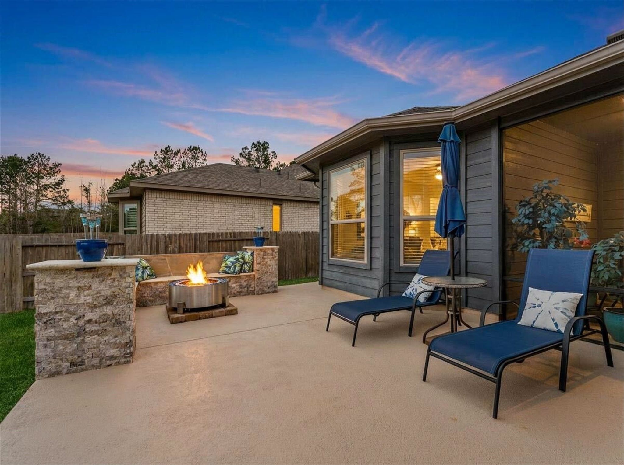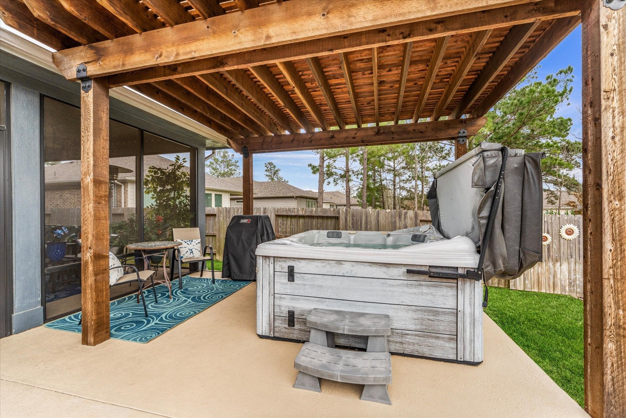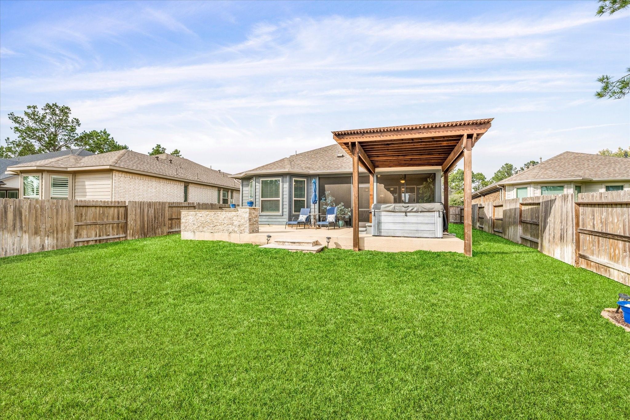 Nestled within the forest landscape of the highly sought-after Woodforest master-planned golf course community, this charming one-story home offers the perfect blend of elegance, efficiency, and vibrant 55+ living in Bonterra. Situated on an oversized premium lot, this home is truly an entertainer’s dream. Open concept living! Enjoy evenings under your custom pergola-covered patio, relax in the hot tub, or gather around the firepit with friends and neighbors.Bonterra offers state-of-the-art amenities and an active adult lifestyle. Just minutes from your doorstep, enjoy the beautiful clubhouse with patio gathering areas, pickleball and bocce courts, horseshoes, and a resort-style pool. As a resident, you also have full access to Woodforest’s incredible amenities, including tennis courts, a fitness center, miles of scenic trails, parks, basketball courts, and more — all surrounded by the beauty of nature and a premier golf course setting.