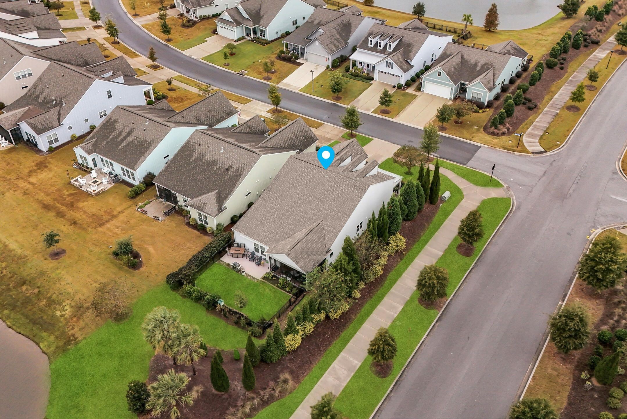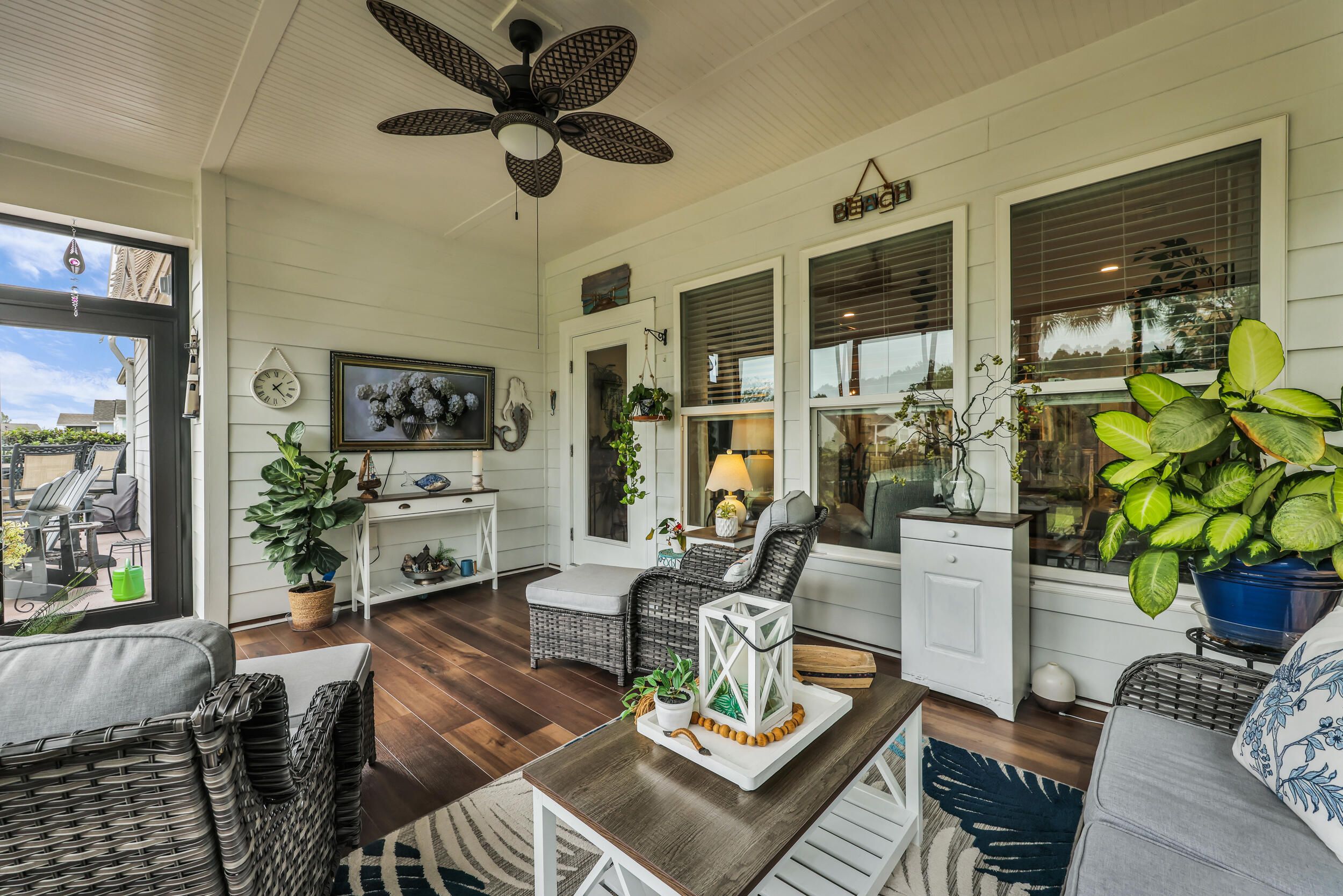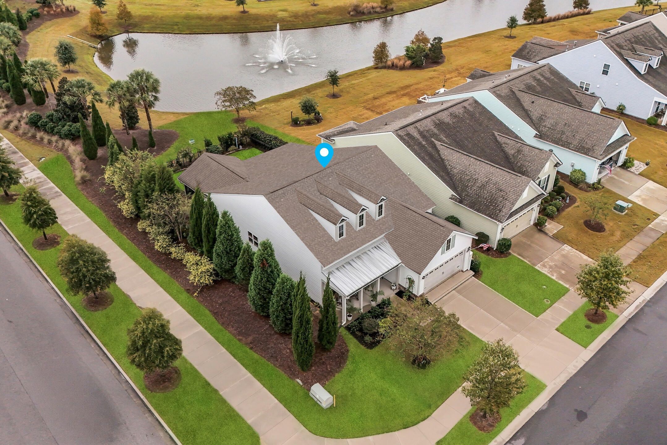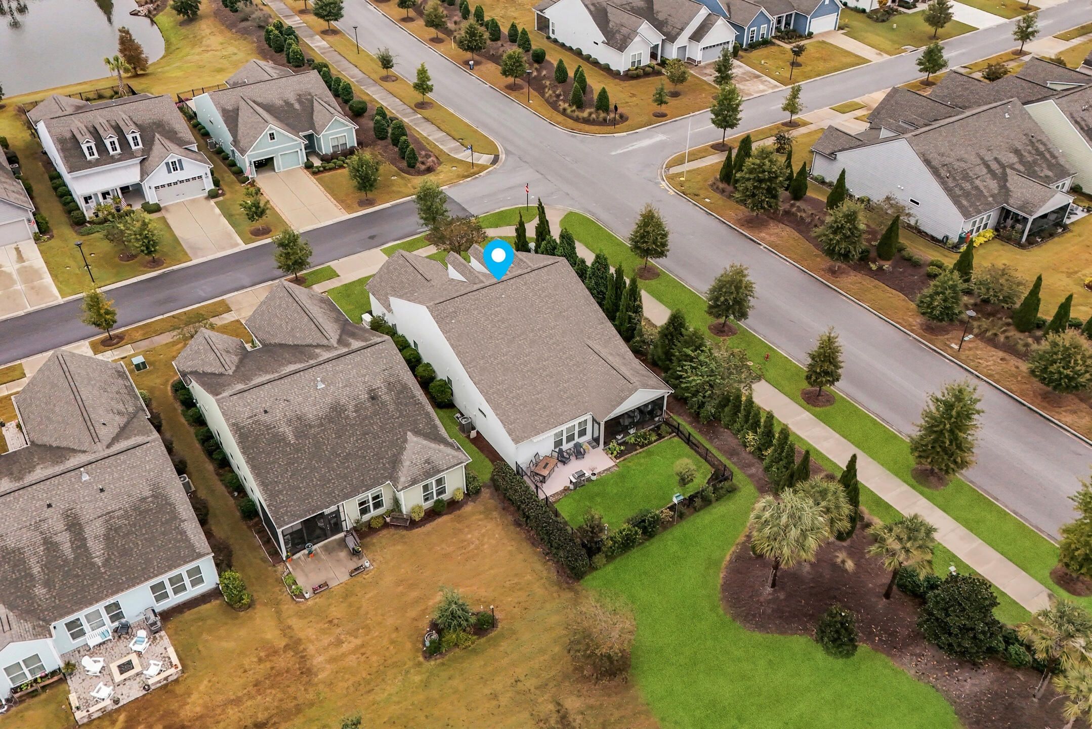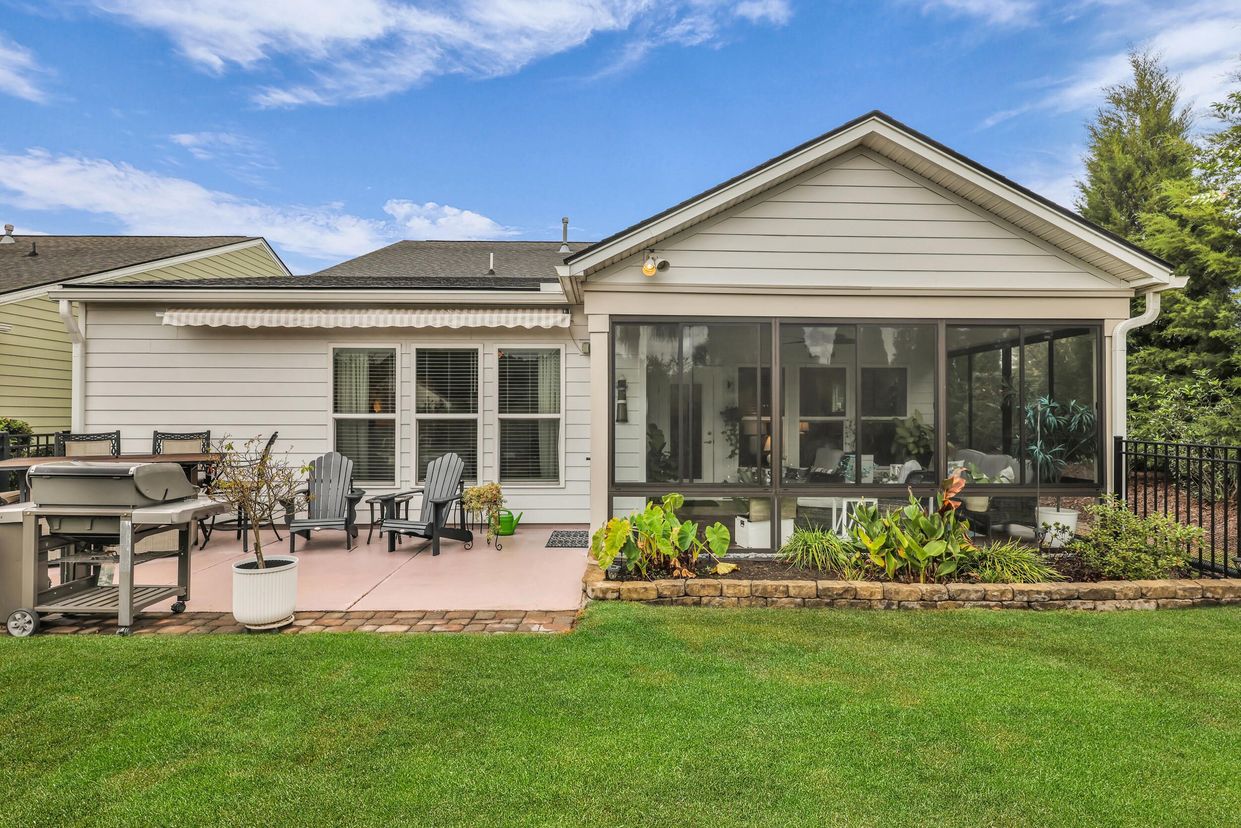 This highly sought after Martin Ray floor plan in Nexton's Del Webb active adult community offers resort style living at its finest. Beautifully finished and move in ready, this home stands out with its incredible backyard oasis and thoughtful upgrades throughout. The glass enclosed lanai feels like bonus living space, bright and airy, and ideal for enjoying cool mornings or gorgeous evening sunsets. Overlooking a tranquil pond with a fountain, the backyard offers unmatched privacy thanks to its corner lot setting and lush landscaping with palms, stone edging, and an extended patio. Whether relaxing under the remote controlled patio awning or inside the lanai with easy open windows, this space perfectly blends indoor comfort with outdoor beauty. Inside, you will find three bedrooms plus an office and a spacious, light filled living area featuring a built in bookcase with an electric fireplace. The gourmet kitchen includes granite countertops, a five burner gas cooktop, a butler's pantry, soft close drawers, and pull out shelving. The owner's suite impresses with a tray ceiling, custom accent wall, and a large walk in closet. The owner's bath features double sinks and a tiled walk in shower. Additional highlights include brand new waterproof LVP flooring, a Generac whole house generator, a tankless water heater, a GE water softener, a storm door, a utility sink, and a walk up attic with easy access storage. Del Webb offers resort style amenities including an indoor and outdoor pool, tennis and pickleball courts, a state of the art fitness center, and a clubhouse with gathering spaces and activities for every interest. This one of a kind home combines privacy, upgrades, and an unbeatable location. It is truly a rare opportunity that will not last long.