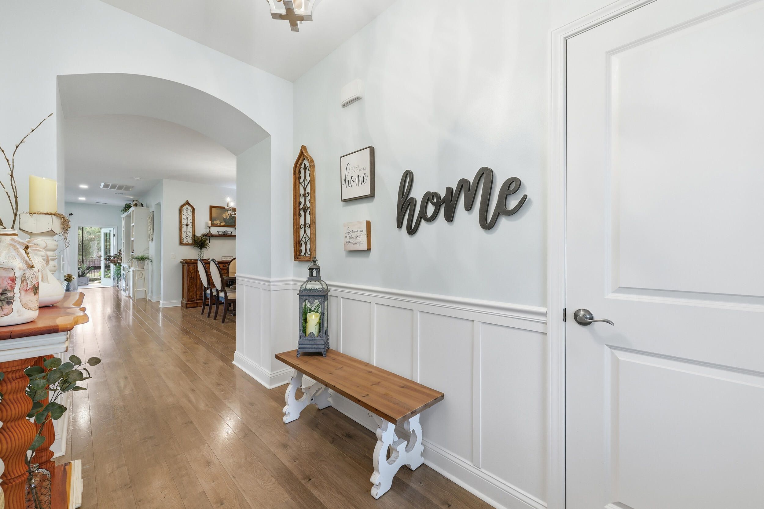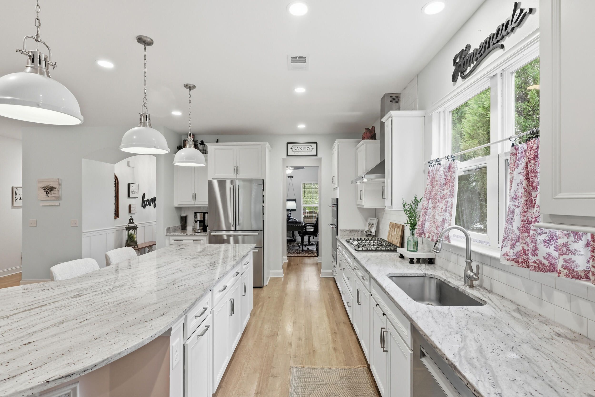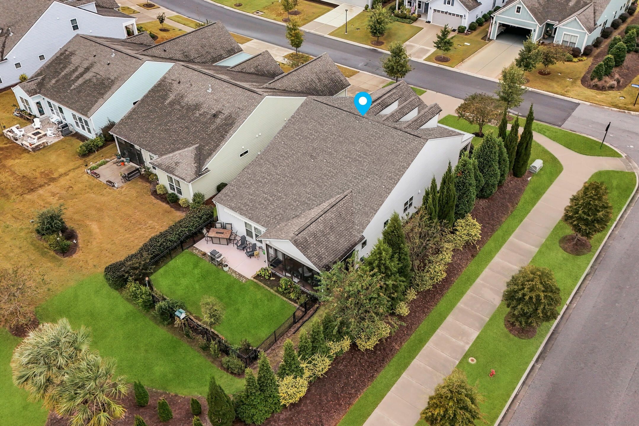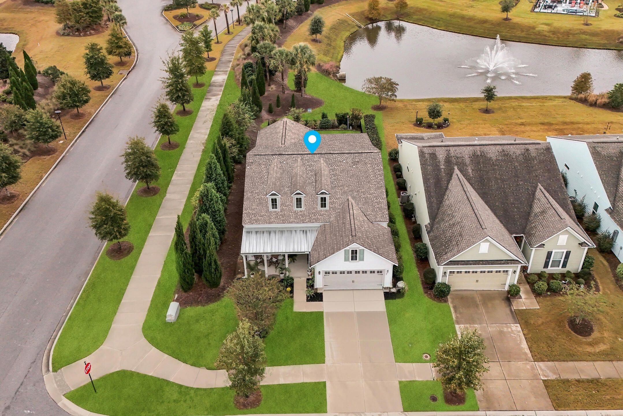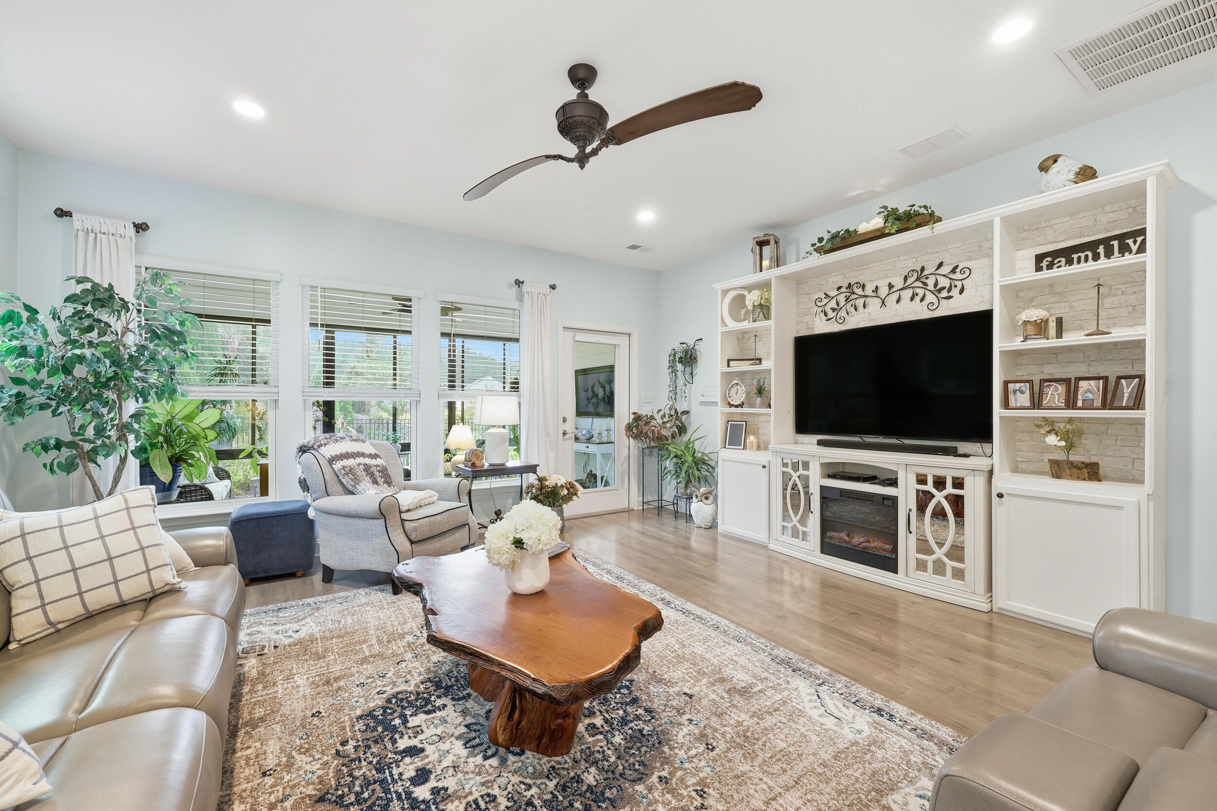 This highly sought after Martin Ray floor plan in Nexton's Del Webb active adult community offers resort style living at its finest. Beautifully finished and move in ready, this home stands out with its incredible backyard oasis and thoughtful upgrades throughout. The glass enclosed lanai feels like bonus living space, bright and airy, and ideal for enjoying cool mornings or gorgeous evening sunsets. Overlooking a tranquil pond with a fountain, the backyard offers unmatched privacy thanks to its corner lot setting and lush landscaping with palms, stone edging, and an extended patio. Whether relaxing under the remote controlled patio awning or inside the lanai with easy open windows, this space perfectly blends indoor comfort with outdoor beauty. Inside, you will find three bedrooms plus an office and a spacious, light filled living area featuring a built in bookcase with an electric fireplace. The gourmet kitchen includes granite countertops, a five burner gas cooktop, a butler's pantry, soft close drawers, and pull out shelving. The owner's suite impresses with a tray ceiling, custom accent wall, and a large walk in closet. The owner's bath features double sinks and a tiled walk in shower. Additional highlights include brand new waterproof LVP flooring, a Generac whole house generator, a tankless water heater, a GE water softener, a storm door, a utility sink, and a walk up attic with easy access storage. Del Webb offers resort style amenities including an indoor and outdoor pool, tennis and pickleball courts, a state of the art fitness center, and a clubhouse with gathering spaces and activities for every interest. This one of a kind home combines privacy, upgrades, and an unbeatable location. It is truly a rare opportunity that will not last long.