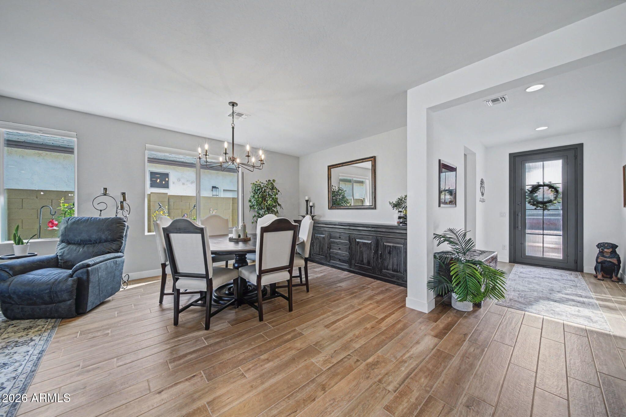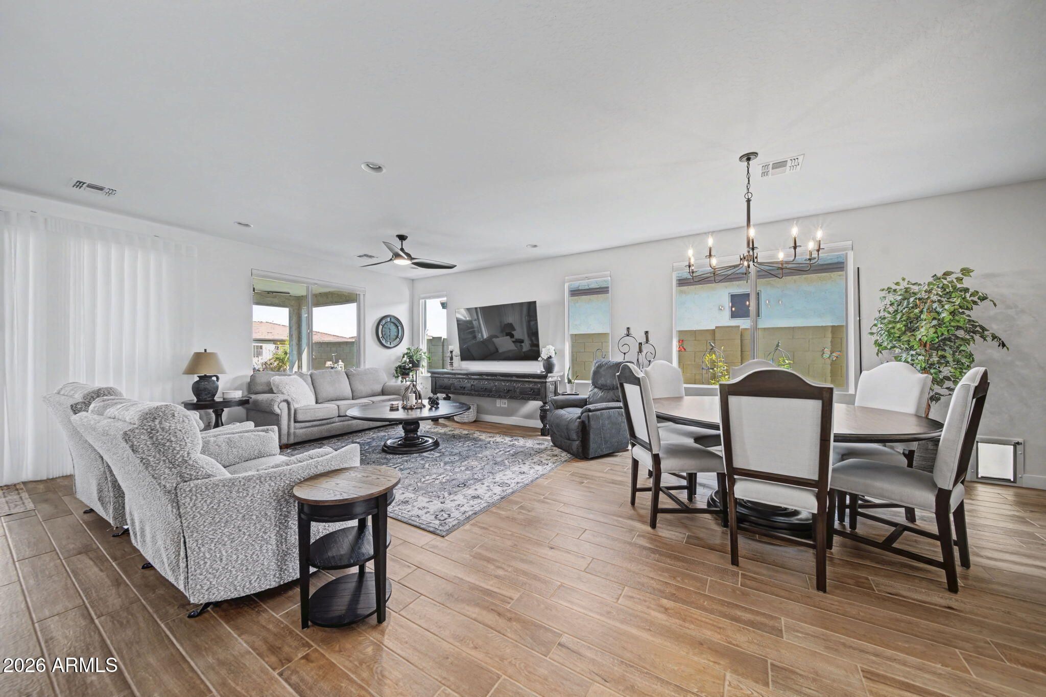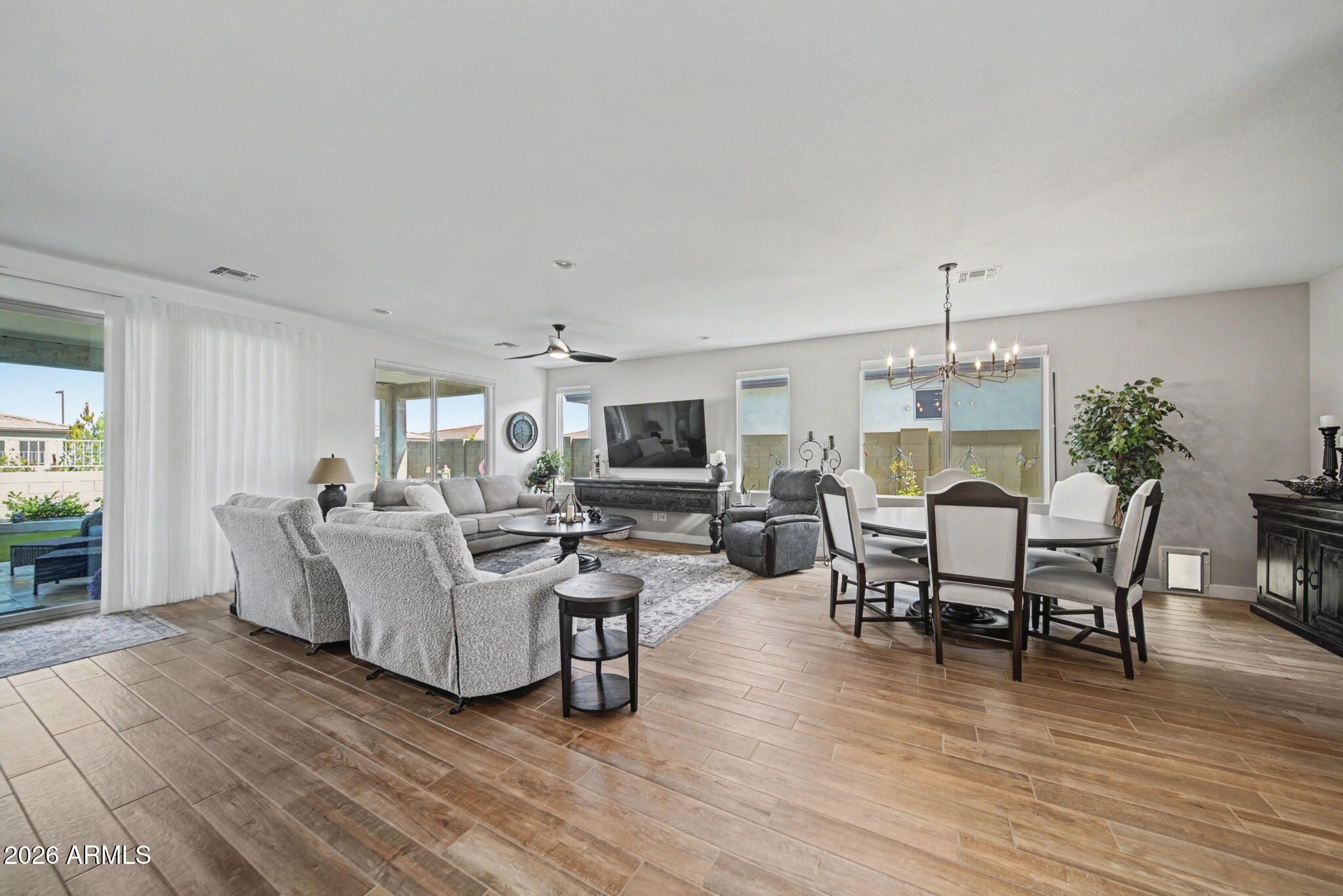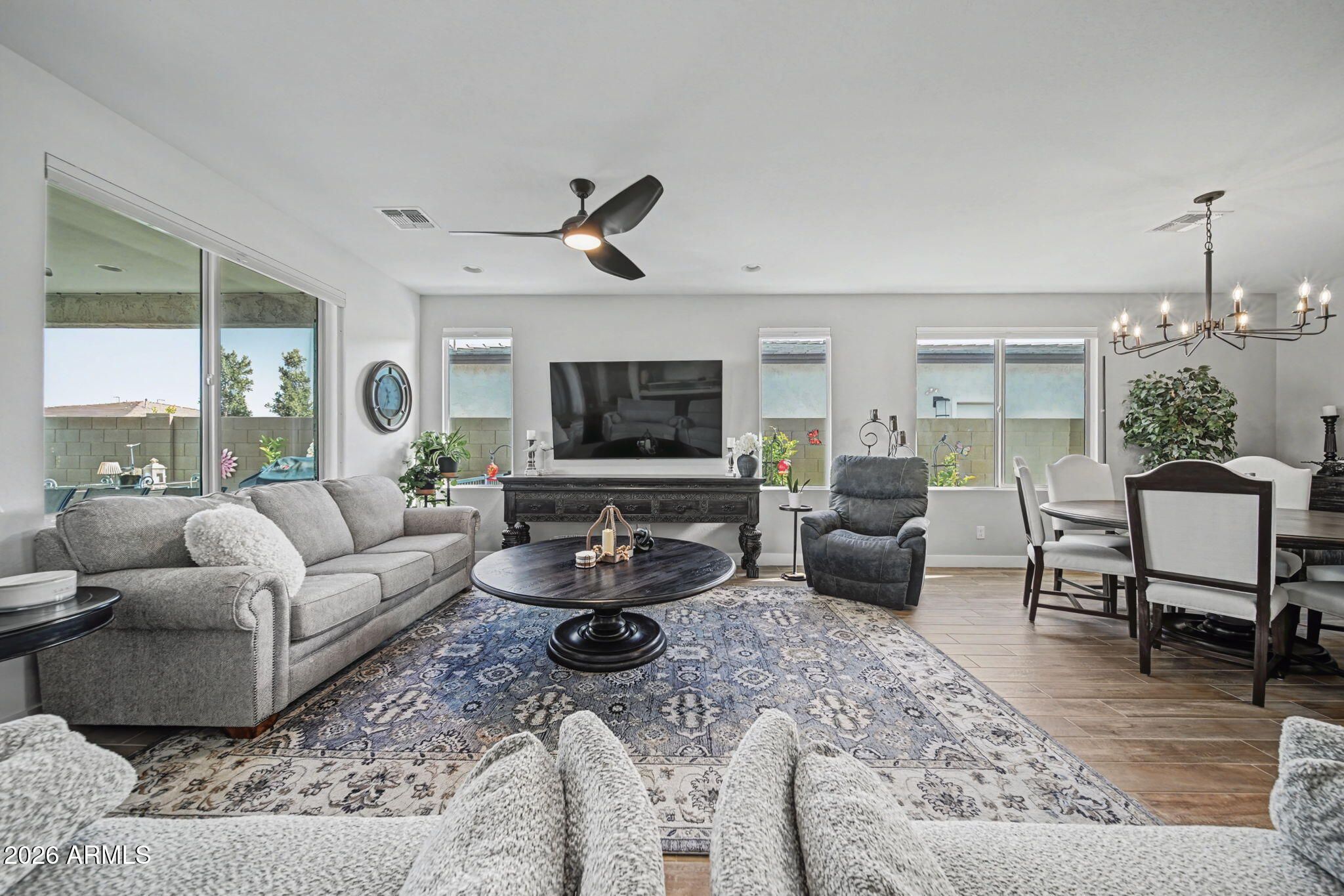 Built in 2024, this thoughtfully designed 2-bedroom plus den home is located in the gated Ovation at Meridian community in Queen Creek. The open-concept great room brings the kitchen and dining space together, creating an inviting layout for everyday living and entertaining. The kitchen features quartz countertops, stainless steel appliances, a center island, gas cooktop, and a large walk-in pantry. A dedicated den provides flexible space for an office or hobby room. The primary suite includes a spacious walk-in closet, walk-in shower, and dual-sink vanity. Window treatments throughout include a combination of shutters and blinds, offering added comfort and privacy from day one. Step outside to a beautifully finished backyard with a north-facing covered patio, built-in fountain, and a fenced side yard with doggie door, allowing you to enjoy outdoor living without additional projects. A 2.5-car garage provides room for storage or workspace. Community amenities include a clubhouse, resort-style pool and spa, fitness center, pickleball and tennis courts, and walking paths. Approximately 5 minutes to dining and shopping, including the Queen Creek Olive Mill.