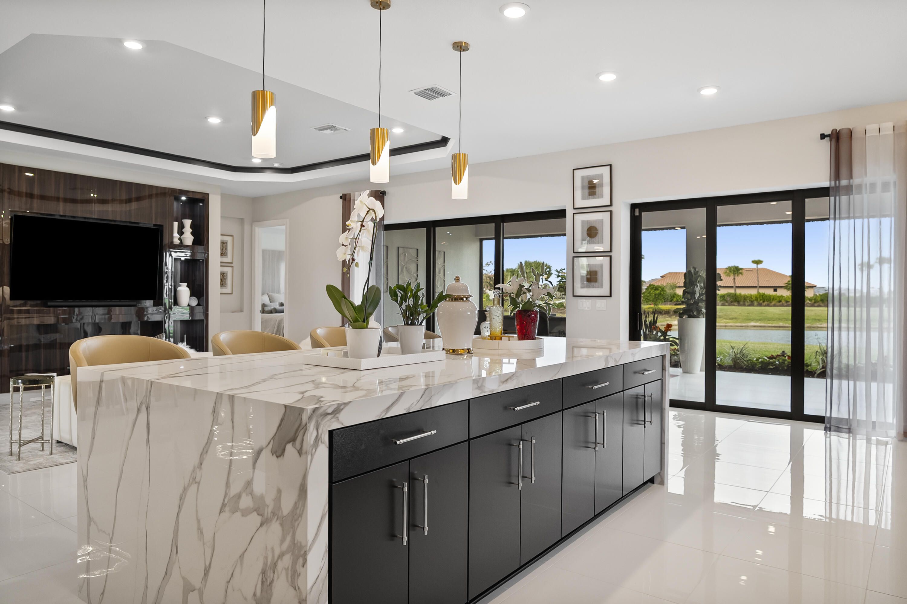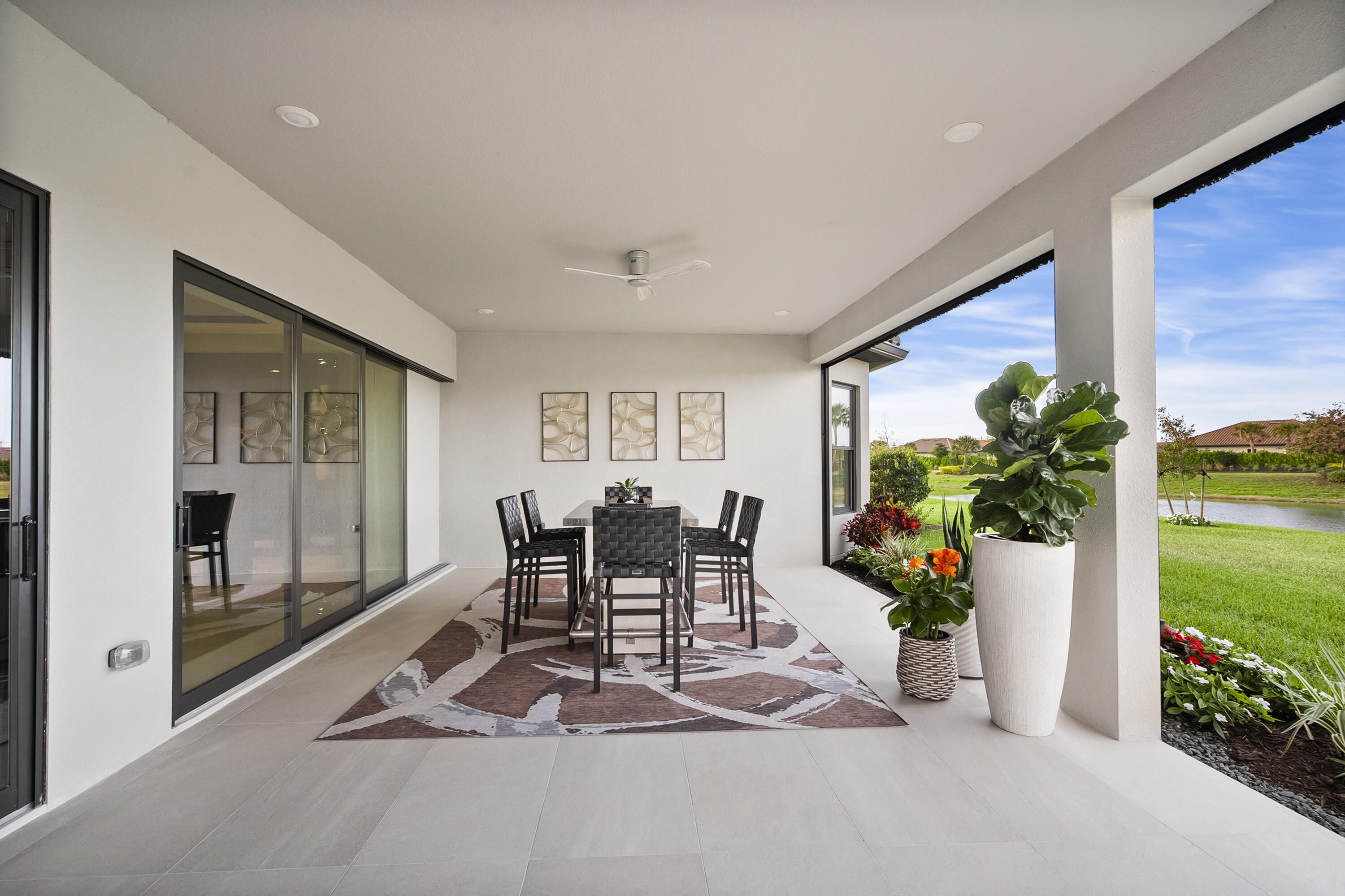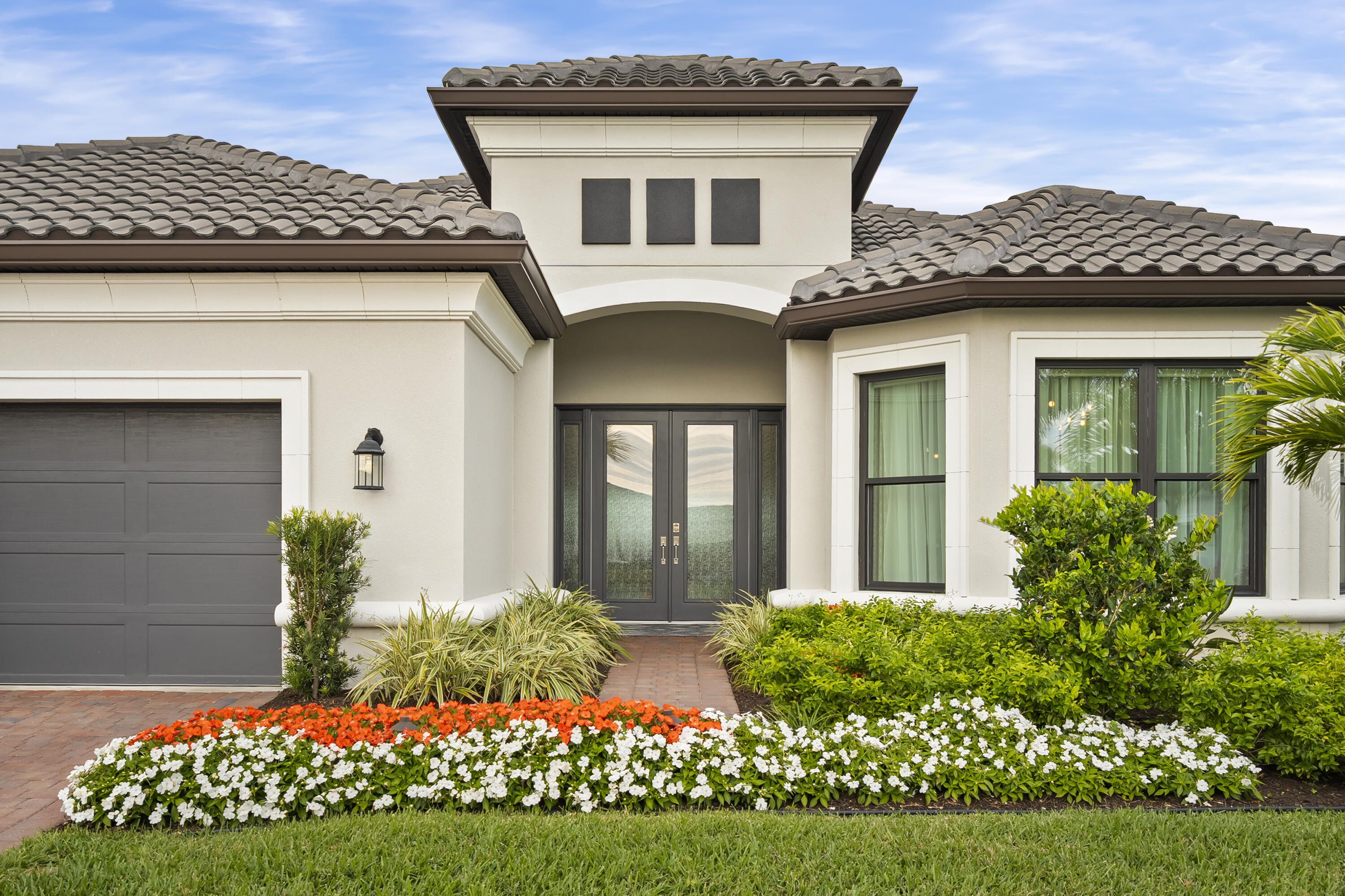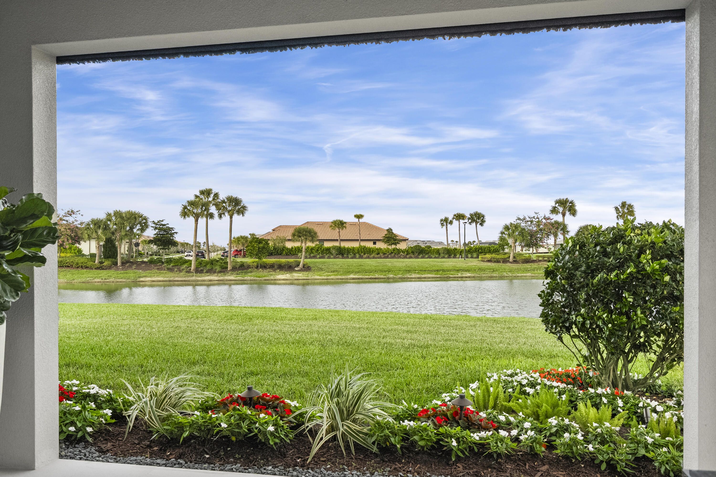 This Pallazio floor plan features extensive post-construction upgrades that go far beyond builder offerings. Offering 3 bedrooms, 3 bathrooms, plus a study/flex space, this exceptional home is situated on a quiet cul-de-sac on an oversized .36-acre pie-shaped lot that widens at the rear and overlooks a serene lake. Structural enhancements include an extended covered lanai, extended gourmet kitchen, outdoor kitchen gas and plumbing rough-ins, and extended bay windows in the primary suite. All impact windows and doors, paired with a brand-new barrel tile roof (2023), provide peace of mind and contribute to lower homeowners insurance rates. Inside, oversized porcelain tile flooring throughout (no carpet) creates a light, airy, and cohesive aesthetic. Professionally designed interiors take take this home to the next level with elevated finishes and thoughtful details throughout. The upgraded extended gourmet kitchen is an entertainer's dream, featuring all Thermador appliances, including a built-in refrigerator and wine fridge. A Thermador gas cooktop with griddle, paired with a custom range hood and built-in wall ovens, adds both function and style. The true showstopper is the 3-inch mitered porcelain countertops, a premium feature not offered by the builder, anchored by a striking waterfall island. The living room showcases a custom acrylic wood-finish built-in with integrated lighting. Pocket sliding glass doors seamlessly blend indoor and outdoor living, opening to lake views and an extended lanai equipped with motorized roll-down screens on all three openings, controlled at the touch of a button. The primary suite is nothing short of spectacular, enhanced by the bay window extension that floods the space with natural light and creates a private sitting area. The spa-like primary bath features dual shower heads, and the custom-designed walk-in closet is truly ready for your Chanel. This home offers a rare combination of design, upgrades, location, and lifestyle. A must-see for buyers seeking refined luxury and effortless indoor/outdoor living. Experience Esplanade at Tradition, a 55+ resort-style living community located in the 8,300-acre Tradition master-planned community. Tradition exudes the charm of a small town with a number of conveniences close to home. Great shopping and restaurants are just a short stroll or bike ride away. The clubhouse, a state-of-the-art resort amenity center with facilities totaling approximately 16,800 square feet including the newest in designed fitness rooms and equipment, aerobic rooms, spa therapy room, lockers and shower rooms. This facility also includes a resort-style pool with spa, connected grill, tropical sand beach, luxurious landscape, shaded lounge chairs, poolside tables and covered cabanas. For social, dining, business and culinary needs, the clubhouse has a gathering center adjacent to an events lawn with an overflow gathering area. The facility includes a grand reception, large veranda, grand community room, demo bar, catering kitchen, Toasted Café, and shaded outdoor dining. Sports enthusiasts can enjoy a two lighted Har Tru tennis courts and eight pickle ball courts for league play. Esplanade also offers a lakefront promenade, children's playground, central mail pavilion, small and large Bark Parks, and lakefront fireside seating area. The HOA includes lawncare, irrigation, cable, internet, security, gated entrance, amenities. Can be 19 or older to live in the community. Come home to Esplande!