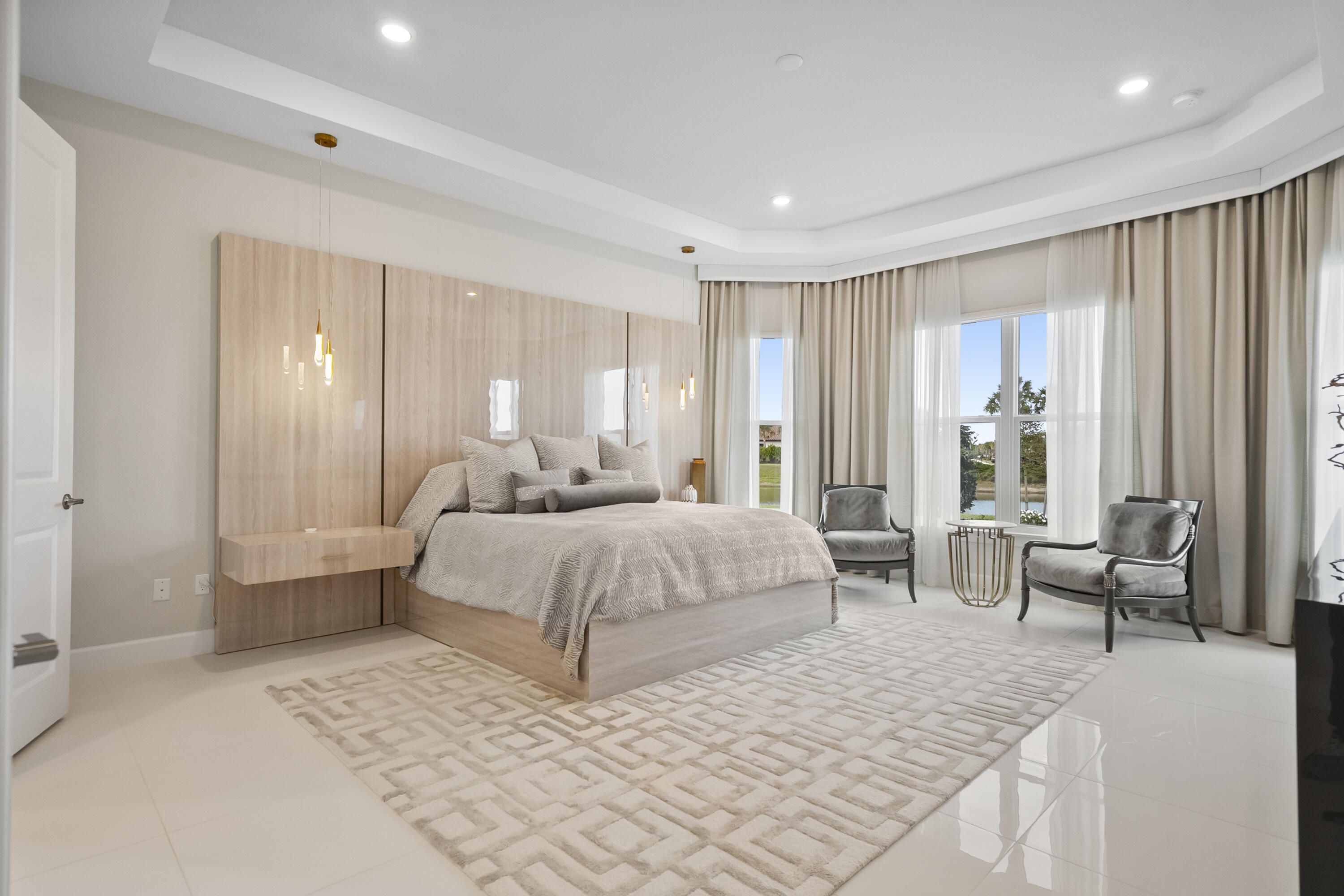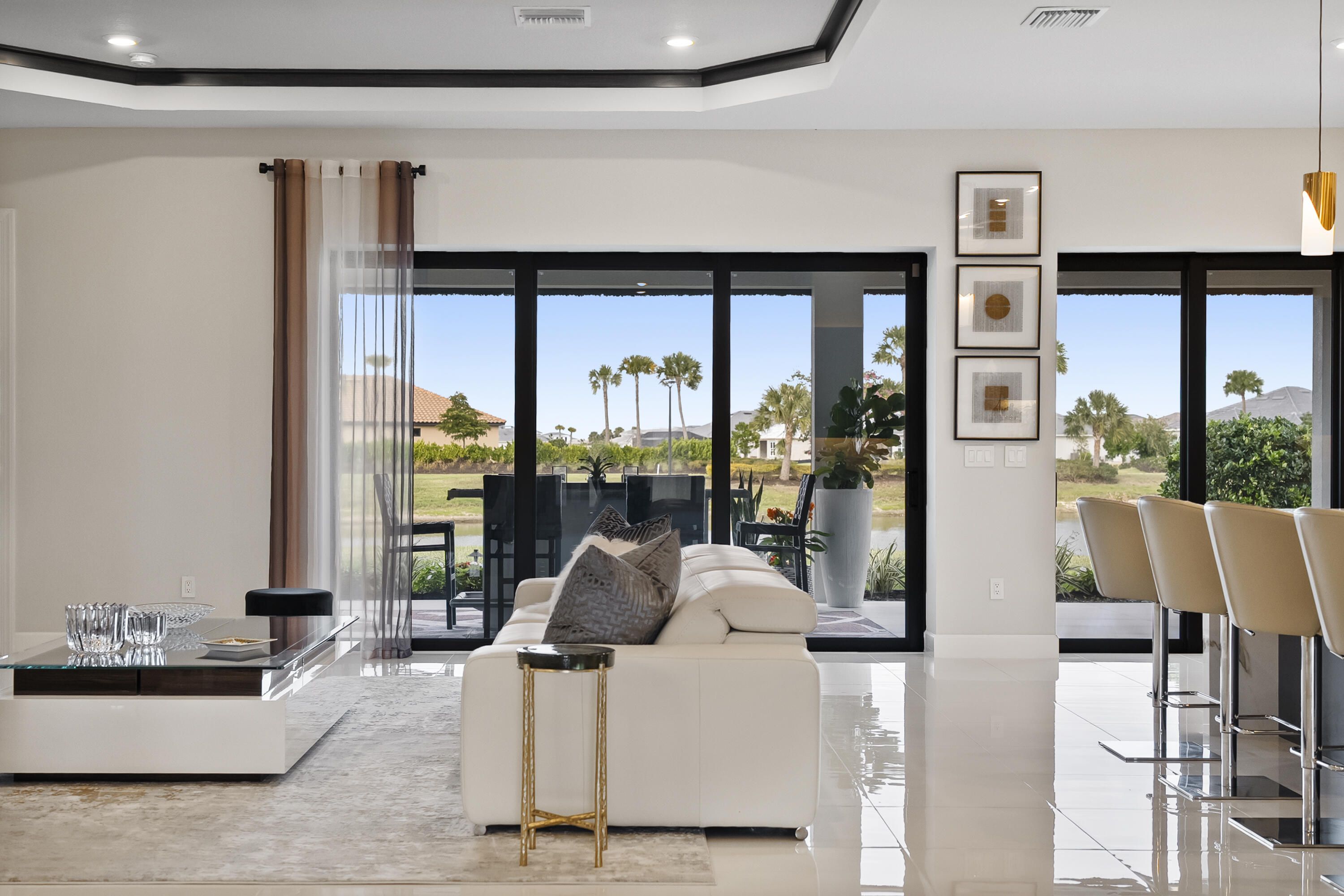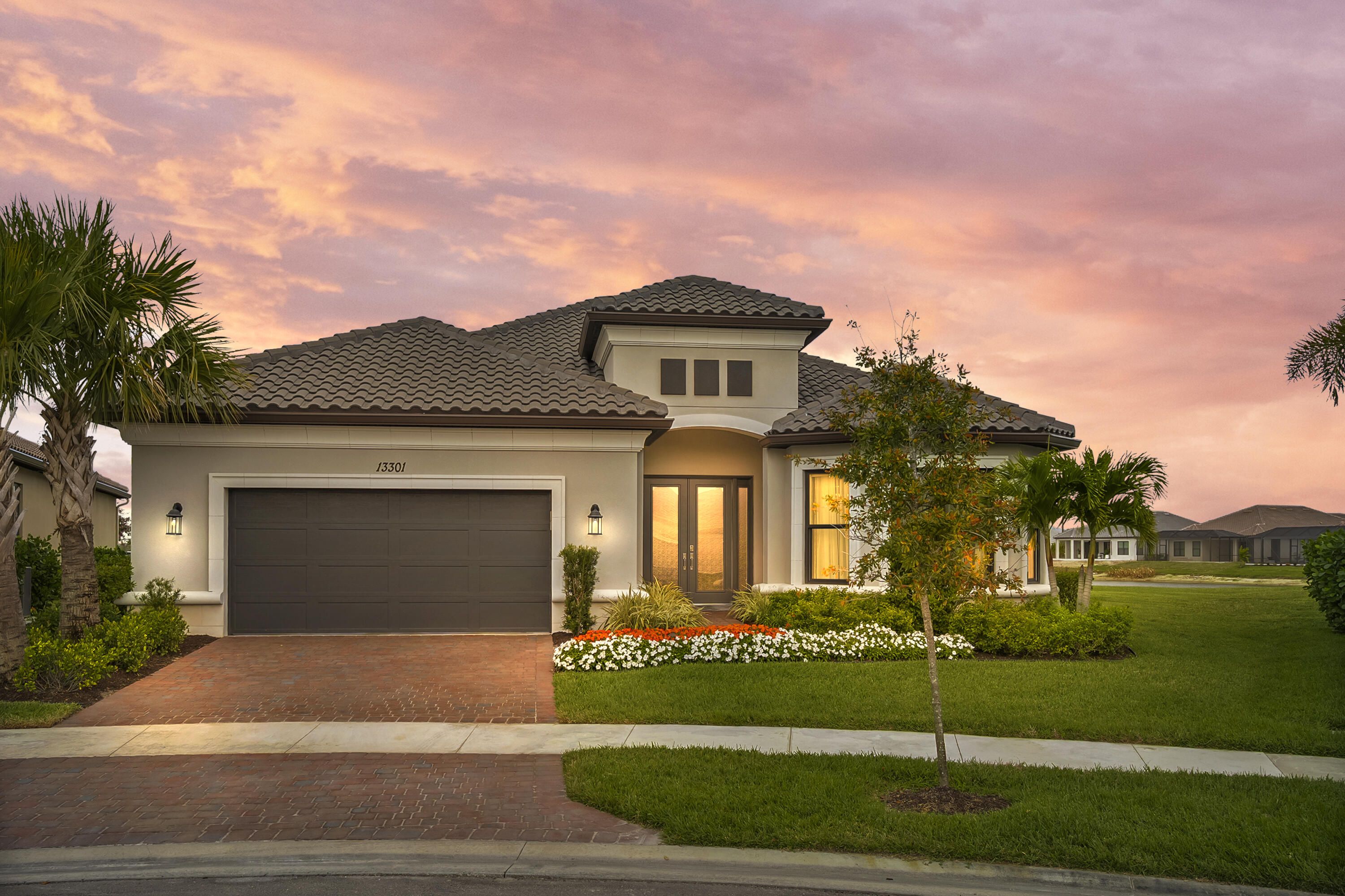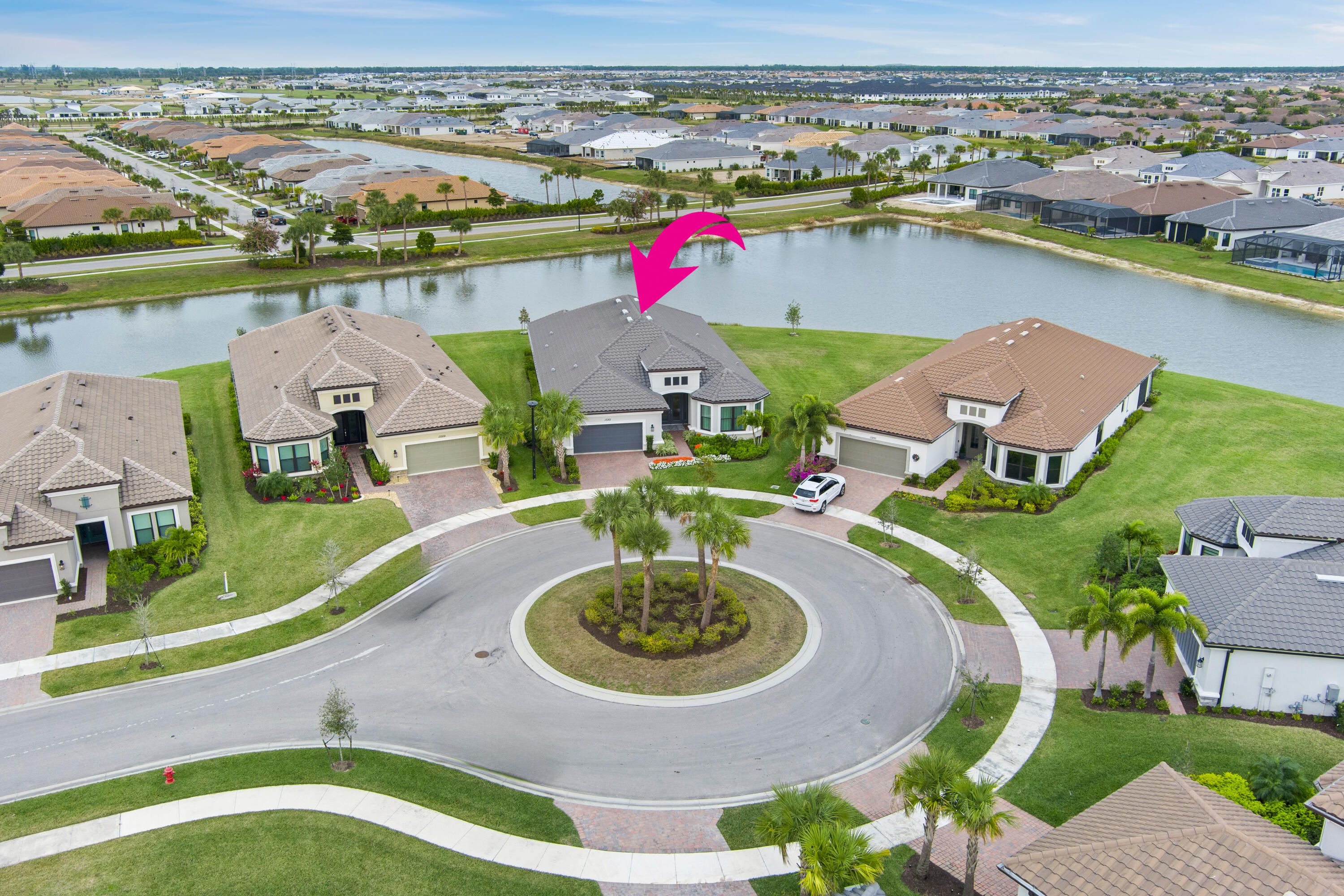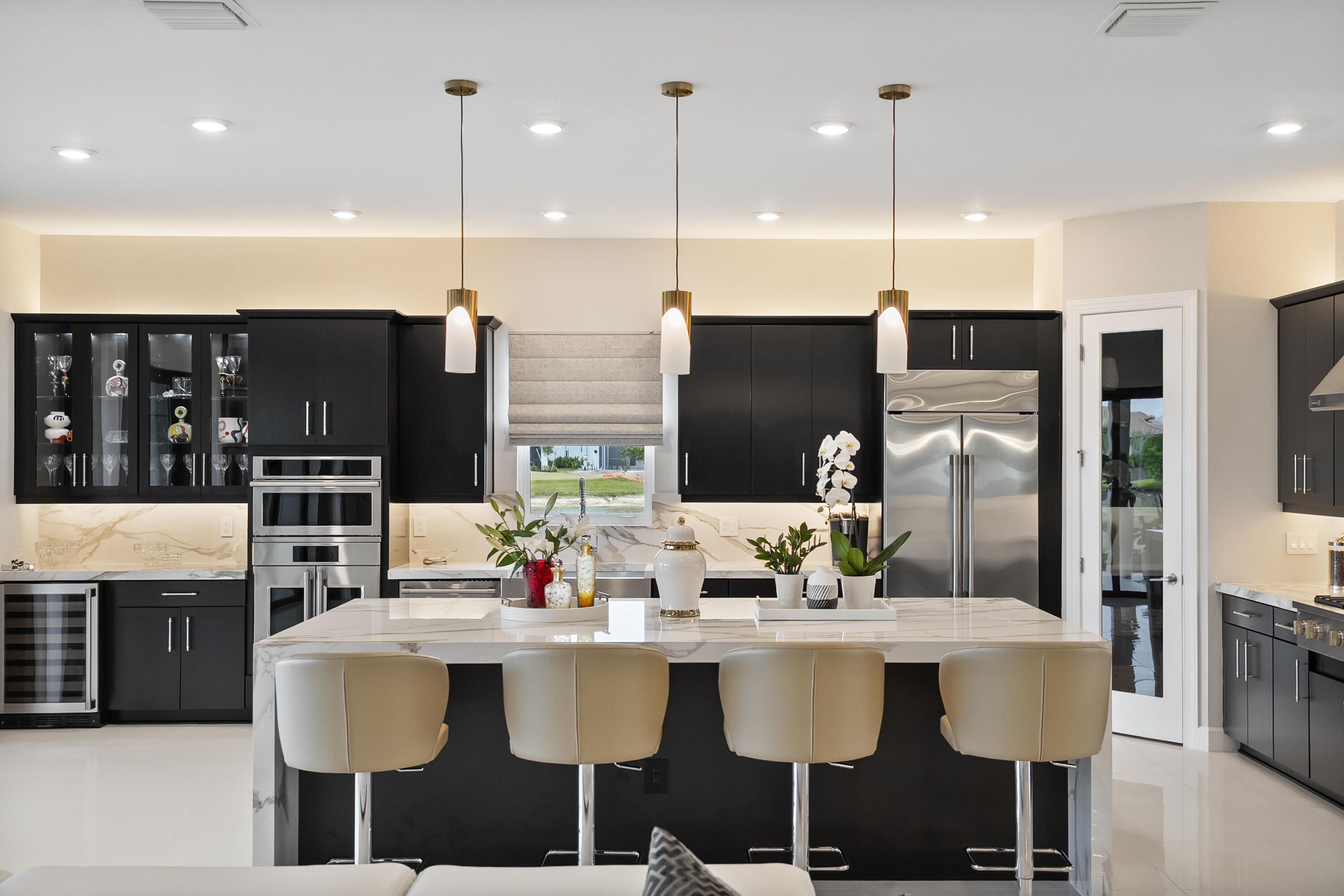 This Pallazio floor plan features extensive post-construction upgrades that go far beyond builder offerings. Offering 3 bedrooms, 3 bathrooms, plus a study/flex space, this exceptional home is situated on a quiet cul-de-sac on an oversized .36-acre pie-shaped lot that widens at the rear and overlooks a serene lake. Structural enhancements include an extended covered lanai, extended gourmet kitchen, outdoor kitchen gas and plumbing rough-ins, and extended bay windows in the primary suite. All impact windows and doors, paired with a brand-new barrel tile roof (2023), provide peace of mind and contribute to lower homeowners insurance rates. Inside, oversized porcelain tile flooring throughout (no carpet) creates a light, airy, and cohesive aesthetic. Professionally designed interiors take take this home to the next level with elevated finishes and thoughtful details throughout. The upgraded extended gourmet kitchen is an entertainer's dream, featuring all Thermador appliances, including a built-in refrigerator and wine fridge. A Thermador gas cooktop with griddle, paired with a custom range hood and built-in wall ovens, adds both function and style. The true showstopper is the 3-inch mitered porcelain countertops, a premium feature not offered by the builder, anchored by a striking waterfall island. The living room showcases a custom acrylic wood-finish built-in with integrated lighting. Pocket sliding glass doors seamlessly blend indoor and outdoor living, opening to lake views and an extended lanai equipped with motorized roll-down screens on all three openings, controlled at the touch of a button. The primary suite is nothing short of spectacular, enhanced by the bay window extension that floods the space with natural light and creates a private sitting area. The spa-like primary bath features dual shower heads, and the custom-designed walk-in closet is truly ready for your Chanel. This home offers a rare combination of design, upgrades, location, and lifestyle. A must-see for buyers seeking refined luxury and effortless indoor/outdoor living. Experience Esplanade at Tradition, a 55+ resort-style living community located in the 8,300-acre Tradition master-planned community. Tradition exudes the charm of a small town with a number of conveniences close to home. Great shopping and restaurants are just a short stroll or bike ride away. The clubhouse, a state-of-the-art resort amenity center with facilities totaling approximately 16,800 square feet including the newest in designed fitness rooms and equipment, aerobic rooms, spa therapy room, lockers and shower rooms. This facility also includes a resort-style pool with spa, connected grill, tropical sand beach, luxurious landscape, shaded lounge chairs, poolside tables and covered cabanas. For social, dining, business and culinary needs, the clubhouse has a gathering center adjacent to an events lawn with an overflow gathering area. The facility includes a grand reception, large veranda, grand community room, demo bar, catering kitchen, Toasted Café, and shaded outdoor dining. Sports enthusiasts can enjoy a two lighted Har Tru tennis courts and eight pickle ball courts for league play. Esplanade also offers a lakefront promenade, children's playground, central mail pavilion, small and large Bark Parks, and lakefront fireside seating area. The HOA includes lawncare, irrigation, cable, internet, security, gated entrance, amenities. Can be 19 or older to live in the community. Come home to Esplande!