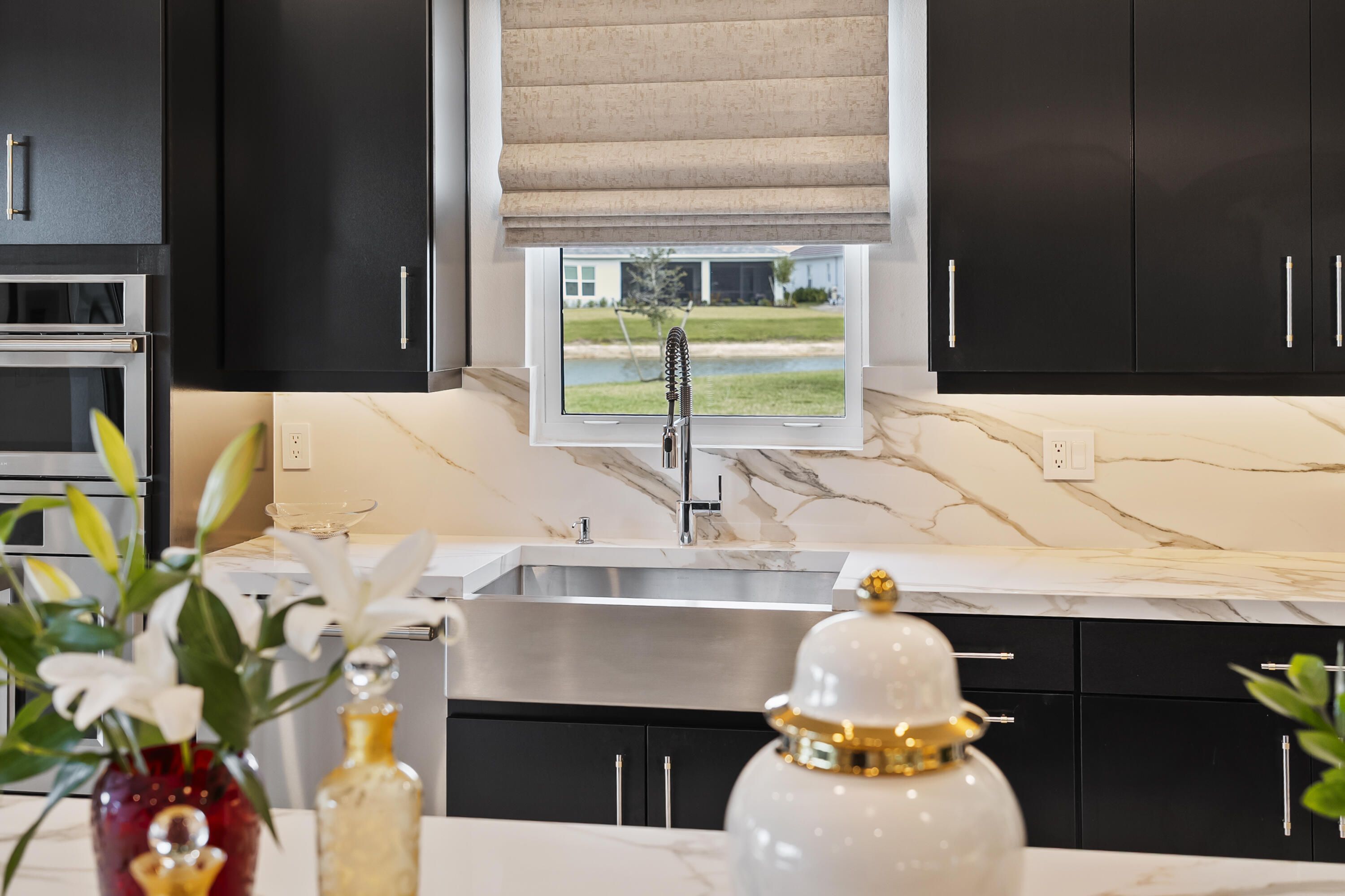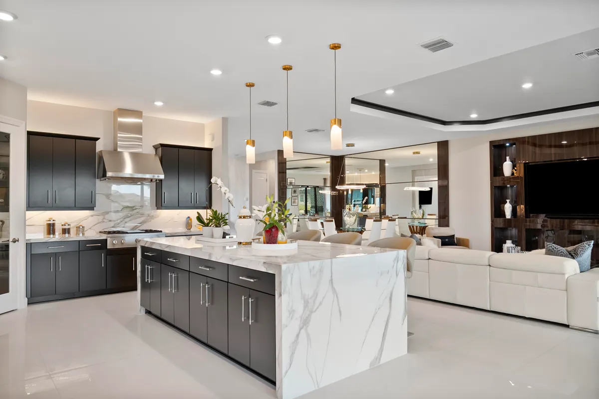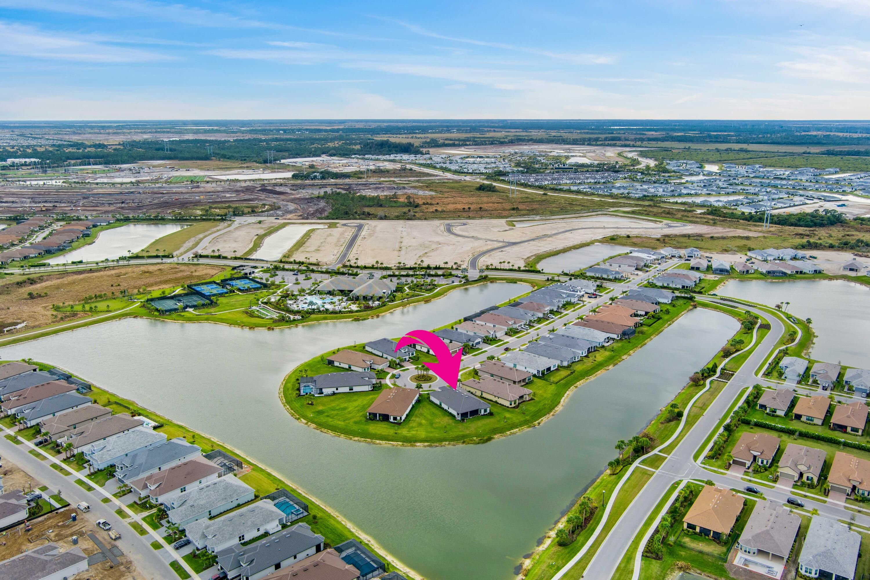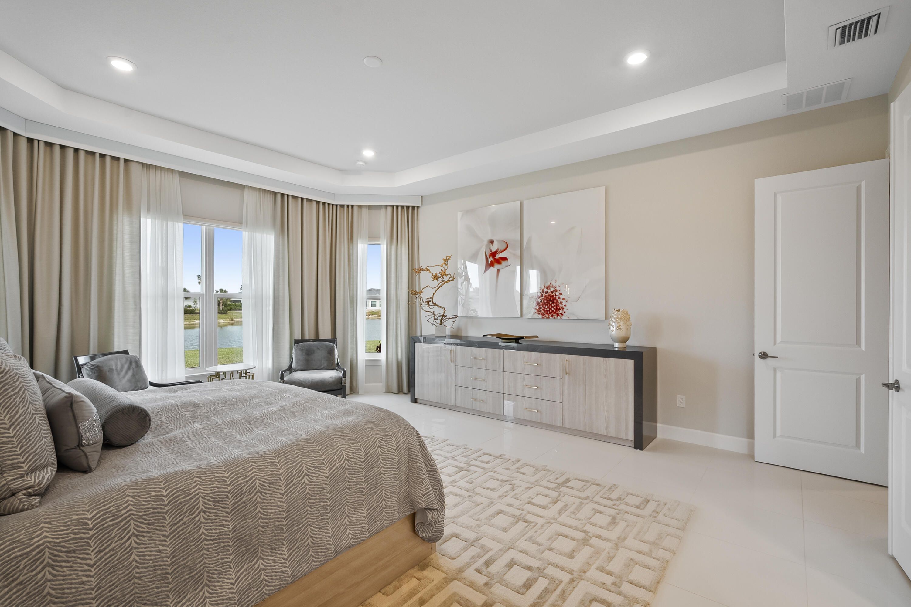 This Pallazio floor plan features extensive post-construction upgrades that go far beyond builder offerings. Offering 3 bedrooms, 3 bathrooms, plus a study/flex space, this exceptional home is situated on a quiet cul-de-sac on an oversized .36-acre pie-shaped lot that widens at the rear and overlooks a serene lake. Structural enhancements include an extended covered lanai, extended gourmet kitchen, outdoor kitchen gas and plumbing rough-ins, and extended bay windows in the primary suite. All impact windows and doors, paired with a brand-new barrel tile roof (2023), provide peace of mind and contribute to lower homeowners insurance rates. Inside, oversized porcelain tile flooring throughout (no carpet) creates a light, airy, and cohesive aesthetic. Professionally designed interiors take take this home to the next level with elevated finishes and thoughtful details throughout. The upgraded extended gourmet kitchen is an entertainer's dream, featuring all Thermador appliances, including a built-in refrigerator and wine fridge. A Thermador gas cooktop with griddle, paired with a custom range hood and built-in wall ovens, adds both function and style. The true showstopper is the 3-inch mitered porcelain countertops, a premium feature not offered by the builder, anchored by a striking waterfall island. The living room showcases a custom acrylic wood-finish built-in with integrated lighting. Pocket sliding glass doors seamlessly blend indoor and outdoor living, opening to lake views and an extended lanai equipped with motorized roll-down screens on all three openings, controlled at the touch of a button. The primary suite is nothing short of spectacular, enhanced by the bay window extension that floods the space with natural light and creates a private sitting area. The spa-like primary bath features dual shower heads, and the custom-designed walk-in closet is truly ready for your Chanel. This home offers a rare combination of design, upgrades, location, and lifestyle. A must-see for buyers seeking refined luxury and effortless indoor/outdoor living. Experience Esplanade at Tradition, a 55+ resort-style living community located in the 8,300-acre Tradition master-planned community. Tradition exudes the charm of a small town with a number of conveniences close to home. Great shopping and restaurants are just a short stroll or bike ride away. The clubhouse, a state-of-the-art resort amenity center with facilities totaling approximately 16,800 square feet including the newest in designed fitness rooms and equipment, aerobic rooms, spa therapy room, lockers and shower rooms. This facility also includes a resort-style pool with spa, connected grill, tropical sand beach, luxurious landscape, shaded lounge chairs, poolside tables and covered cabanas. For social, dining, business and culinary needs, the clubhouse has a gathering center adjacent to an events lawn with an overflow gathering area. The facility includes a grand reception, large veranda, grand community room, demo bar, catering kitchen, Toasted Café, and shaded outdoor dining. Sports enthusiasts can enjoy a two lighted Har Tru tennis courts and eight pickle ball courts for league play. Esplanade also offers a lakefront promenade, children's playground, central mail pavilion, small and large Bark Parks, and lakefront fireside seating area. The HOA includes lawncare, irrigation, cable, internet, security, gated entrance, amenities. Can be 19 or older to live in the community. Come home to Esplande!