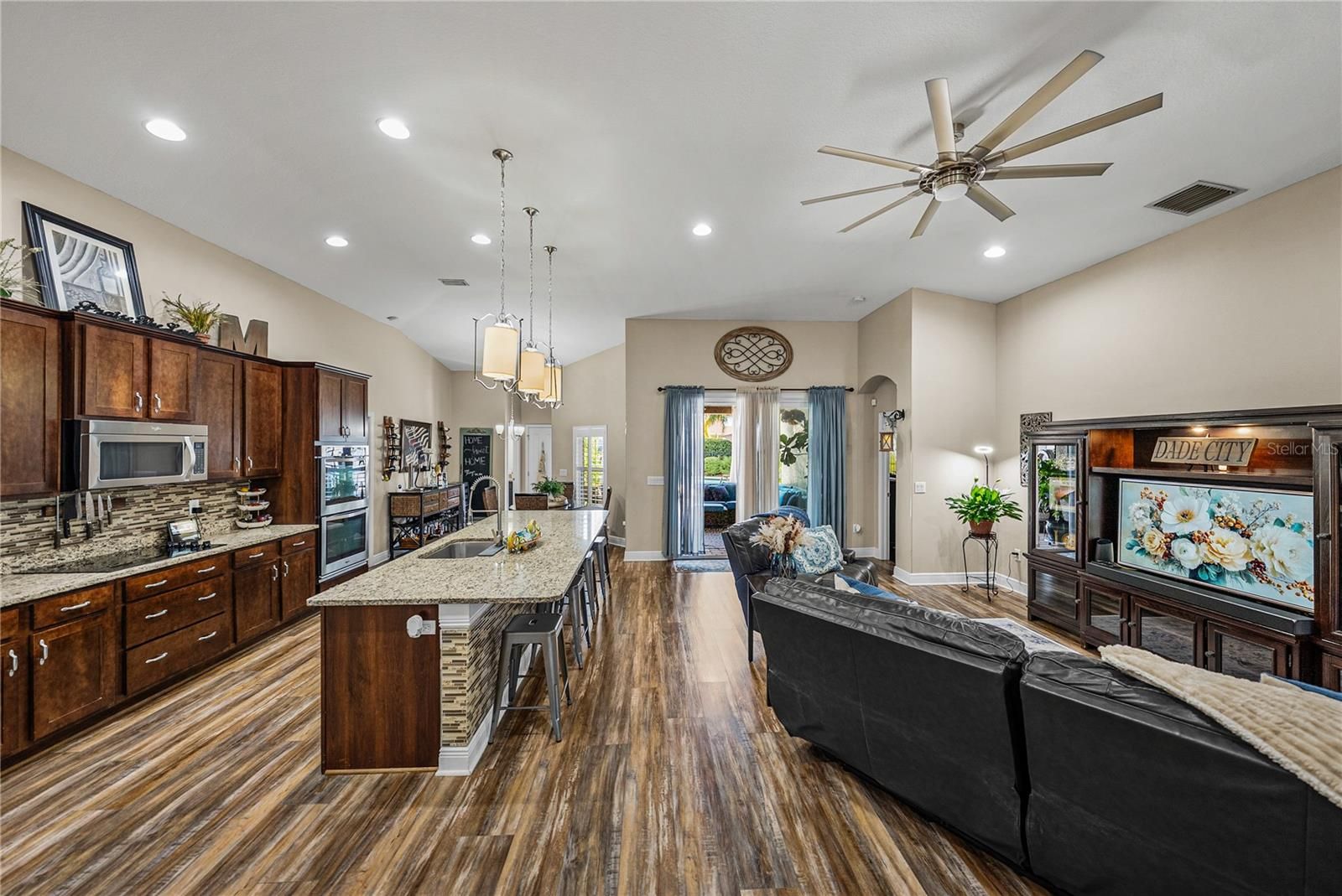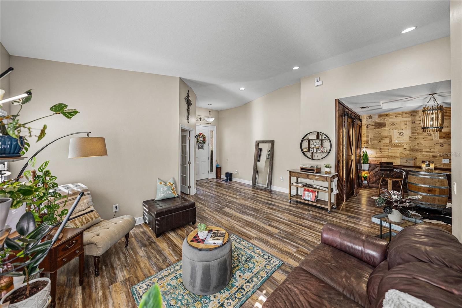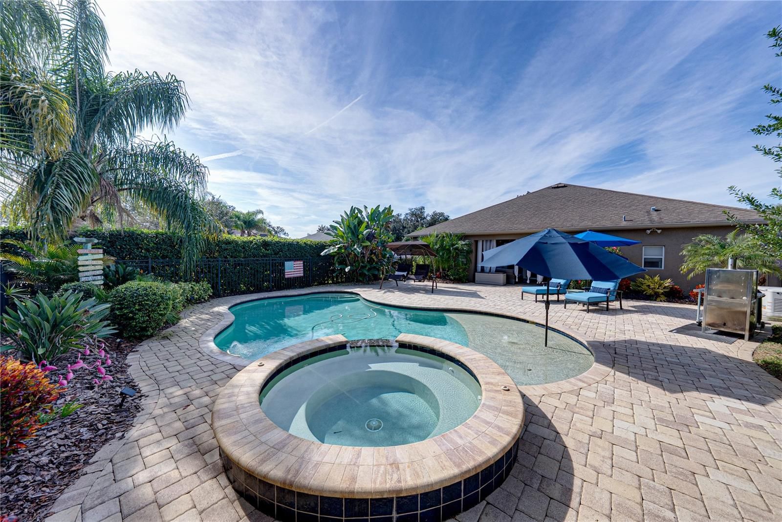 Exquisite resort-style living awaits within the gated, and amenity filled Lake Jovita Golf and Country Club. This 4 bedroom + office, 3 bath, 3 car garage pool home delivers a level of design, privacy, and luxurious living that immediately sets it apart. Built in 2014 and thoughtfully enhanced, this residence feels less like a house and more like a carefully curated retreat. Set on a comfortable corner lot, the manicured landscape and custom brick path set an inviting tone for the property. Through the entry, a private office tucked behind French doors offers a quiet, refined workspace, while a formal sitting room provides a welcoming introduction to the home’s elegant scale. From there, the layout opens into a true entertainer’s paradise where every detail has been selected with purpose. The expansive family room anchors the home with soaring ceilings, abundant natural light, and sliding glass doors that dissolve the boundary between indoor and outdoor living, leading to one of the most impressive outdoor spaces in Lake Jovita. The heated pool and spa are surrounded by a paver deck, lush tropical landscaping, water features, and a sun shelf that enhances the resort-style feel. A cozy covered seating area invites long evenings outdoors and alfresco dining, while the rare wrought iron fencing adds charm and peace of mind. This backyard is private, tropical, and truly special. Views from the living room stretch effortlessly into the heart of the home, where the kitchen and formal dining space come together in perfect harmony. This space feels elevated yet warm, with carefully chosen lighting, a custom pantry framed by barn doors, and a striking blend of luxury vinyl flooring, accent walls, backsplash, and cabinetry that creates a cohesive, designer-driven aesthetic throughout. The kitchen is both beautiful and functional, offering stainless steel appliances including a double oven, a large central island with breakfast bar seating, an eat-in dinette, and storage that has been customized to feel intentional rather than ordinary. It is a space designed for hosting, gathering, and everyday enjoyment. The primary suite is privately positioned away from the secondary bedrooms, creating a true retreat. Spacious sleeping quarters lead to a walk-in closet with custom built-in organizers and a luxurious ensuite bath featuring a soaking tub, walk-in shower, dual sinks with vanity seating, and additional closet storage. A second bedroom is set apart on its own, ideal for guests, with a walk-in closet and ensuite access to a full bathroom that also opens to the hallway. Bedrooms three and four are thoughtfully placed near each other and share a full bath with a tub and shower combination, creating a functional and comfortable layout for family or visitors. Additional highlights include a propane-powered whole-house generator, a laundry room, and a three-car garage. Residents of Lake Jovita enjoy access to a playground, park, pickleball court, and walking trails. Optional membership packages at the Lake Jovita Golf and Country Club include access to 2 18- hole world-class golf courses, a Jr. Olympic size swimming pool, a restaurant, a clubhouse, a fitness center, a pro shop, and a lifestyle that feels worlds away while remaining close to everyday conveniences. This home captures the very best of Florida living, call us today to schedule your private tour!