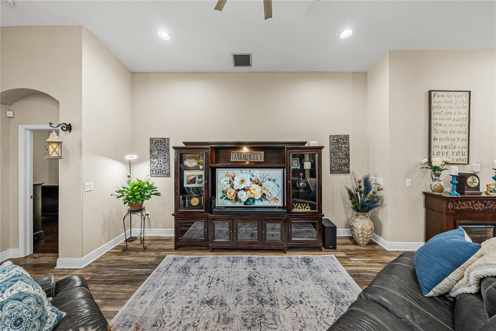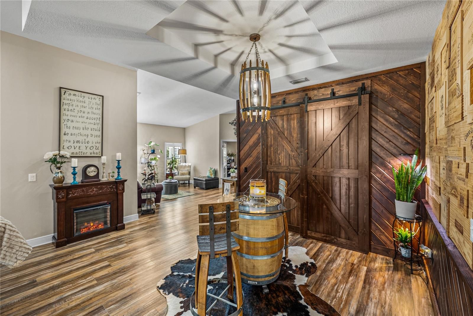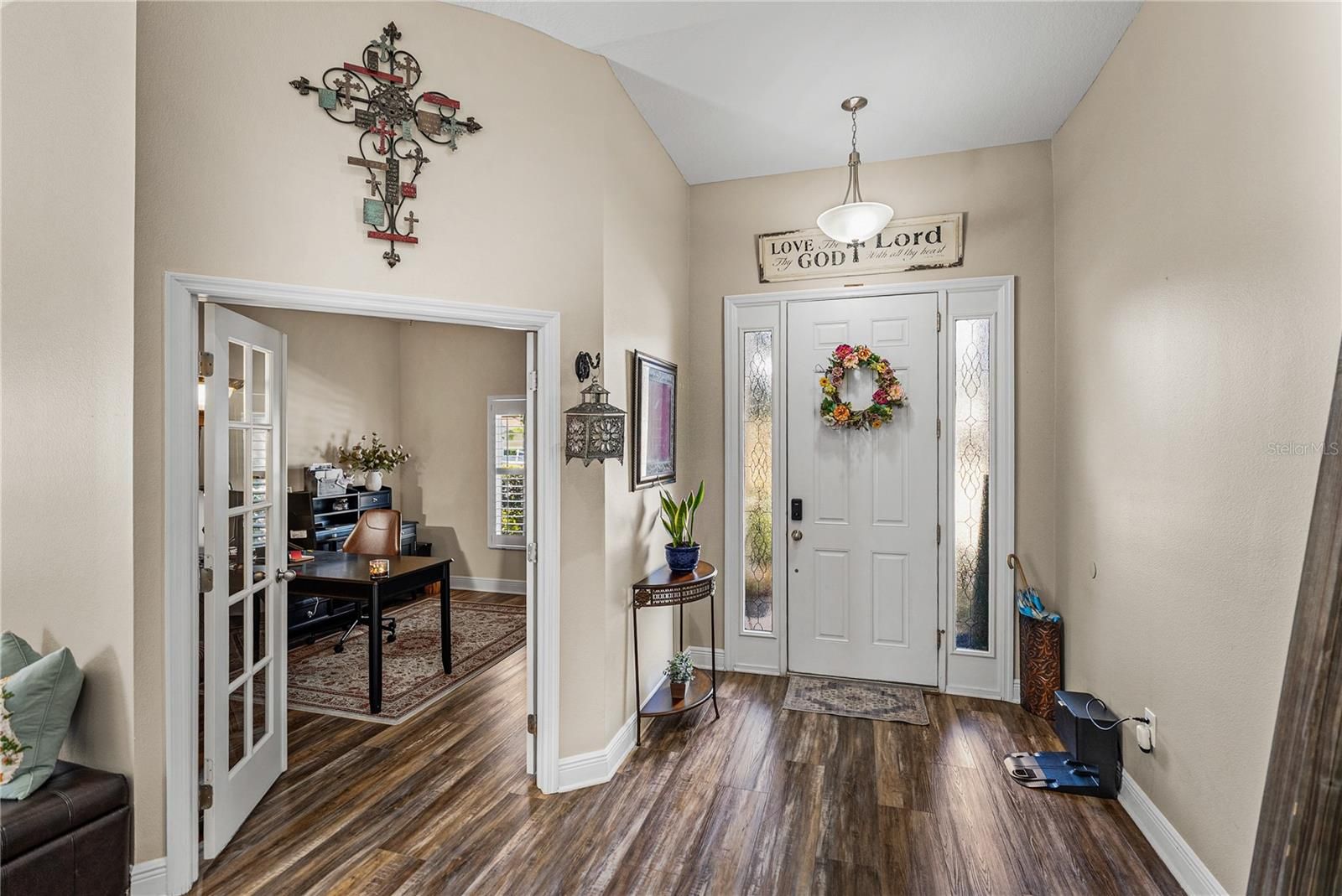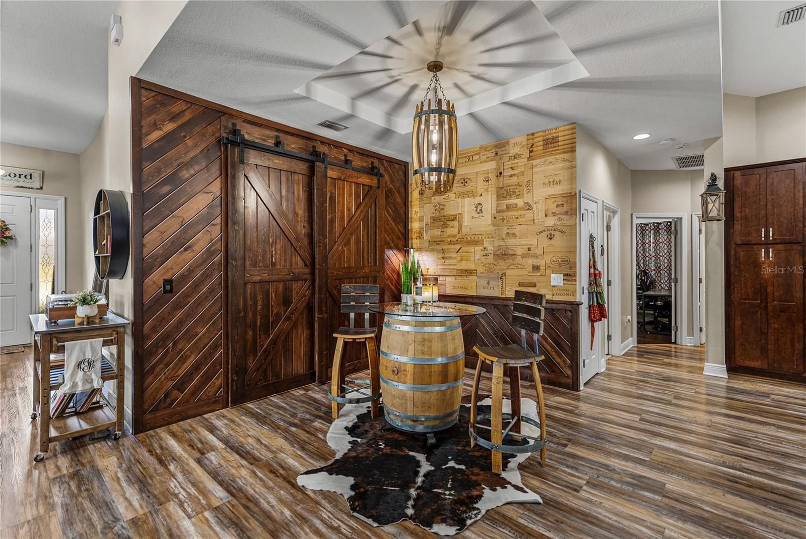 Exquisite resort-style living awaits within the gated, and amenity filled Lake Jovita Golf and Country Club. This 4 bedroom + office, 3 bath, 3 car garage pool home delivers a level of design, privacy, and luxurious living that immediately sets it apart. Built in 2014 and thoughtfully enhanced, this residence feels less like a house and more like a carefully curated retreat. Set on a comfortable corner lot, the manicured landscape and custom brick path set an inviting tone for the property. Through the entry, a private office tucked behind French doors offers a quiet, refined workspace, while a formal sitting room provides a welcoming introduction to the home’s elegant scale. From there, the layout opens into a true entertainer’s paradise where every detail has been selected with purpose. The expansive family room anchors the home with soaring ceilings, abundant natural light, and sliding glass doors that dissolve the boundary between indoor and outdoor living, leading to one of the most impressive outdoor spaces in Lake Jovita. The heated pool and spa are surrounded by a paver deck, lush tropical landscaping, water features, and a sun shelf that enhances the resort-style feel. A cozy covered seating area invites long evenings outdoors and alfresco dining, while the rare wrought iron fencing adds charm and peace of mind. This backyard is private, tropical, and truly special. Views from the living room stretch effortlessly into the heart of the home, where the kitchen and formal dining space come together in perfect harmony. This space feels elevated yet warm, with carefully chosen lighting, a custom pantry framed by barn doors, and a striking blend of luxury vinyl flooring, accent walls, backsplash, and cabinetry that creates a cohesive, designer-driven aesthetic throughout. The kitchen is both beautiful and functional, offering stainless steel appliances including a double oven, a large central island with breakfast bar seating, an eat-in dinette, and storage that has been customized to feel intentional rather than ordinary. It is a space designed for hosting, gathering, and everyday enjoyment. The primary suite is privately positioned away from the secondary bedrooms, creating a true retreat. Spacious sleeping quarters lead to a walk-in closet with custom built-in organizers and a luxurious ensuite bath featuring a soaking tub, walk-in shower, dual sinks with vanity seating, and additional closet storage. A second bedroom is set apart on its own, ideal for guests, with a walk-in closet and ensuite access to a full bathroom that also opens to the hallway. Bedrooms three and four are thoughtfully placed near each other and share a full bath with a tub and shower combination, creating a functional and comfortable layout for family or visitors. Additional highlights include a propane-powered whole-house generator, a laundry room, and a three-car garage. Residents of Lake Jovita enjoy access to a playground, park, pickleball court, and walking trails. Optional membership packages at the Lake Jovita Golf and Country Club include access to 2 18- hole world-class golf courses, a Jr. Olympic size swimming pool, a restaurant, a clubhouse, a fitness center, a pro shop, and a lifestyle that feels worlds away while remaining close to everyday conveniences. This home captures the very best of Florida living, call us today to schedule your private tour!