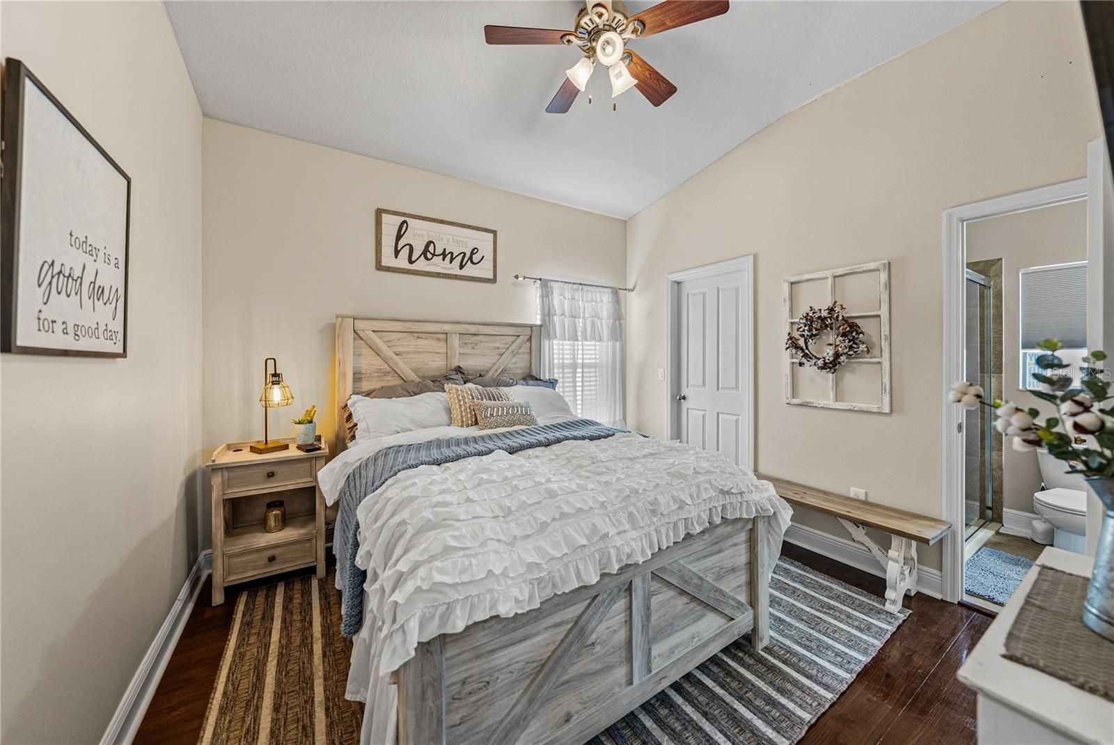 - Ceiling Fan(s), Eat-in Kitchen, High Ceilings, Kitchen/Family Room Combo, Open Floorplan, Main Level Primary, Solid-Wood Cabinets, Split Bedrooms, Stone Counters, Walk-In Closet(s)