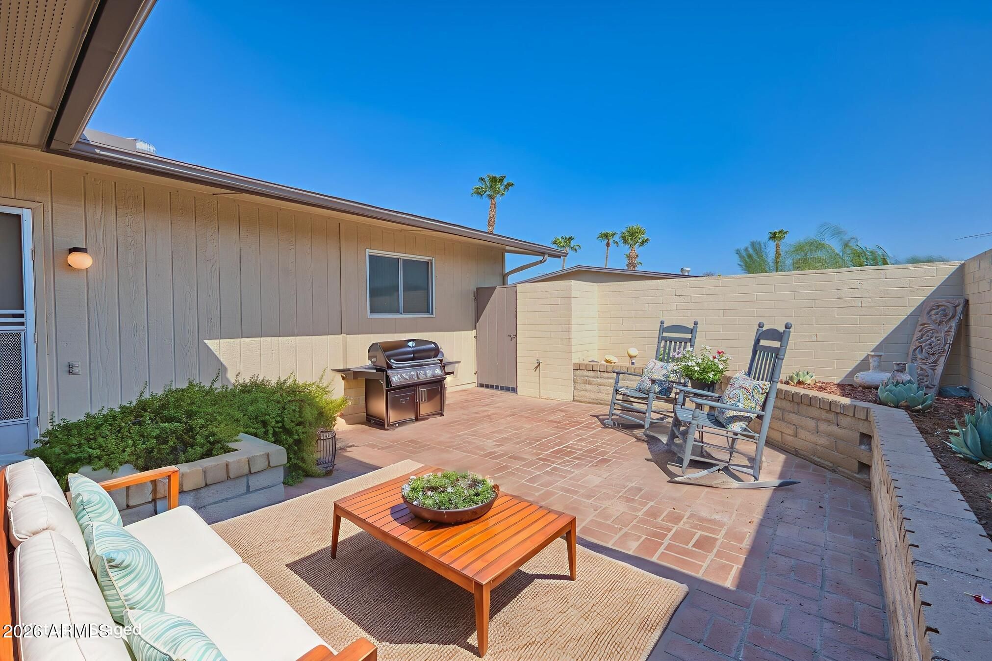 This charming garden apartment unit offers a spacious 1221 sf floor plan w/2 bdrms and 1.75 baths. Primary bedroom is nicely carpeted, offers a walk-in closet and updated bathroom w/rainfall shower head. Neutral color scheme offers versatility throughout. Lrg living room opens to a dining rm and a large family room and/or Arizona room, featuring double sliding glass doors and lots of extra living space to this home! Another set of double doors open directly to the Primary bedroom. Easy spaces to entertain in or enjoy quiet time. Private courtyard in back offers pavers, a built-in garden planter and a spacious area to relax and unwind. Separate laundry off kitchen, garage has cabinets for plenty of storage. Newer A/C unit and HOA takes care of the roof and exterior. Located in Sun City West, a premier 55+ community offering world-class golf, resort-style pools, fitness centers, clubs, restaurants, and endless social activitieseverything you need for an active, low-maintenance lifestyle.