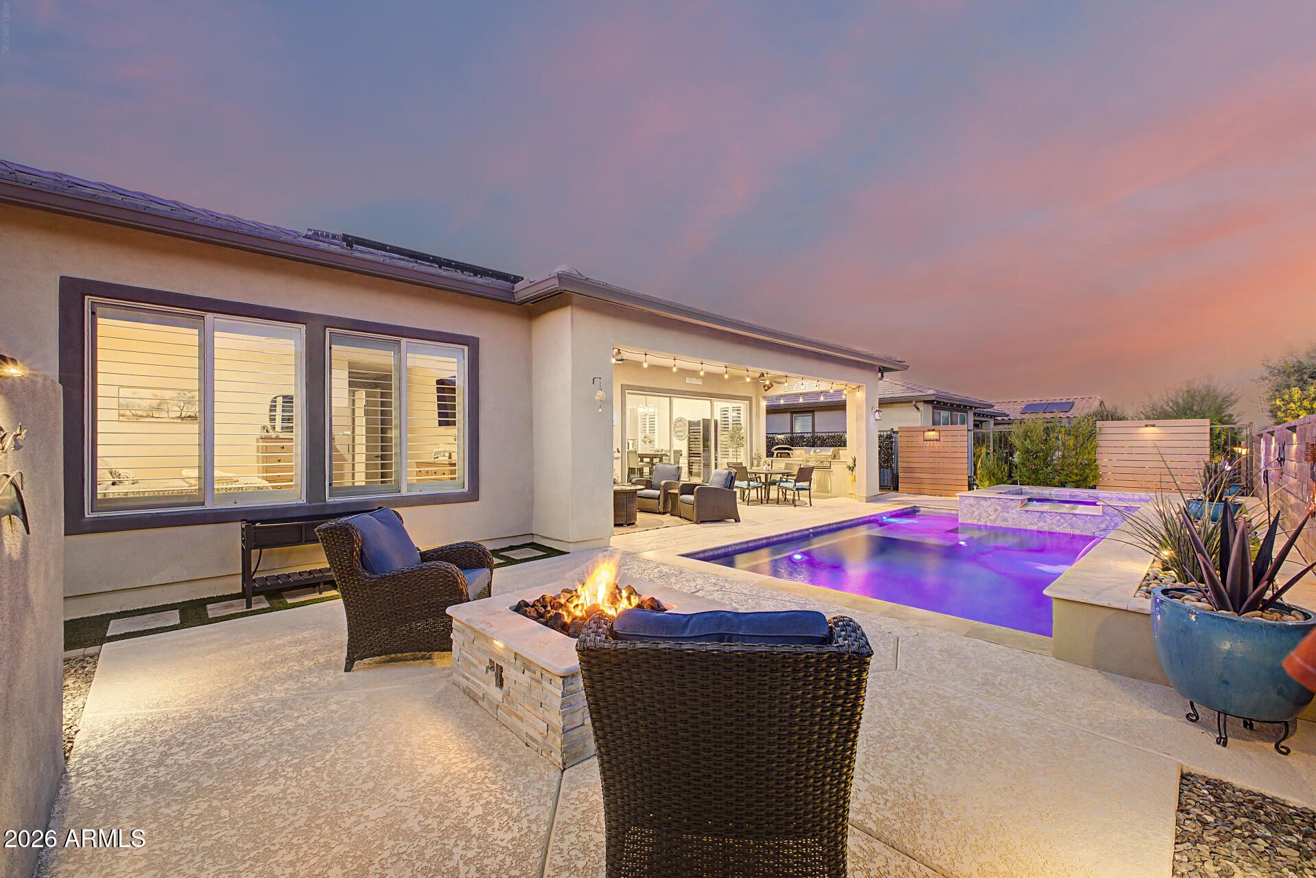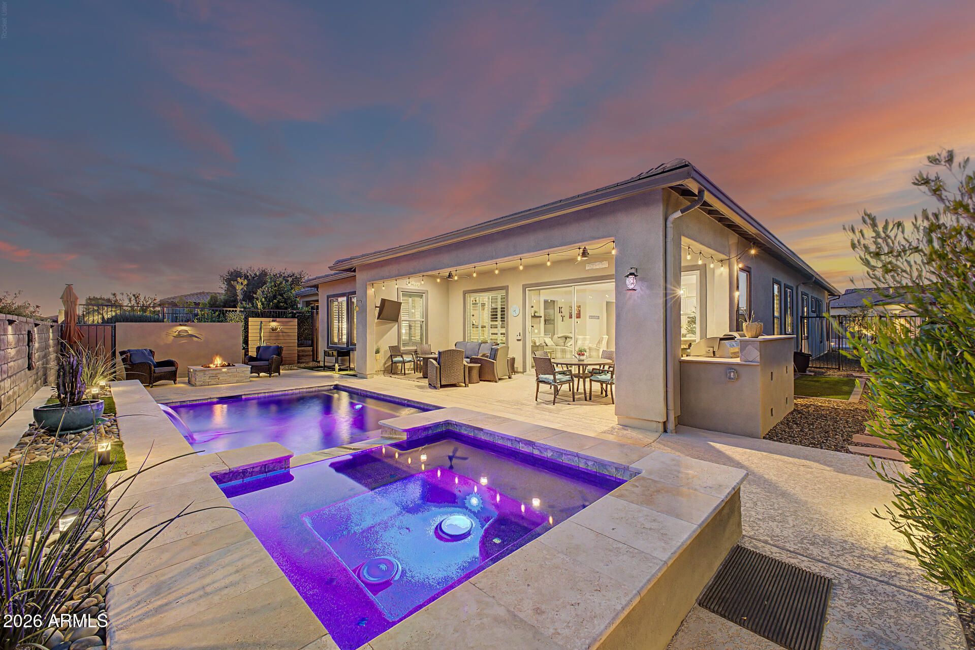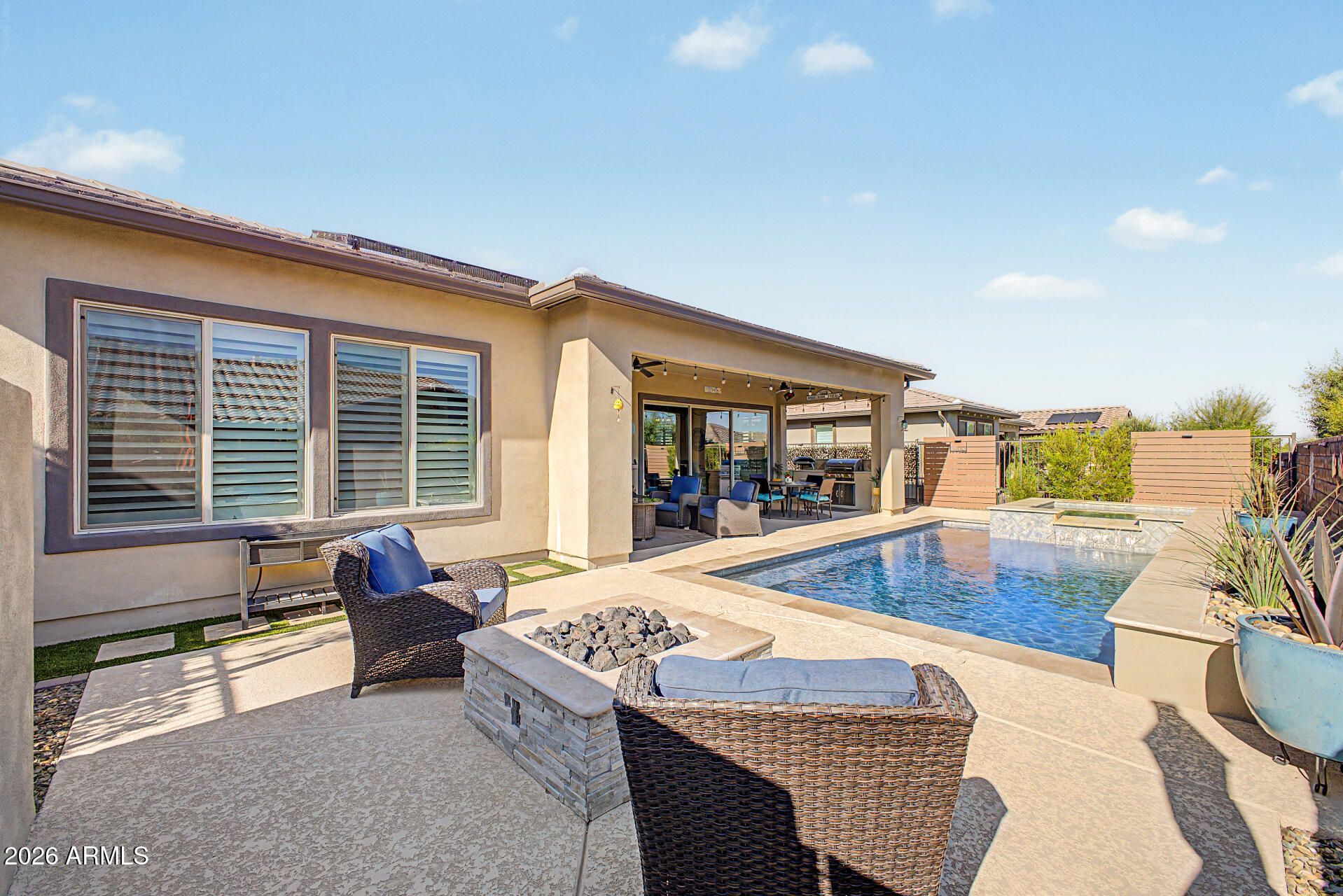 MONTAGE FLOORPLAN AVAILABLE NOW!! Your Dream Home with Owned Solar, Private Heated Pool and SPA, and a 3 Car Tandem Garage w/AC Mini Split is finally available!! This gorgeous residence built in 2022 features a Stunning Stone facade, pristine artificial turf and a custom driveway w/pavers. It includes Two Spacious (Split) Master En Suites with Walk In Closets, all 3 Full Baths are upgraded w/ stunning tile & Quartz c-tops plus an oversized Den/Office with Double Doors. Chef's Kitchen is designed like a Model Home w/Custom Cabinetry, Quartz Countertops w/tile backsplash and a Custom Quartz Island paired w/ SS Gas Appliances, and a SS Hood Vent. The open floorplan showcases high ceilings, recessed lighting, attractive wood look flooring, and classic Plantation Shutters. The Great Room includes a15 ft. Slider that brings the outside in!! It has an exquisite Custom Built Travertine TV/Entertainment Center that includes a 68" Heated Fireplace, Wood mantel, floating shelves, built in Base cabinets with Quartz Countertops. Enjoy gorgeous sunsets in the Resort Style Backyard, complete w/ a covered patio, a warm fire pit for starlit evenings, a built-in BBQ, & a refreshing spa & pool. Top rated resort community for your active lifestyle, Trilogy has it all. Golf, restaurants, TWO club houses, pools and activities galore. This superb home is an entertainer's dream with amazing upgrades and outdoor living.