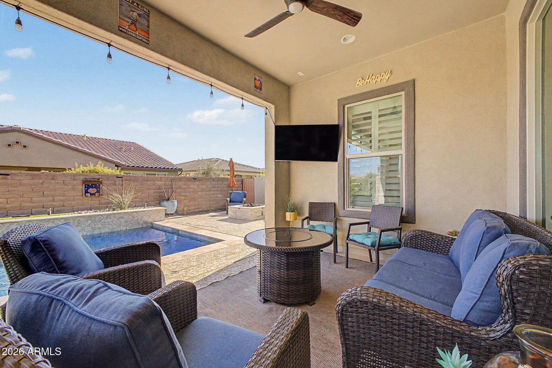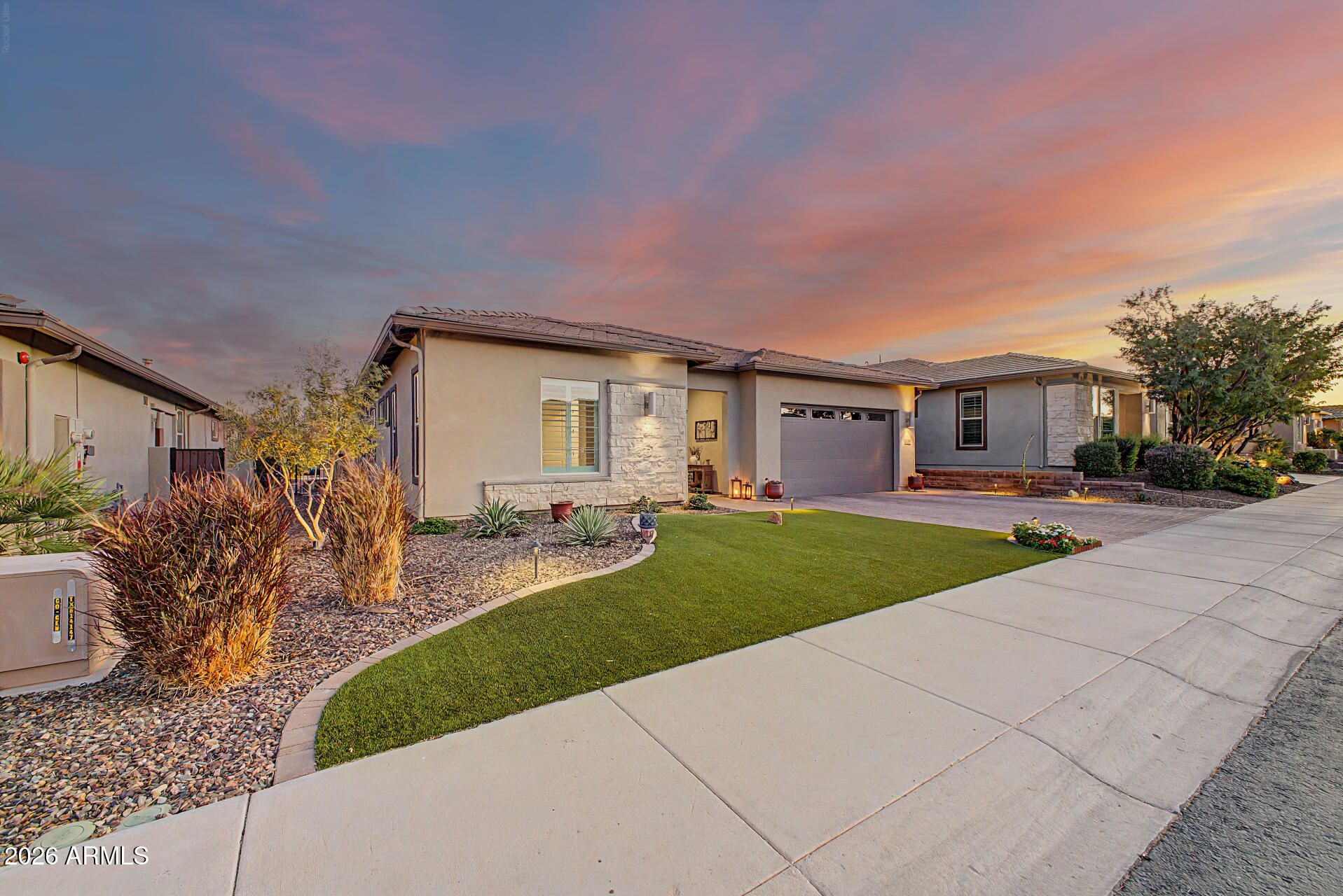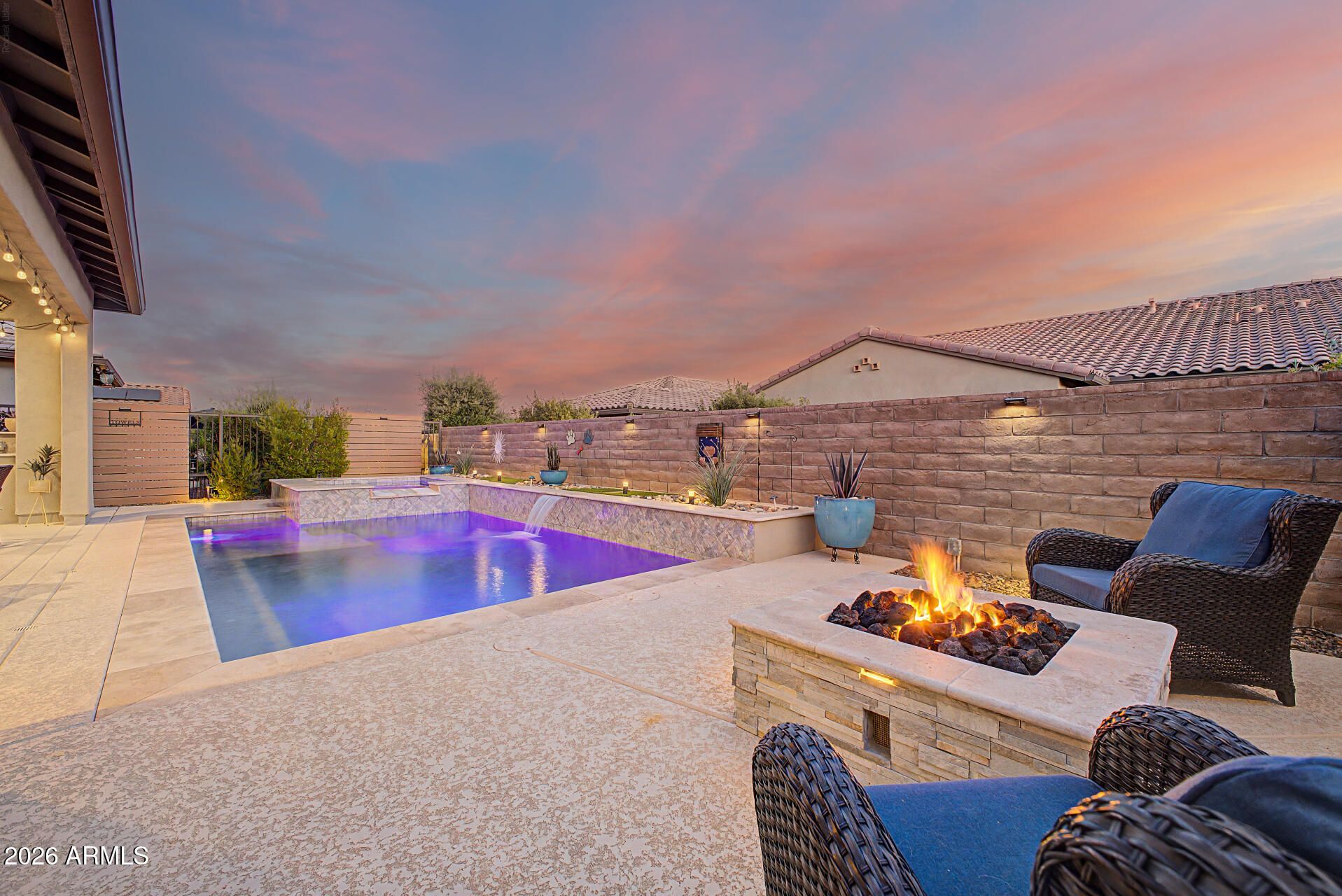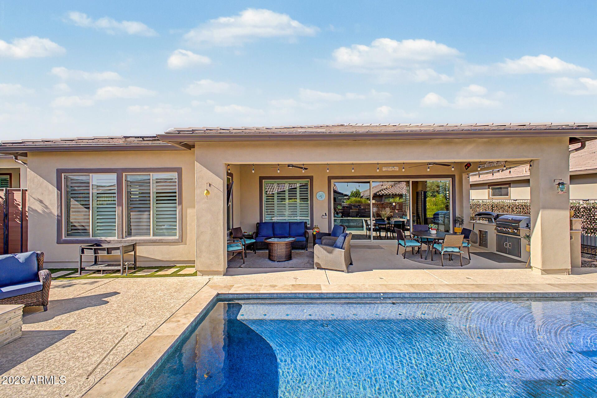 MONTAGE FLOORPLAN AVAILABLE NOW!! Your Dream Home with Owned Solar, Private Heated Pool and SPA, and a 3 Car Tandem Garage w/AC Mini Split is finally available!! This gorgeous residence built in 2022 features a Stunning Stone facade, pristine artificial turf and a custom driveway w/pavers. It includes Two Spacious (Split) Master En Suites with Walk In Closets, all 3 Full Baths are upgraded w/ stunning tile & Quartz c-tops plus an oversized Den/Office with Double Doors. Chef's Kitchen is designed like a Model Home w/Custom Cabinetry, Quartz Countertops w/tile backsplash and a Custom Quartz Island paired w/ SS Gas Appliances, and a SS Hood Vent. The open floorplan showcases high ceilings, recessed lighting, attractive wood look flooring, and classic Plantation Shutters. The Great Room includes a15 ft. Slider that brings the outside in!! It has an exquisite Custom Built Travertine TV/Entertainment Center that includes a 68" Heated Fireplace, Wood mantel, floating shelves, built in Base cabinets with Quartz Countertops. Enjoy gorgeous sunsets in the Resort Style Backyard, complete w/ a covered patio, a warm fire pit for starlit evenings, a built-in BBQ, & a refreshing spa & pool. Top rated resort community for your active lifestyle, Trilogy has it all. Golf, restaurants, TWO club houses, pools and activities galore. This superb home is an entertainer's dream with amazing upgrades and outdoor living.