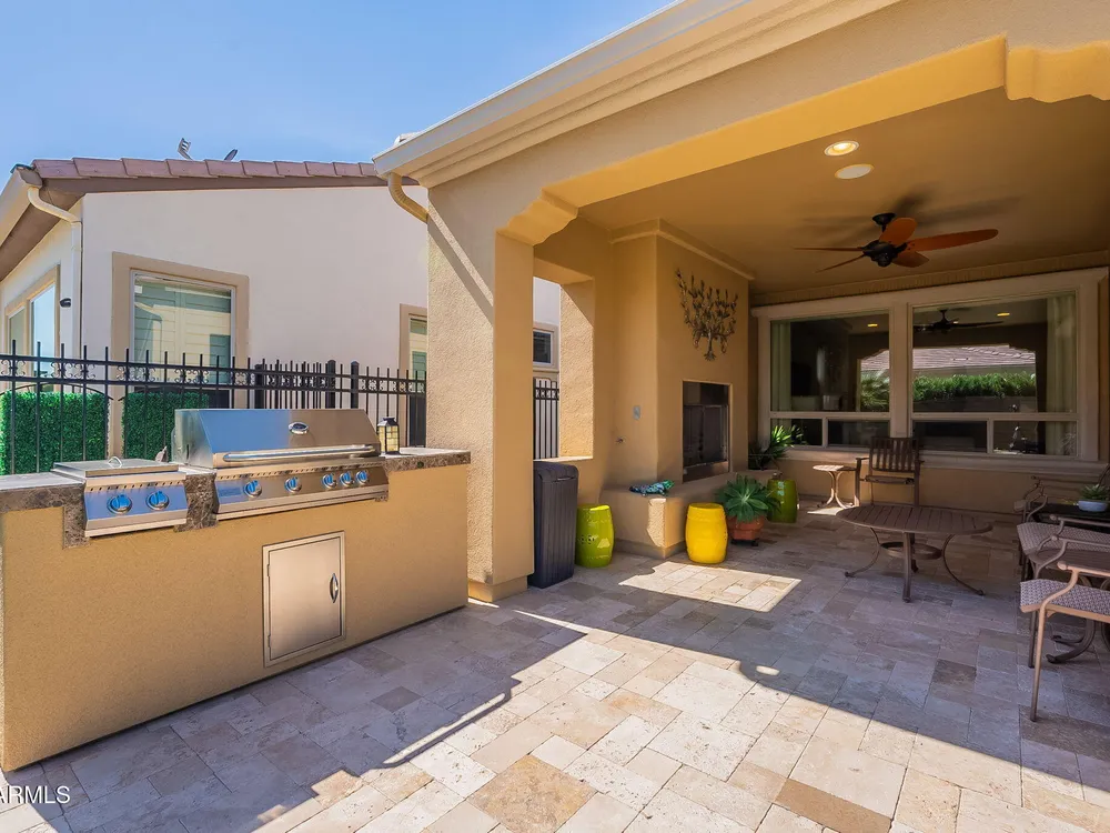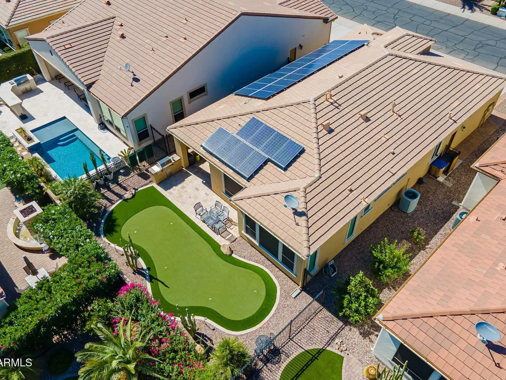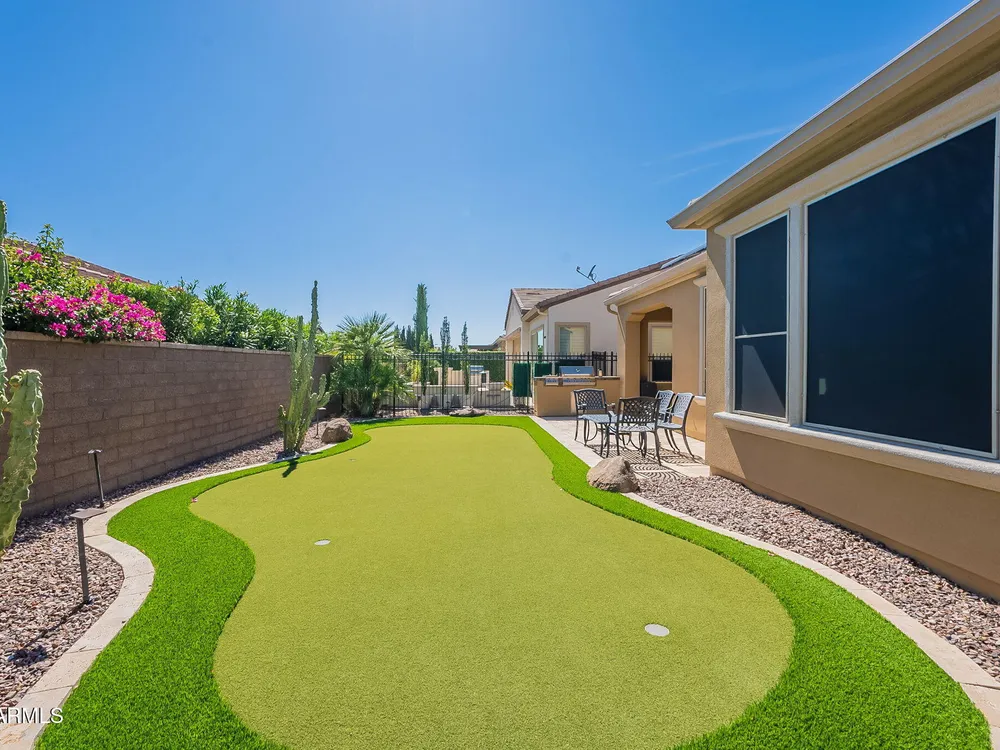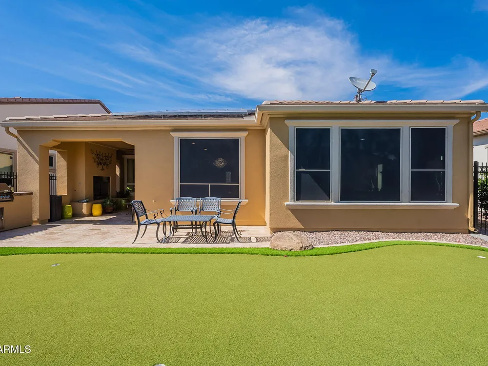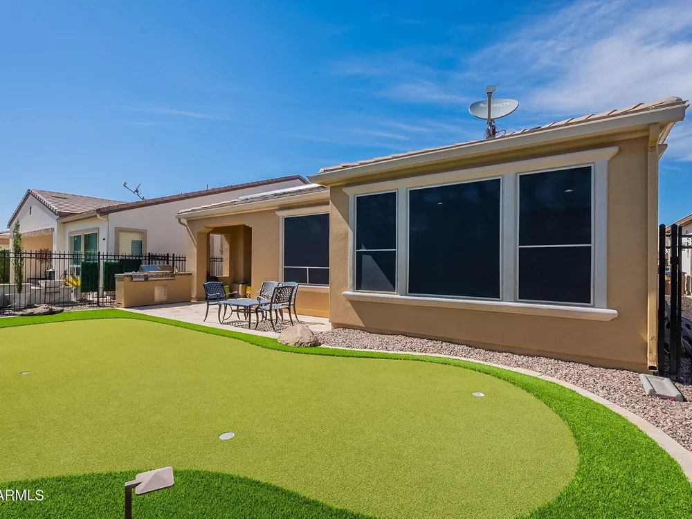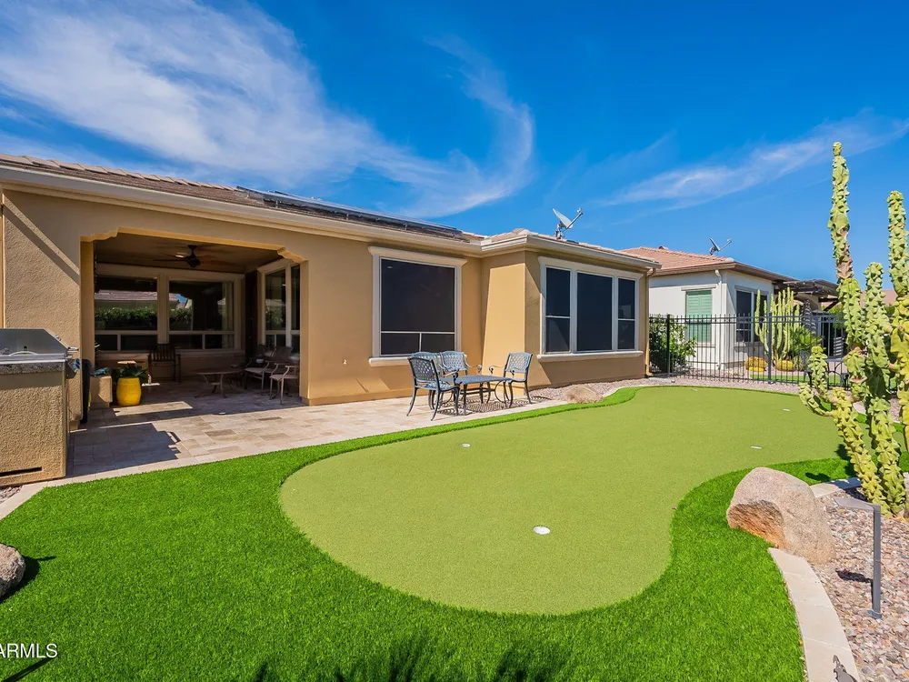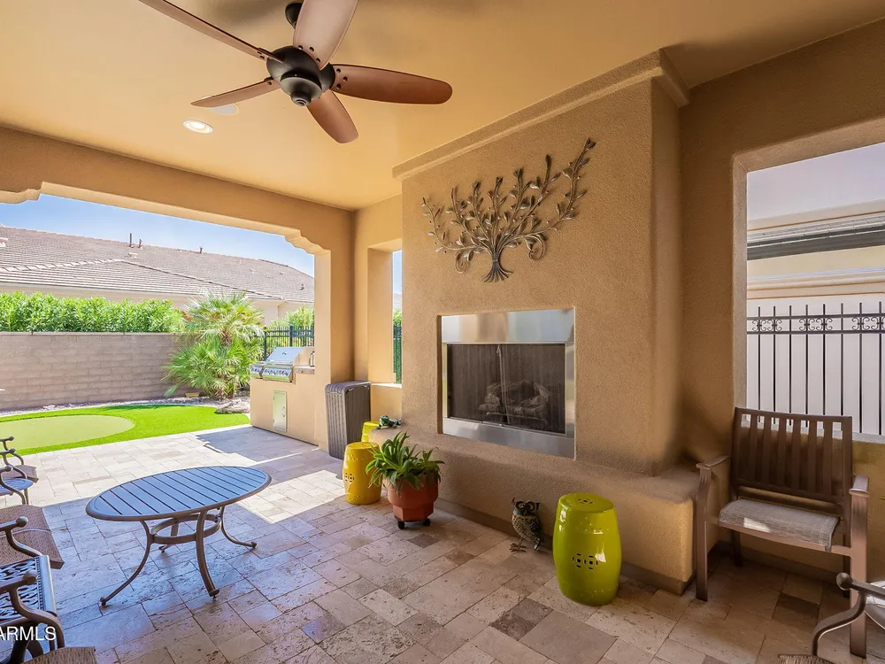 Stunning ''Nice'' model in Encanterra CC with upgrades throughout! From the moment you step through the iron front door, you're welcomed by light-filled, open living spaces and stylish tile flooring through out! Great room concept, open and inviting, chef's kitchen features quartz counters, elegant backsplash, top-tier appliances, and built-in beverage bar. 2 bedrooms plus den with double doors—perfect for guests or office. Spacious primary suite with blackout shades and dual sinks. Large smart space/laundry room with extra storage. Garage includes great built-ins. Backyard retreat offers a putting green, covered patio, cozy fireplace, and built-in BBQ with extra burners making entertaining a breeze, or enjoying with coffee or a cocktail! Paid solar too—walk in and fall in love!