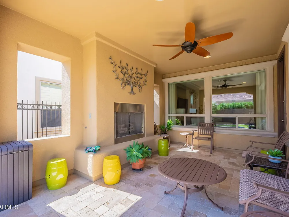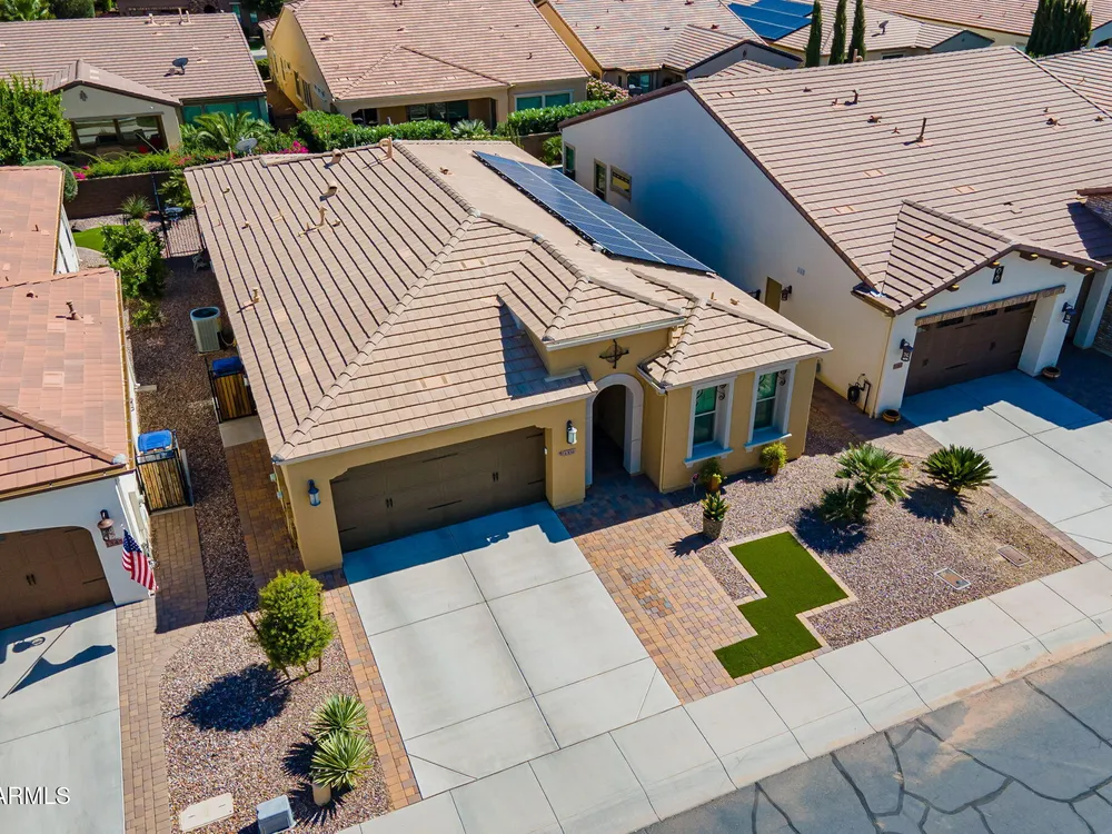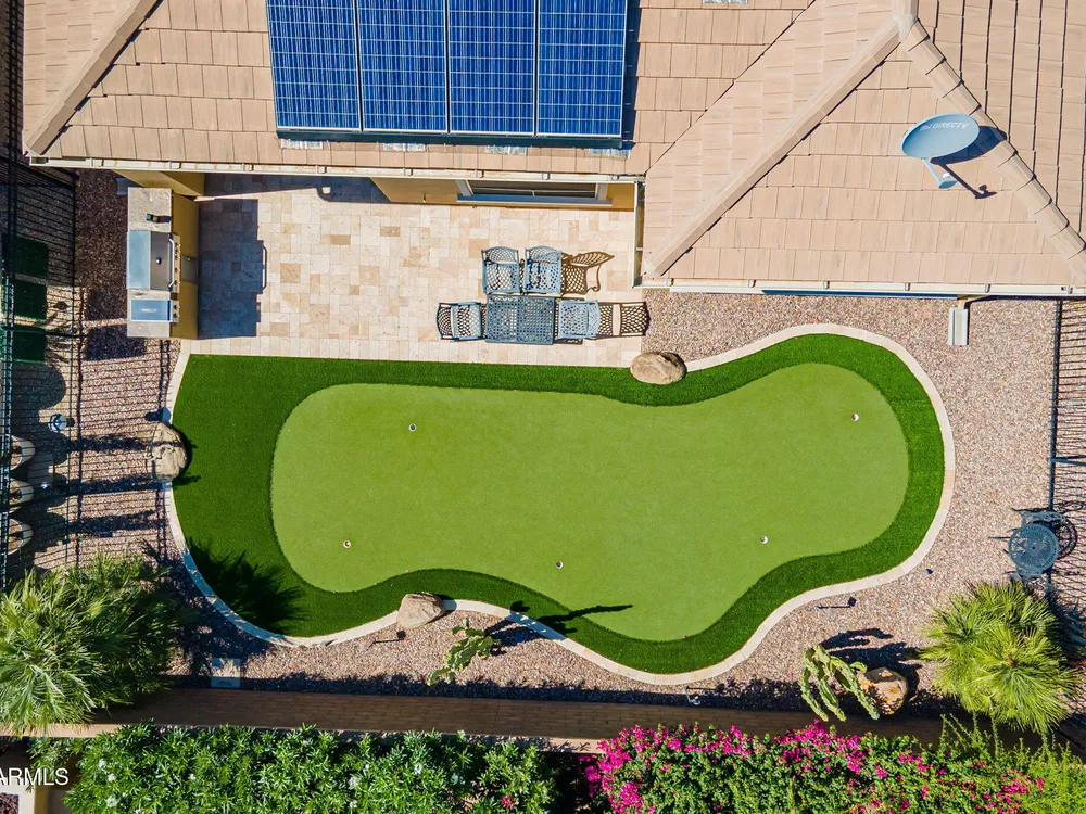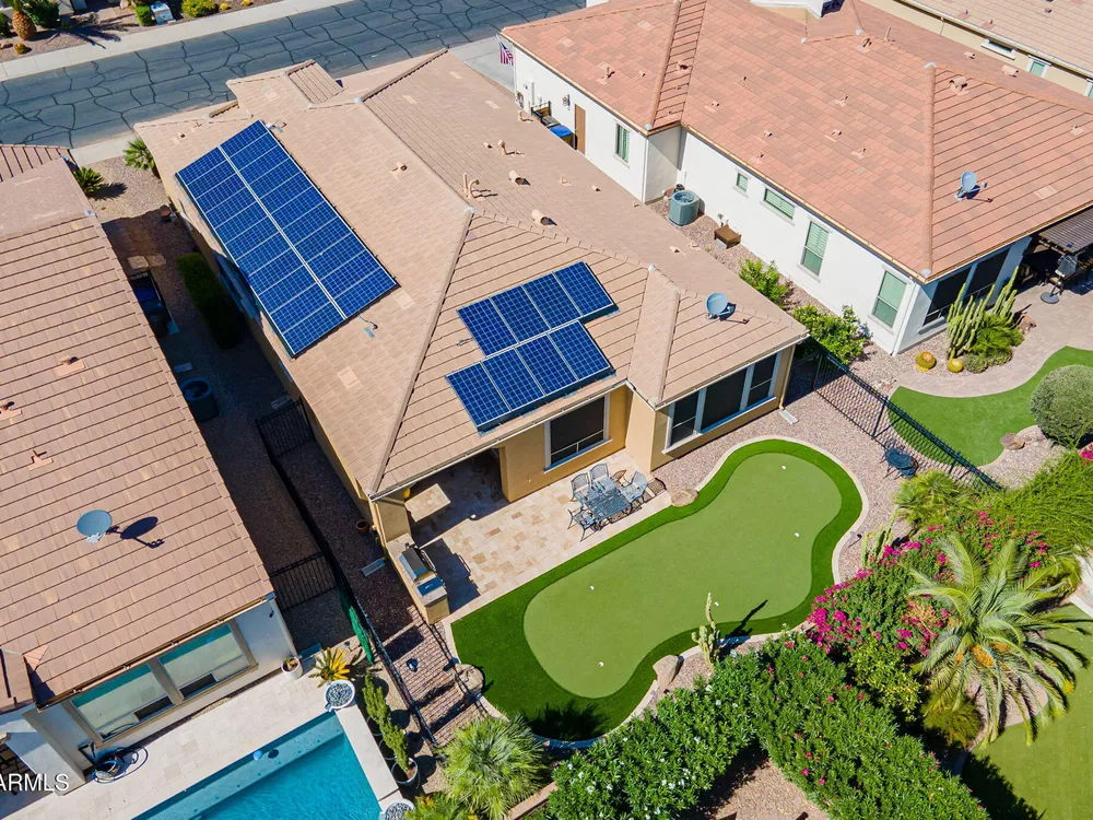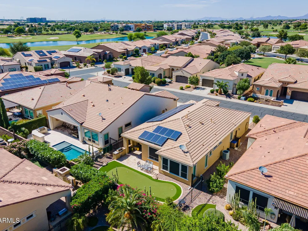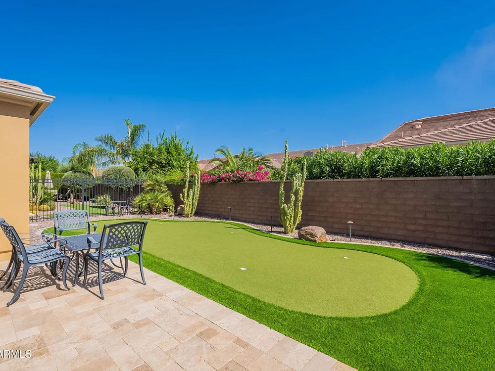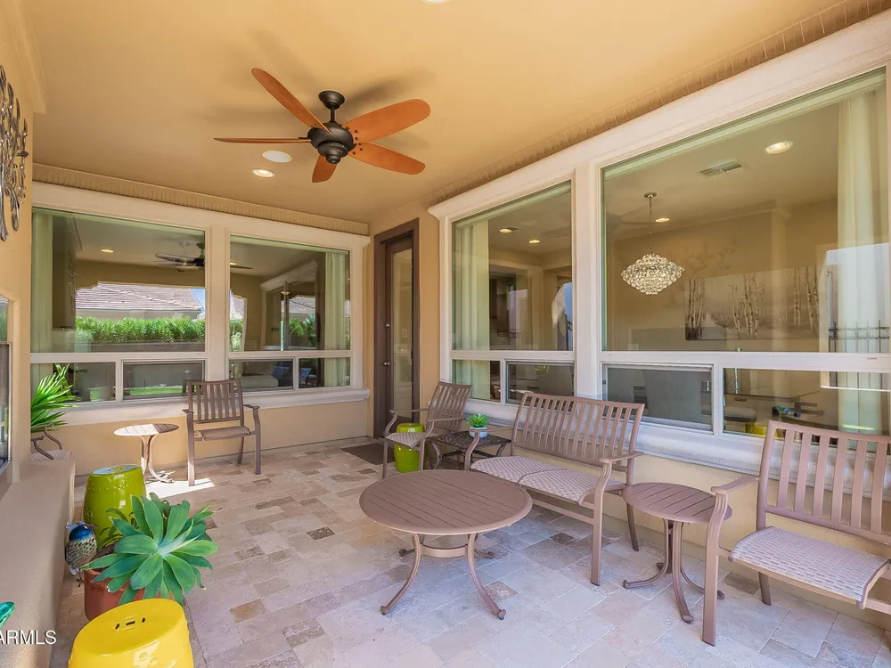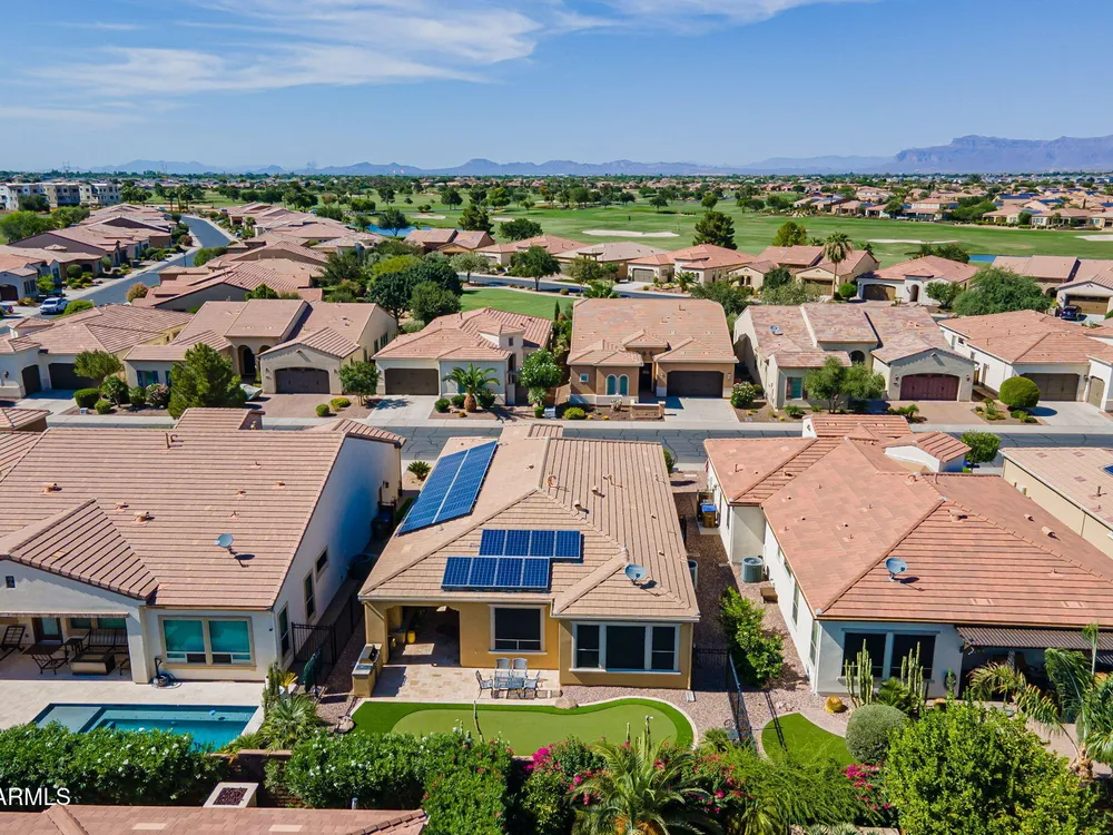 Stunning ''Nice'' model in Encanterra CC with upgrades throughout! From the moment you step through the iron front door, you're welcomed by light-filled, open living spaces and stylish tile flooring through out! Great room concept, open and inviting, chef's kitchen features quartz counters, elegant backsplash, top-tier appliances, and built-in beverage bar. 2 bedrooms plus den with double doors—perfect for guests or office. Spacious primary suite with blackout shades and dual sinks. Large smart space/laundry room with extra storage. Garage includes great built-ins. Backyard retreat offers a putting green, covered patio, cozy fireplace, and built-in BBQ with extra burners making entertaining a breeze, or enjoying with coffee or a cocktail! Paid solar too—walk in and fall in love!