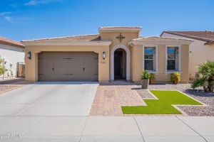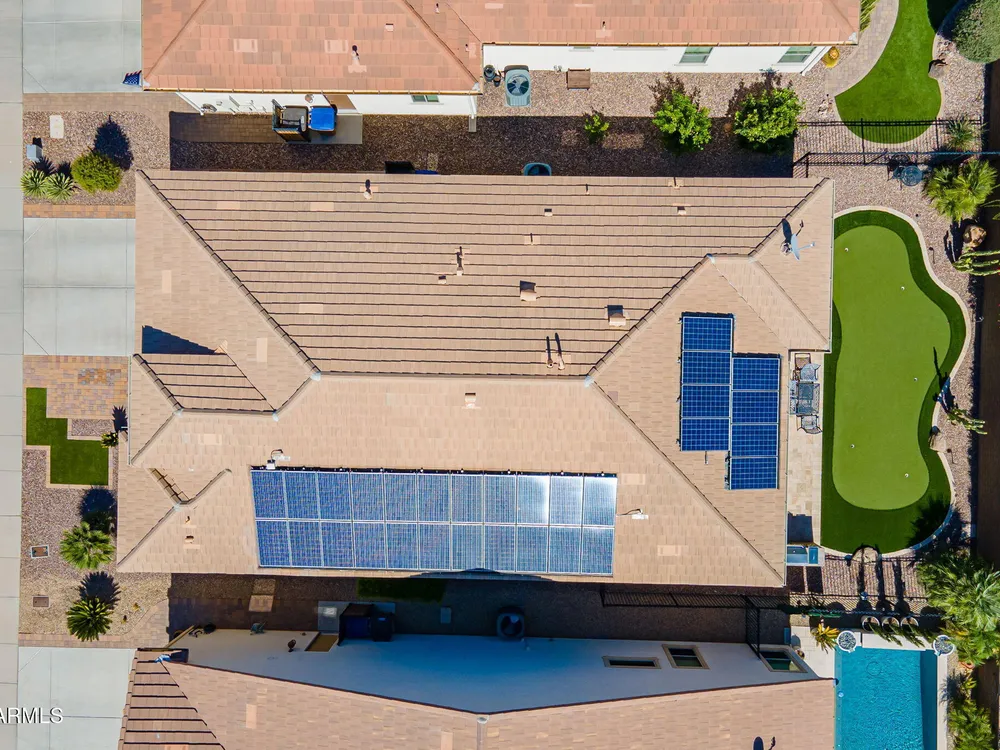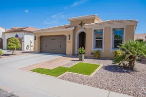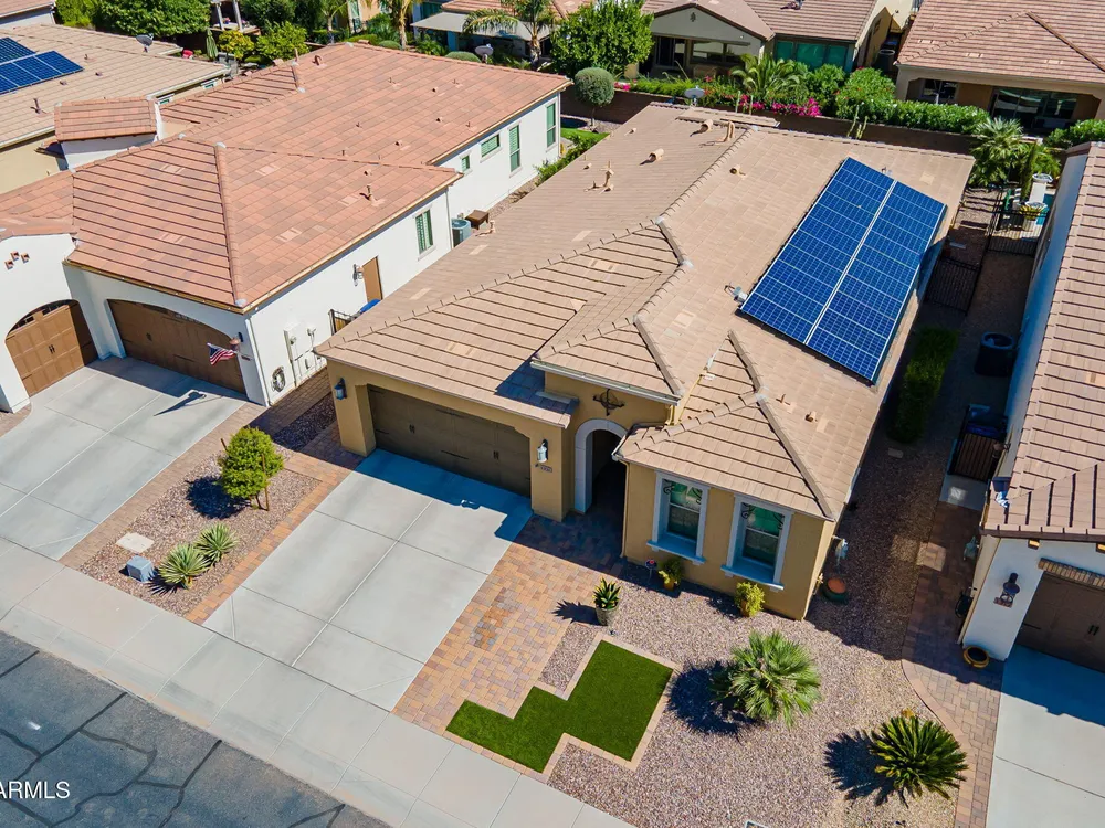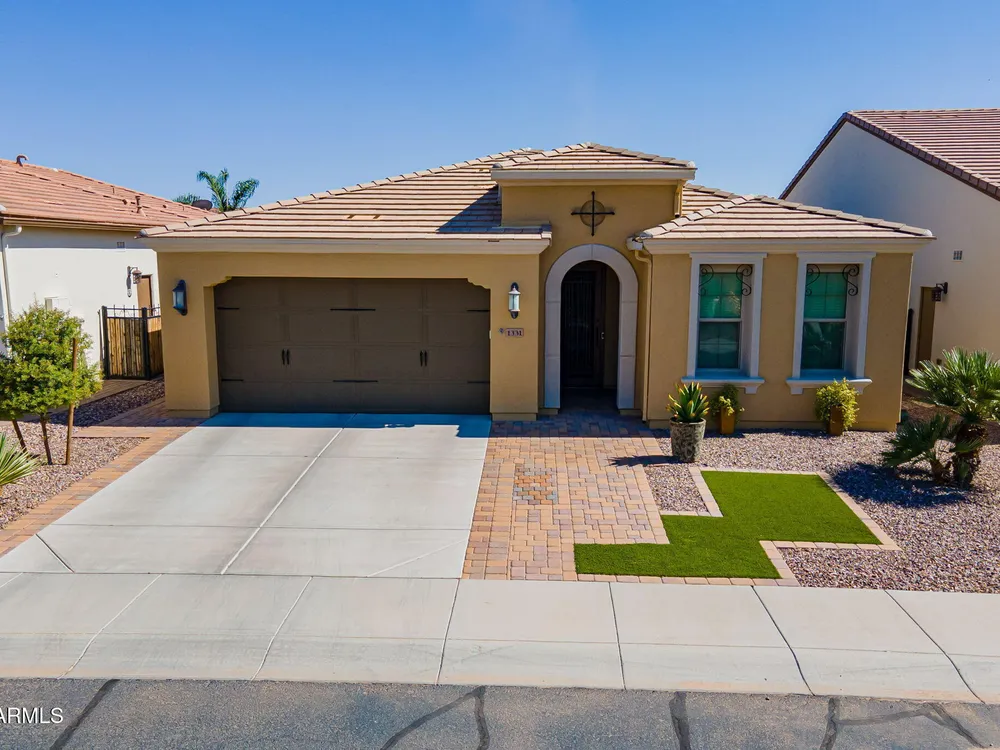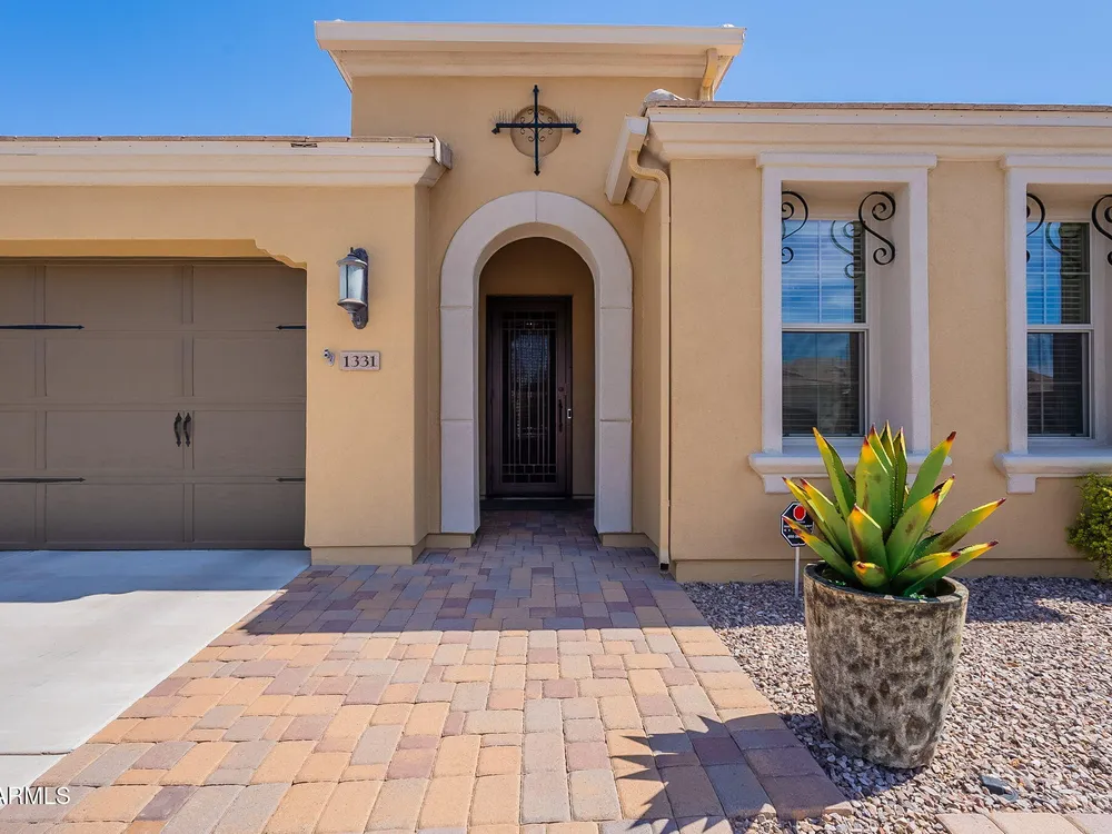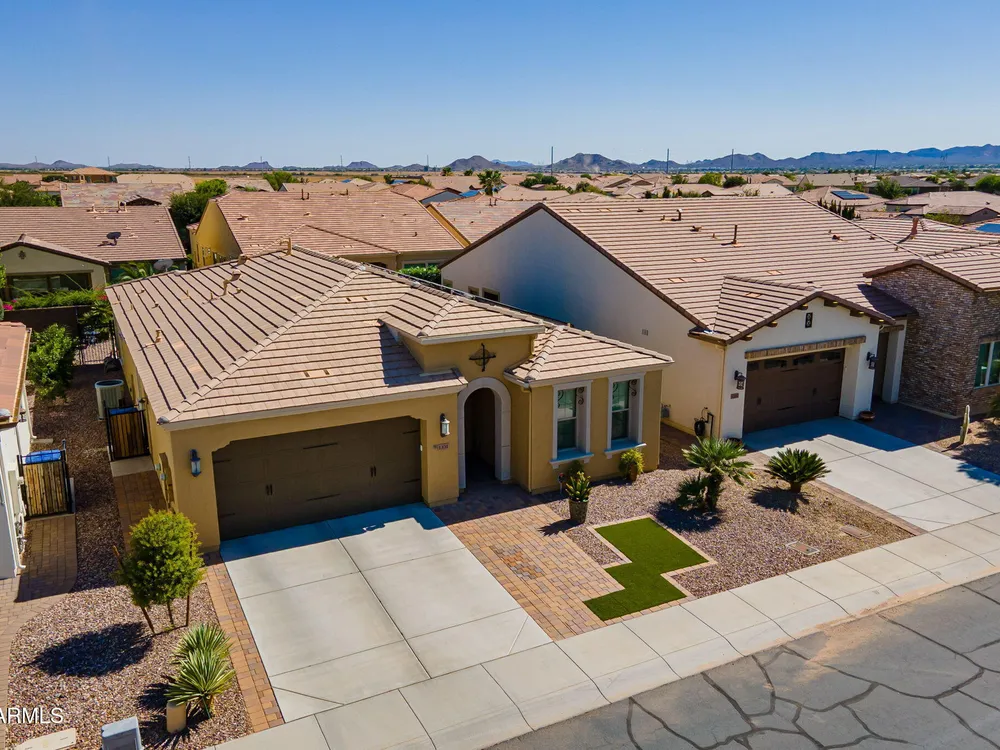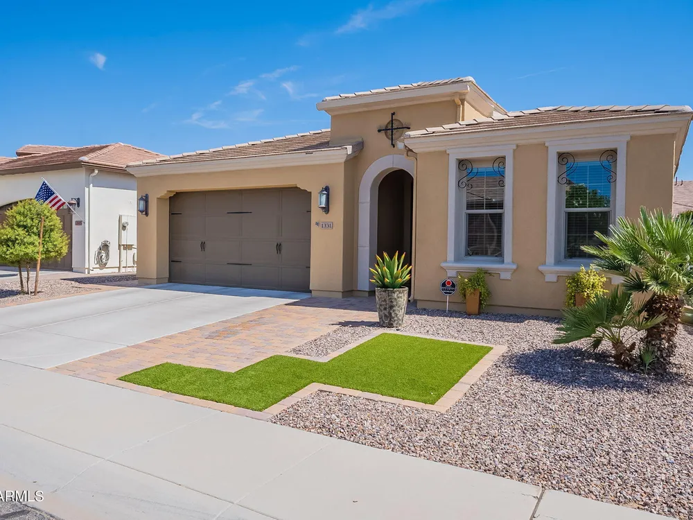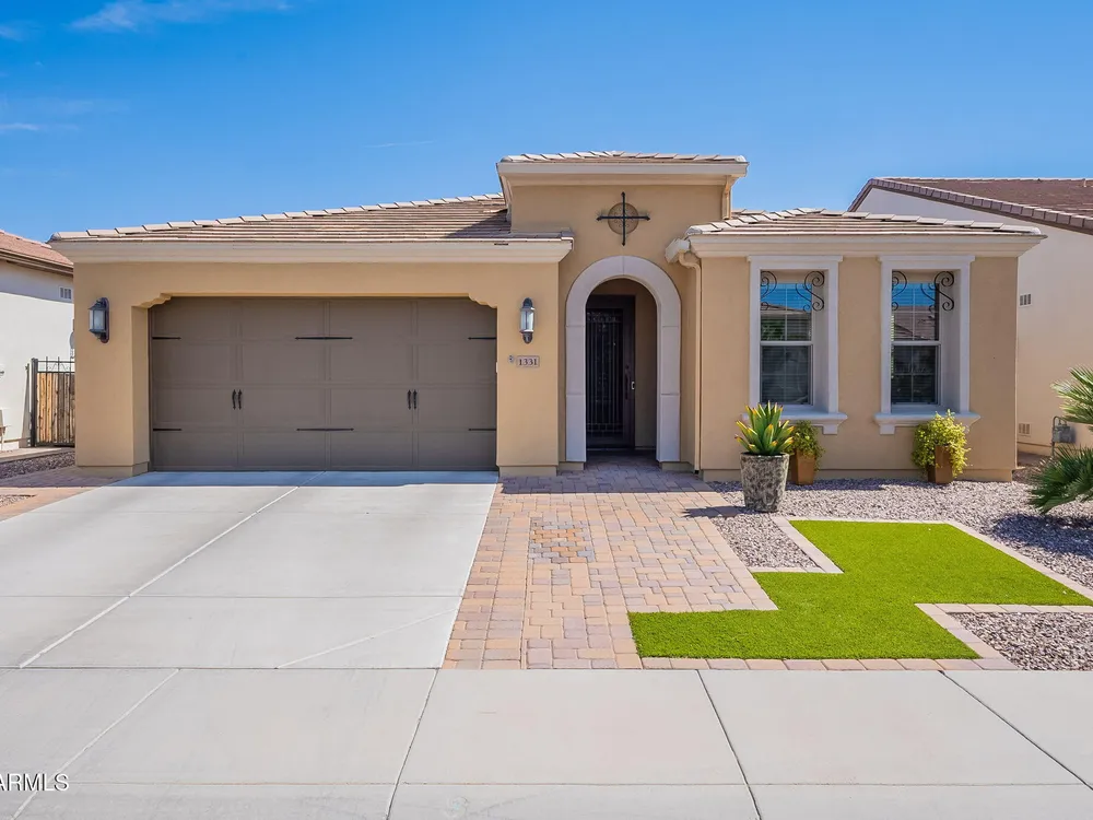 Stunning ''Nice'' model in Encanterra CC with upgrades throughout! From the moment you step through the iron front door, you're welcomed by light-filled, open living spaces and stylish tile flooring through out! Great room concept, open and inviting, chef's kitchen features quartz counters, elegant backsplash, top-tier appliances, and built-in beverage bar. 2 bedrooms plus den with double doors—perfect for guests or office. Spacious primary suite with blackout shades and dual sinks. Large smart space/laundry room with extra storage. Garage includes great built-ins. Backyard retreat offers a putting green, covered patio, cozy fireplace, and built-in BBQ with extra burners making entertaining a breeze, or enjoying with coffee or a cocktail! Paid solar too—walk in and fall in love!