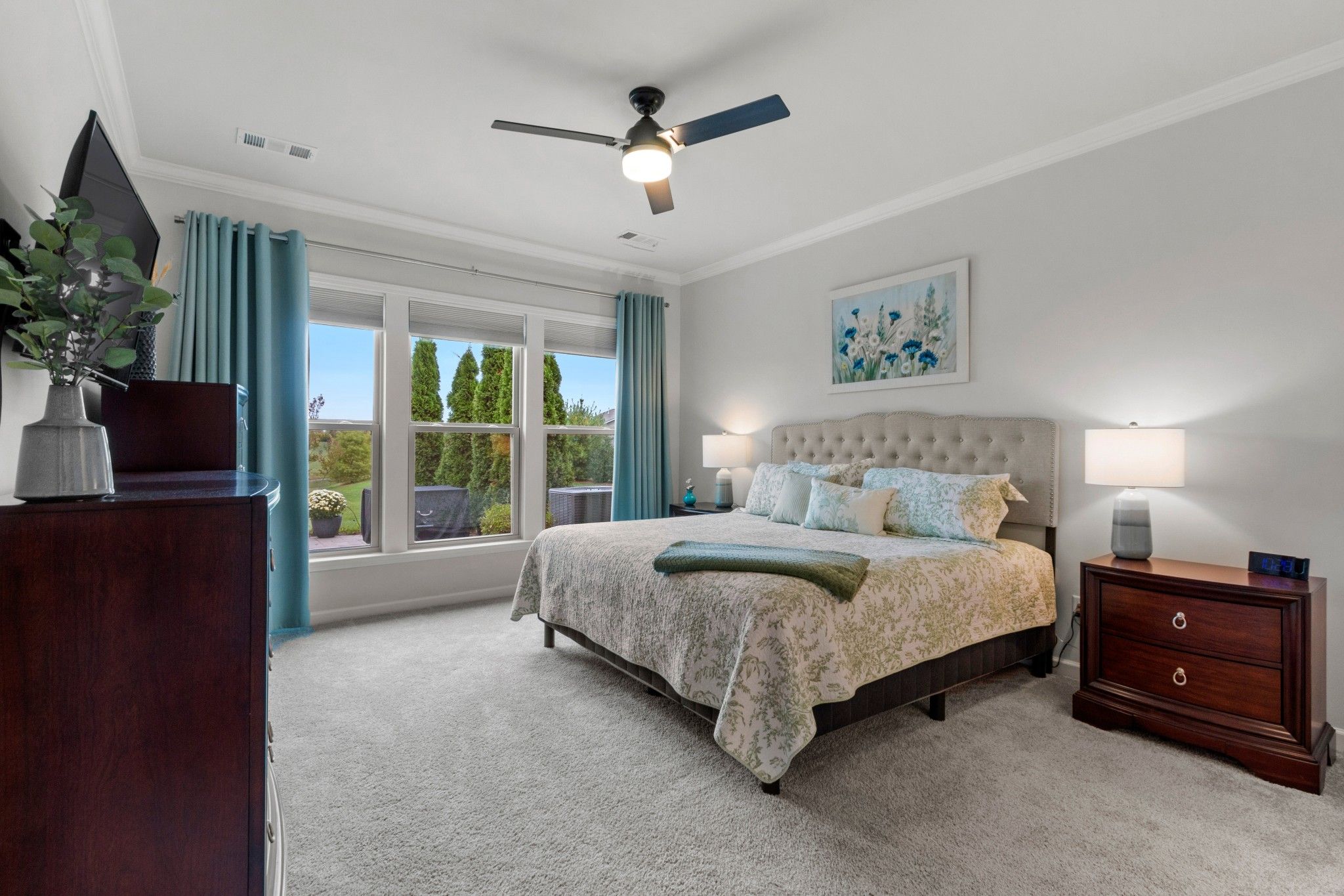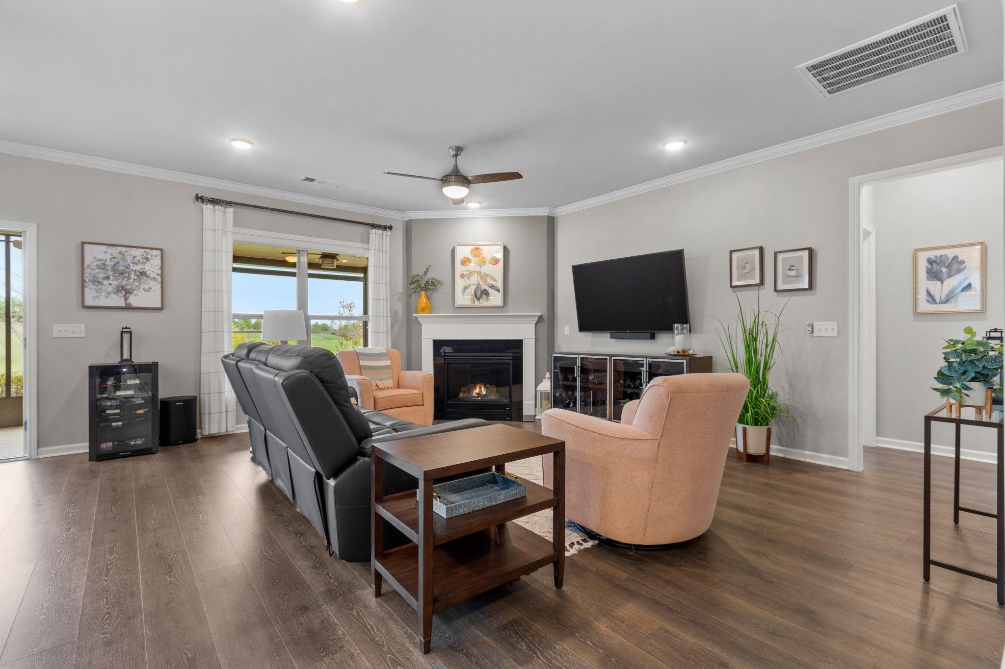 Beautiful backyard with scenic water views. Step outside and enjoy this stunning backyard featuring a gently sloping lawn that leads to a peaceful pond lined with mature trees. The open green space offers plenty of room for outdoor entertaining, gardening, or simply relaxing while taking in the tranquil water reflections and colorful seasonal foliage. The well-maintained grass and picturesque surroundings provide the perfect blend of beauty and serenity-ideal for quiet mornings, evening walks, or family gatherings.Enjoy your morning coffee on the large lanai. Open concept living with crown moulding, great room with gas log burning fireplace.Upgraded kitchen with quartz countertops, gas stove, generous island for food prep and entertaining as well as a separate pantry. Flex room can be used as an office, craft room, library, music room, or 3rd main floor sleeping area. Laundry room with additional storage cabinets and laundry sink. Primary bedroom has lots of natural light and has an ensuite bath with double sink vanities, walk-in shower, separate water closet, and large primary closet. Upstairs is the 3rd bedroom or bonus room with walk-in attic access for the ultimate in storage. Garage has epoxy floor coating and 4 ft extension leaving plenty of space for a golf cart or workshop area. Lawn is beautifully landscaped and has irrigation system. The community has both indoor and outdoor pools, pickle ball and tennis courts, gas fire pit, pavilion with gas grills and patio tables, clubhouse with fitness center and fitness classes, ball rooms, kitchen, conference room, card/game room, massage room, men's and women's locker rooms, and a dog park. Over 70 clubs and special interest groups, special programs, presentations, concerts, Southern Springs choir and band, as well as photography, painting, quilting, solo clubs, coffee club, Veteran's club, and so much more. Living in Southern Springs is like vacationing at a very active resort. Thirty-five minutes to/from BNA.