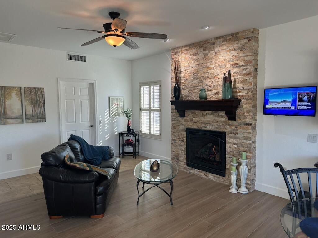 Stunning upscale remodeled home between 18th & 19th tee ON HILLCREST GOLF COURSE w/ mountain views & no backyard neighbors! 2 bedroom plus den (has Lazy Boy sofa/bed) & family room (open to kitchen), 2 car garage. Handicap accessible. Furnished, move in ready as primary, secondary residence or investor vacation rental. Upgrades galore, 2020- 2024 including tile & luxury vinyl laminate flooring, ceiling height cabinets, walk-in tile showers, master whirlpool tub, vessel sinks, quartzite counters, new baseboards, appliances, washer & dryer, Anderson windows/ patio doors & cultured stone gas fireplace. Cultured stone exterior accents in front & back. Tiled exterior back patio. 2022 Solar is owned. 2023 A/C & furnace. Age restricted w/5 rec facilities (pools, spas, bowling, golf & more!