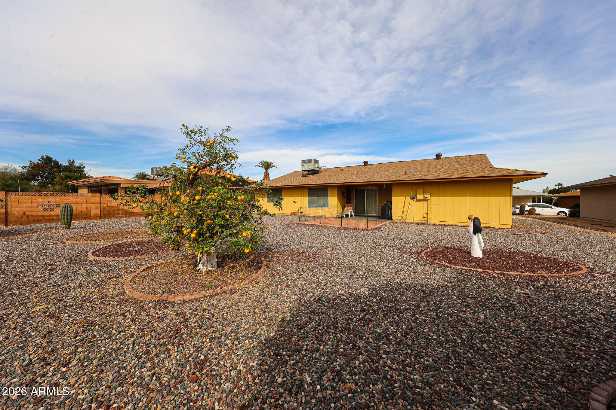 LOOKING FOR A HOME WITH AN EXTRA LARGE GARAGE? THIS HOME HAS IT, ALONG WITH 2 BEDROOM AND 2 BATHS. ROOF WAS DONE IN 2025. Wood blinds and sun-screens on all windows. A/C new in 2020; exterior painting new in 2020; garage door new in 2020; water heater new in 2019; carpet new in 2023; interior paint new in 2023. Orange, pink grapefruit, tangerine and lemon trees makes for a semi-private back yard. Extended patio off the covered patio. Back yard faces south. Less than ½ mile from shopping and recreation center. A comfortable, easily maintained retirement home.