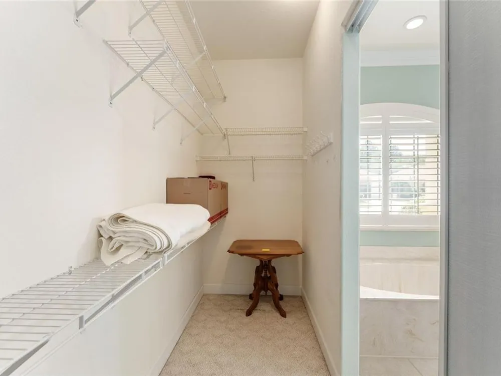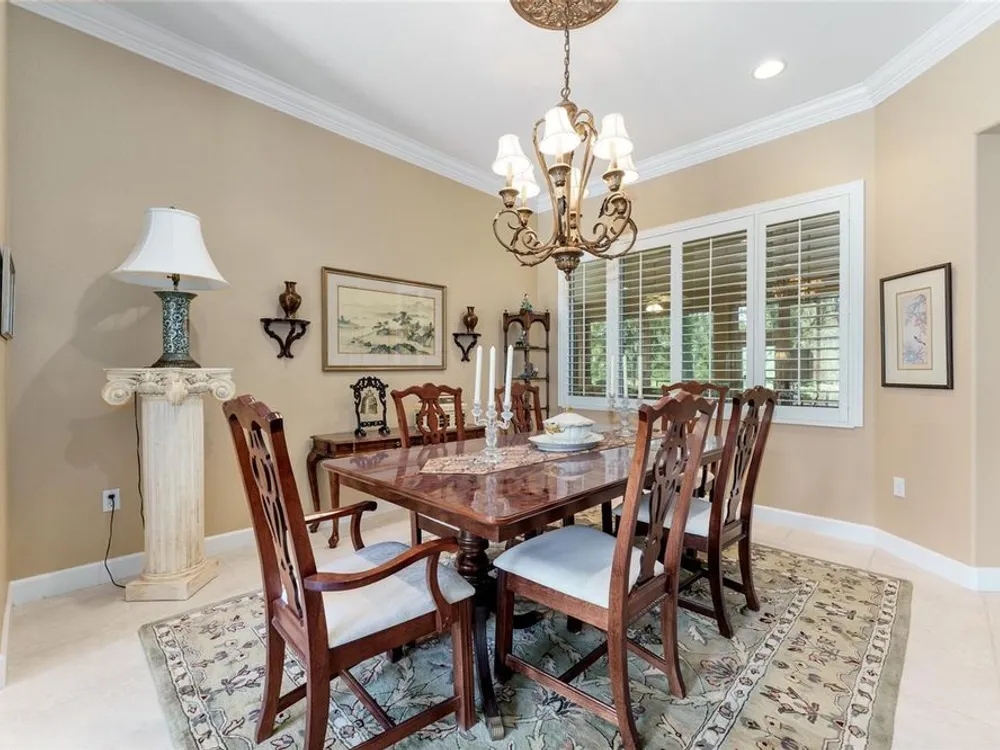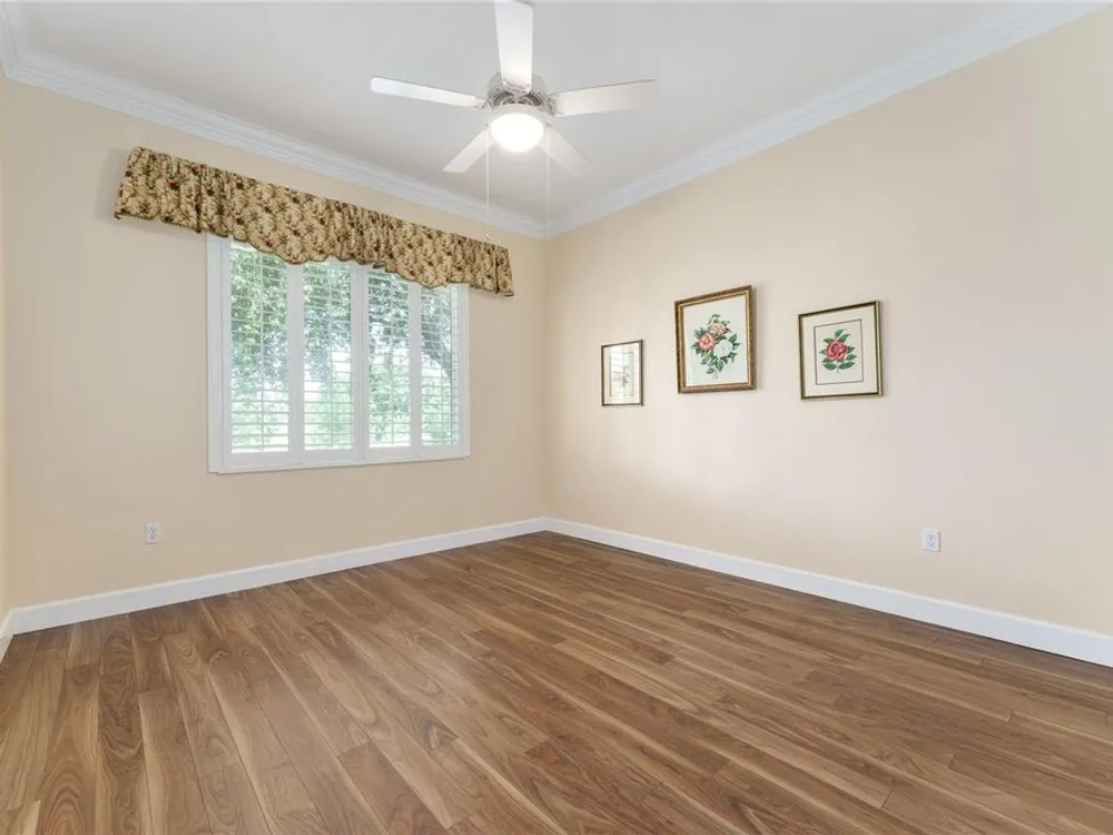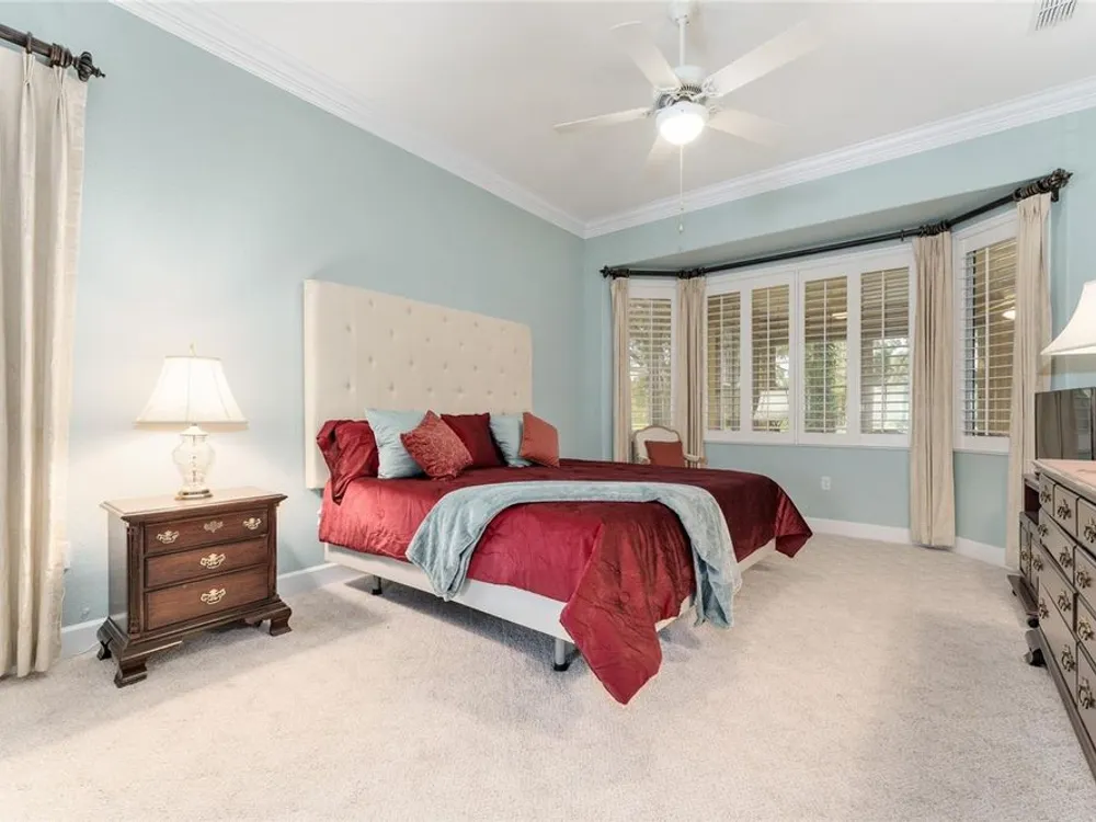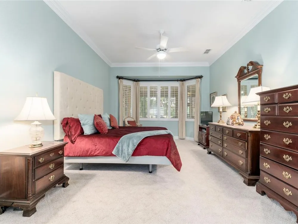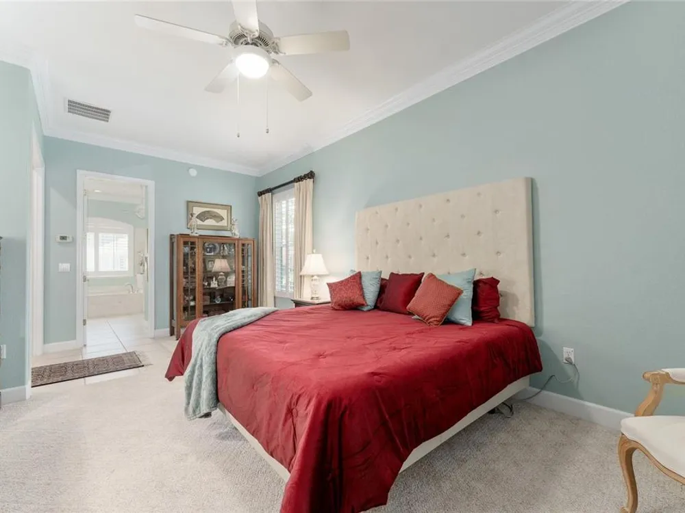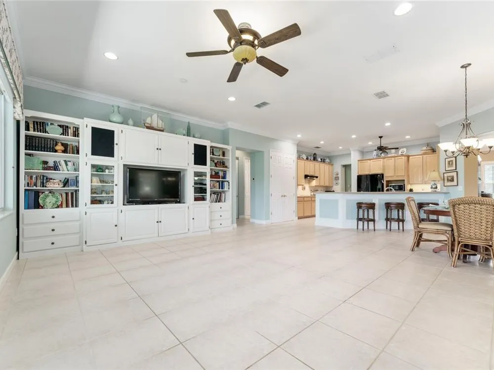- Ceiling Fan(s), Crown Molding, Eat-in Kitchen, High Ceilings, In-Wall Pest Control, Kitchen/Family Room Combo, Living/Dining Room, Open Floorplan, Solid Surface Counters, Split Bedrooms, Thermostat, Walk-In Closet(s), Window Treatments