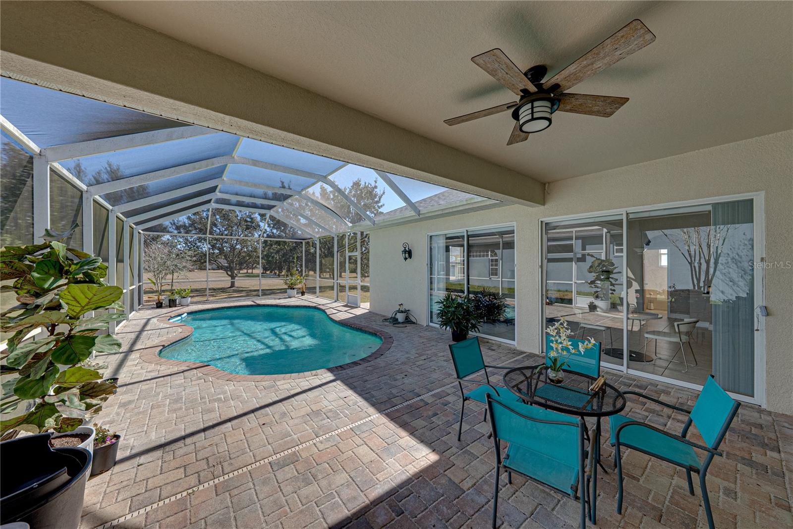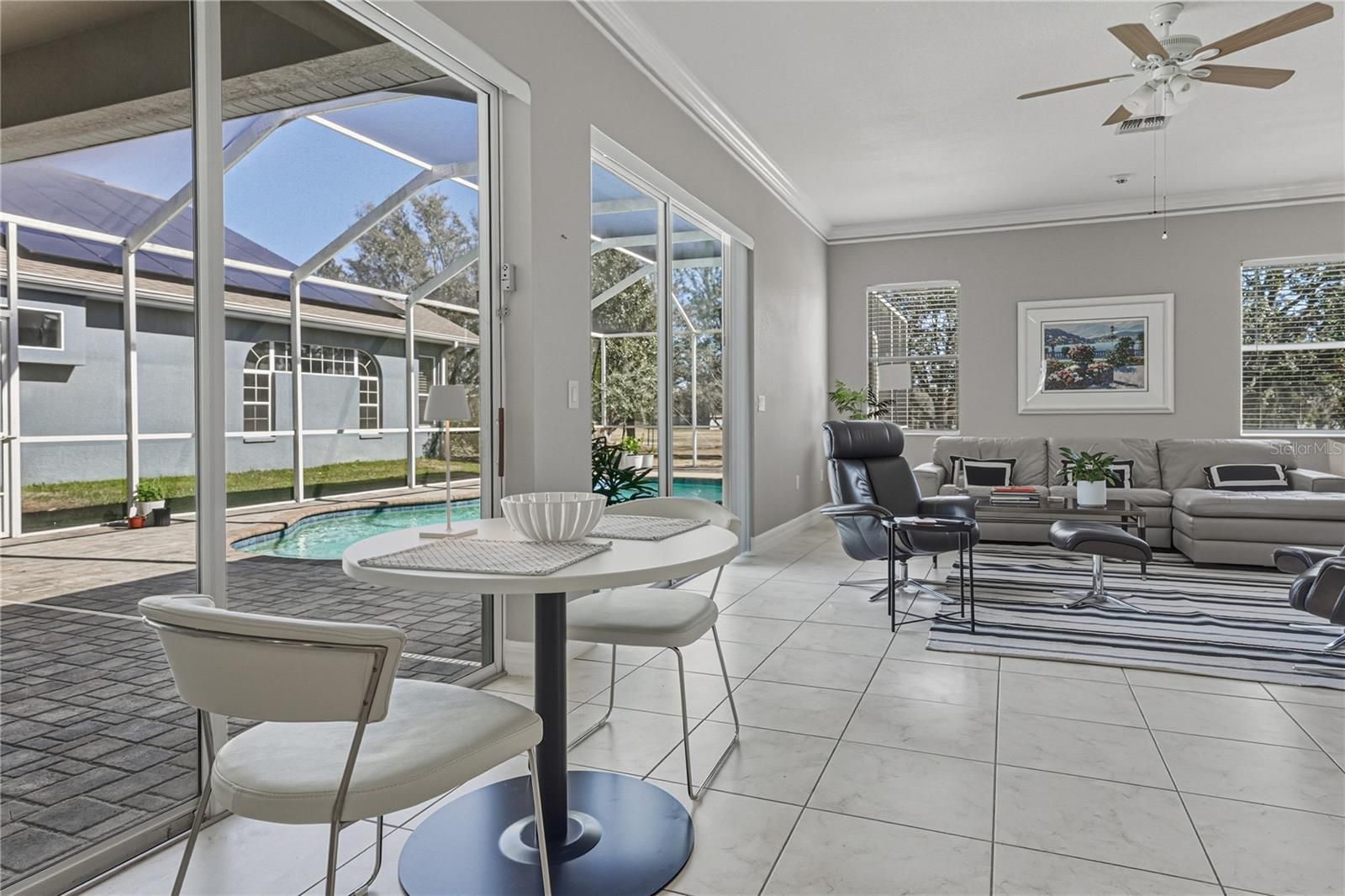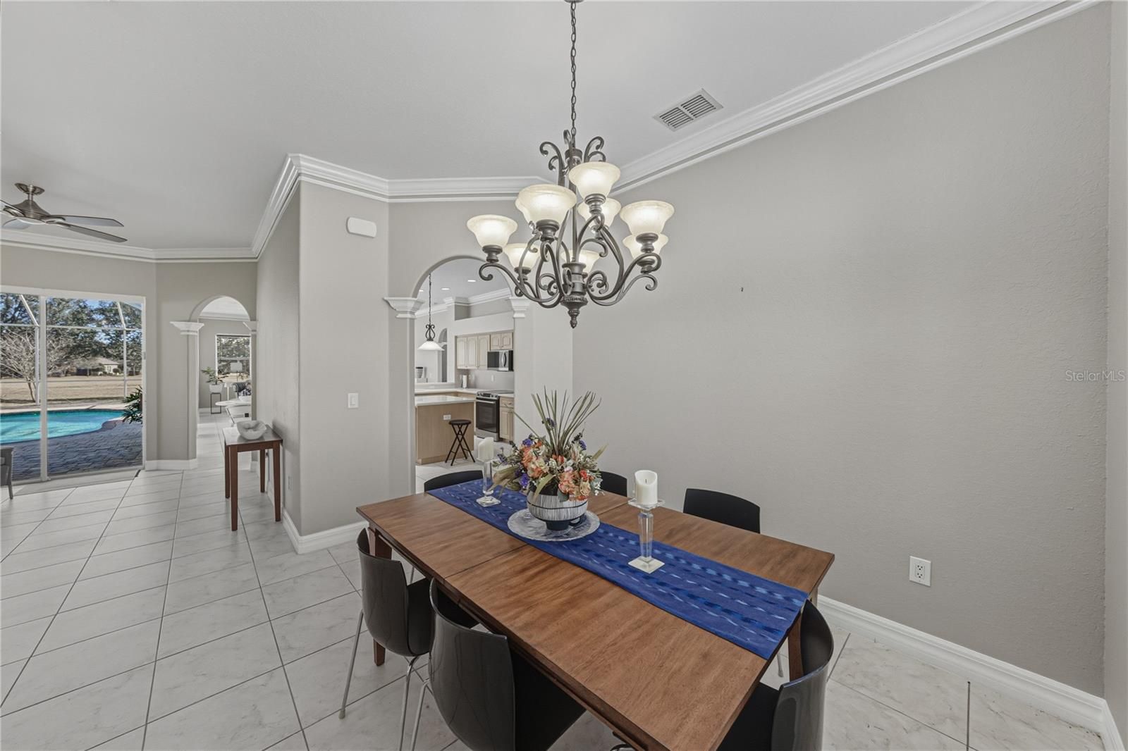 Backing up to Lake Jovita’s walking trails and park, this 3 bedroom, 2 bath pool home pairs a coveted location with fresh updates including a 2024 roof, a newer AC, and a newer water heater- completely ready for effortless Florida living inside the gates of Lake Jovita. Arrival is warm and welcoming with a freshly painted exterior, mature trees, and a paver walkway that leads to a charming front porch made for morning coffees and neighborhood people-watching. Step inside and the layout opens with a paired formal living and dining space at the front of the home, connected enough for gatherings yet still intimate. The formal living room includes sliding doors to the pool, adding natural light and a touch of indoor-outdoor charm. Tile flooring, crown molding, and soft neutral paint carry through the main living areas, guiding you toward the true heart of the home: an expansive family room and kitchen designed as one bright, open space with multiple sliders, welcoming in sunshine and framing sparkling pool views. The kitchen is thoughtfully arranged with ample solid-surface prep space, a central island, breakfast bar seating, new stainless steel appliances, generous pantry storage, and a cozy eat-in dinette, ideal for casual meals with a view. A split bedroom layout keeps the primary suite tucked away for privacy. Wood flooring, direct pool access, and two spacious walk-in closets set the stage for comfort, while the ensuite features dual sinks and a walk-in shower. Bedrooms two and three sit on the opposite side of the home with a full bath between them, complete with a tub/shower combination. Outdoors, the lanai invites you to slow down and savor the Florida lifestyle. Pavers surround the sparkling pool, and a covered sitting area offers shade for relaxing afternoons or outdoor dining. Beyond the screened enclosure, the backyard connects directly to Lake Jovita’s scenic walking trails and park amenities, including pickleball, basketball, and a playground, all just steps away. Optional memberships are available as well, offering access to Lake Jovita’s two 18-hole golf courses, fitness center, clubhouse, Jr. Olympic size swimming pool, tennis courts, and more! Call today to schedule your private showing and experience Lake Jovita living at its best.