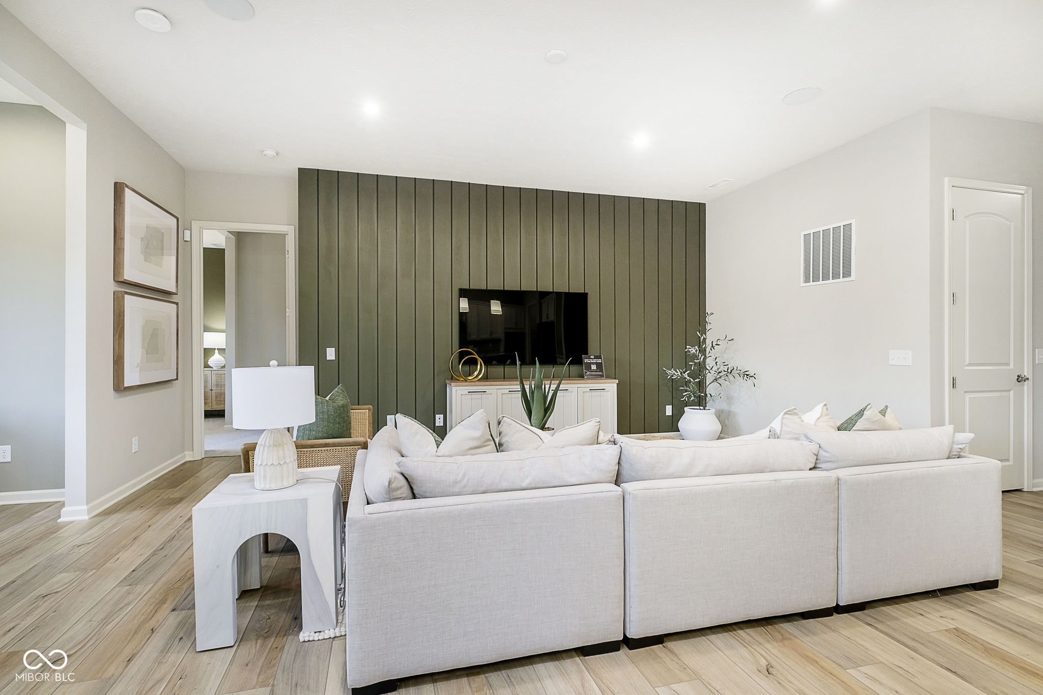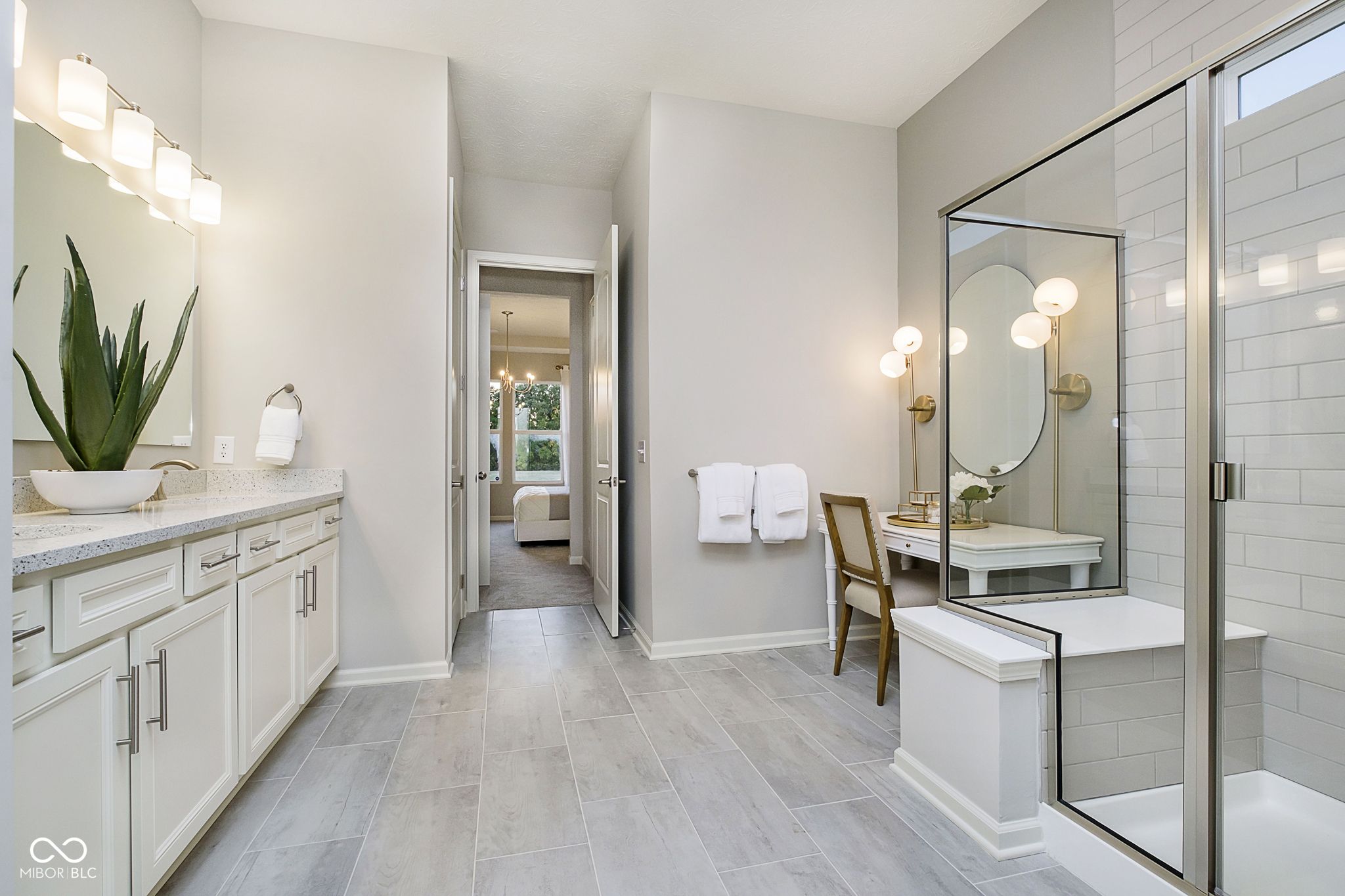 Step into the thoughtfully designed Prestige floor plan at Finch Creek by Del Webb, where style meets functionality and convenience. The heart of the home is the gourmet kitchen, boasting 42" white cabinets, Cashmere Taj 3 cm quartz countertops, a tile backsplash, and stainless steel built-in oven and microwave and gas cooktop. Perfectly positioned, the kitchen flows seamlessly into the gathering room and dining cafe area which opens onto a patio-ideal for entertaining or relaxing. A flex room with doors provides versatile space for an office, hobby room, or quiet retreat. The owner's suite is a true haven, featuring an en-suite bath with quartz countertops and tiled walk-in shower, complete with luxurious tile finishes. Guests will appreciate the privacy of the second bedroom, which includes its own en-suite bath. The extended finished garage offers ample storage, perfect for stowing seasonal items or creating a workshop space. The Finch Creek by Del Webb community is where lifestyle takes center stage. Residents enjoy TV streaming and internet included, plus convenient seasonal opening and closing of irrigation systems. The resort-style amenities include indoor and outdoor pools, a state-of-the-art fitness center, pickleball and bocce ball courts, and a clubhouse featuring social programming led by a full-time Lifestyle Director. A high-tech simulation room offers virtual golf and other sports, while 8.5 miles of walking trails, pocket parks, and a dog park encourage an active, outdoor lifestyle. Ideally located just minutes from I-69, Hamilton Town Center, top-rated hospitals, golf courses, and downtown Noblesville, Finch Creek by Del Webb offers the perfect blend of tranquility, activity, and convenience. Photos of similar model.