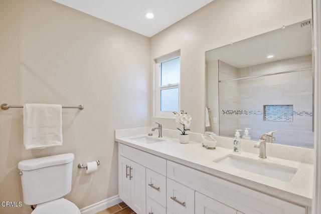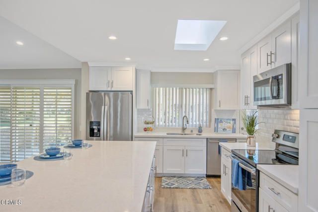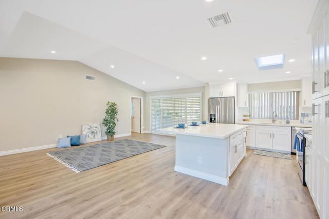 Absolutely gorgeous, fully-upgraded El Dorado model--nearly 1,500 square feet of light & bright living space--ideally located on a quiet cul-de-sac just a short walk to the Recreation Center in Camarillo's most popular 55+ community, Leisure Village! Pride of ownership shines from the moment you arrive, starting with the stunning inlaid-glass entry door and continuing throughout this exceptionally redesigned home.Walls have been thoughtfully removed to create a true open-concept great room, blending the kitchen, living, dining, and den areas into one spacious, light-filled gathering space. The entertainer's kitchen features white shaker cabinets, crisp white quartz countertops, a huge center island, stylish tile backsplash, stainless steel appliances, and a skylight that fills the room with natural light. Additional upgrades include dual-pane windows, recessed lighting in every room, paneled interior doors, and luxury vinyl plank flooring throughout.The living room is bright and inviting with a vaulted ceiling and plantation shutters. The front room offers great flexibility--perfect as an office, workout area, or TV room. The spacious primary bedroom features plantation shutters, a walk-in closet, and a beautifully updated en-suite bathroom with a roll-in tiled shower, dual sinks, and modern vanity. The second bedroom is generously sized, and the hall bathroom offers a large quartz vanity and a walk-in tiled shower with glass enclosure. You'll also appreciate the interior laundry room with built-in cabinetry and direct access inside from the attached garage.Enjoy Camarillo's beautiful weather on the large private patio with block wall, partial cover, and peaceful greenbelt views--ideal for relaxing or entertaining.HOA dues include: water, sewer, trash, cable TV, internet, exterior maintenance, roof, landscaping, 24-hour guarded security, and all community amenities.Leisure Village amenities include: a 9-hole par-3 golf course, pool & spa, fitness center, pickleball, tennis, billiards, woodshop, ceramics, library, RV parking, and dozens of clubs, activities, and events.A prime location close to the Recreation Center makes this home even more desirable. Don't miss this exceptional opportunity which doesn't come around very often!