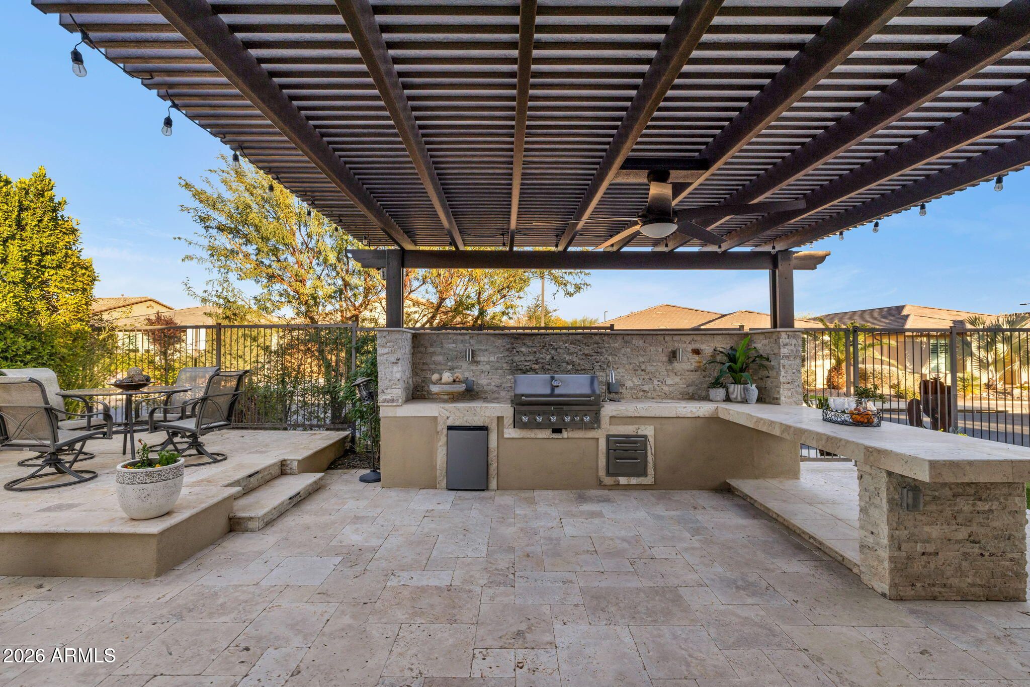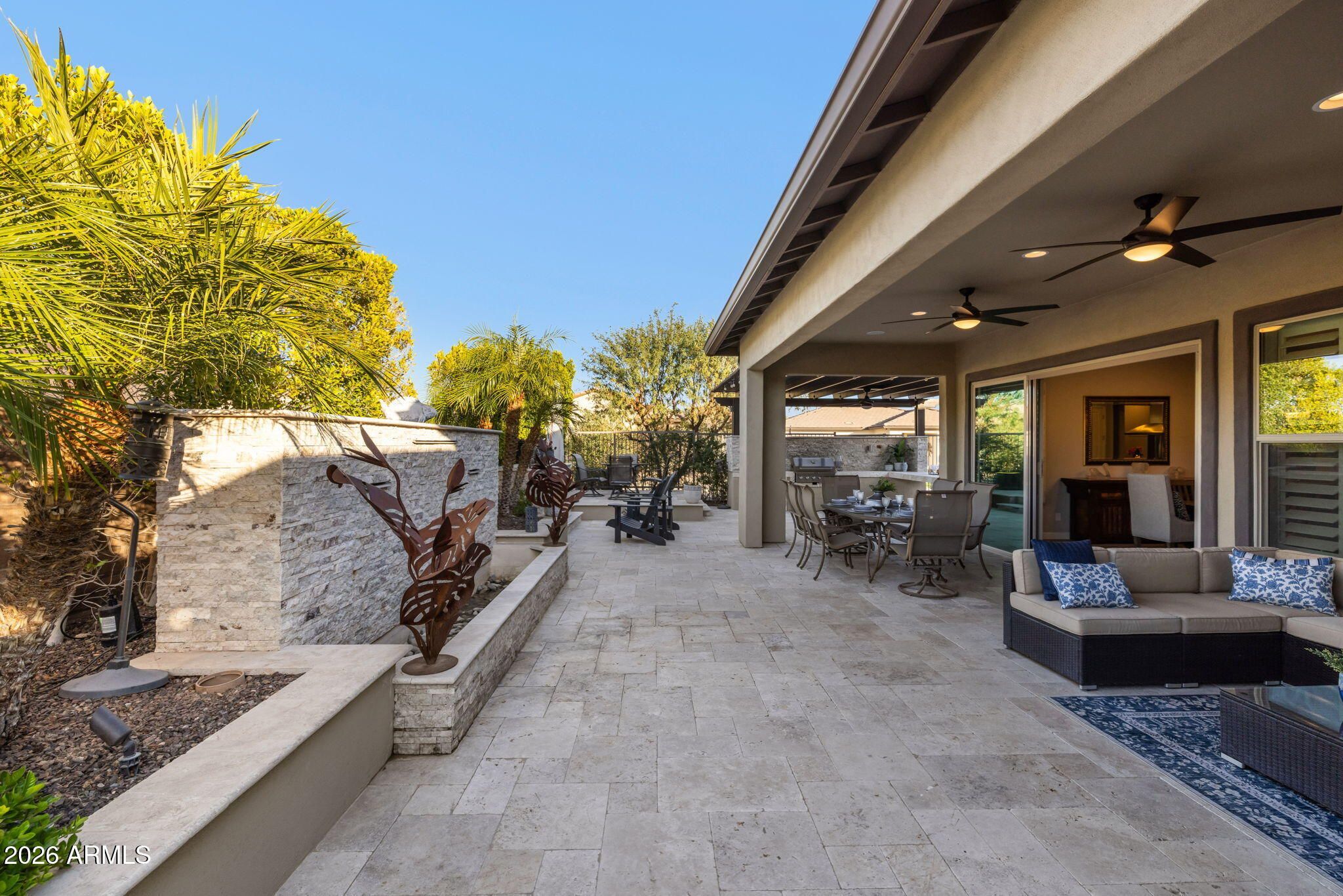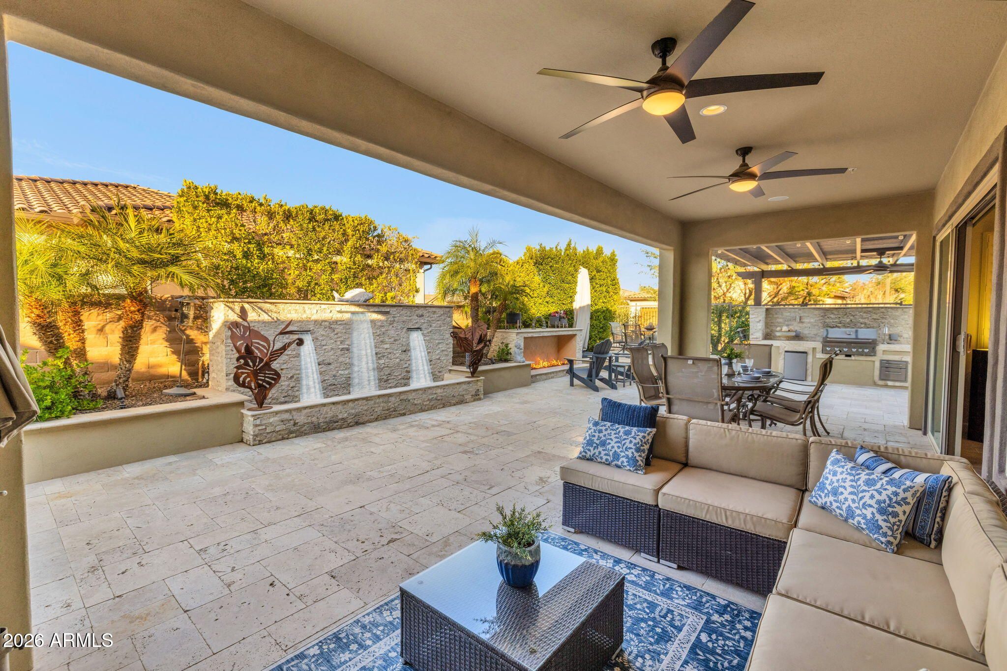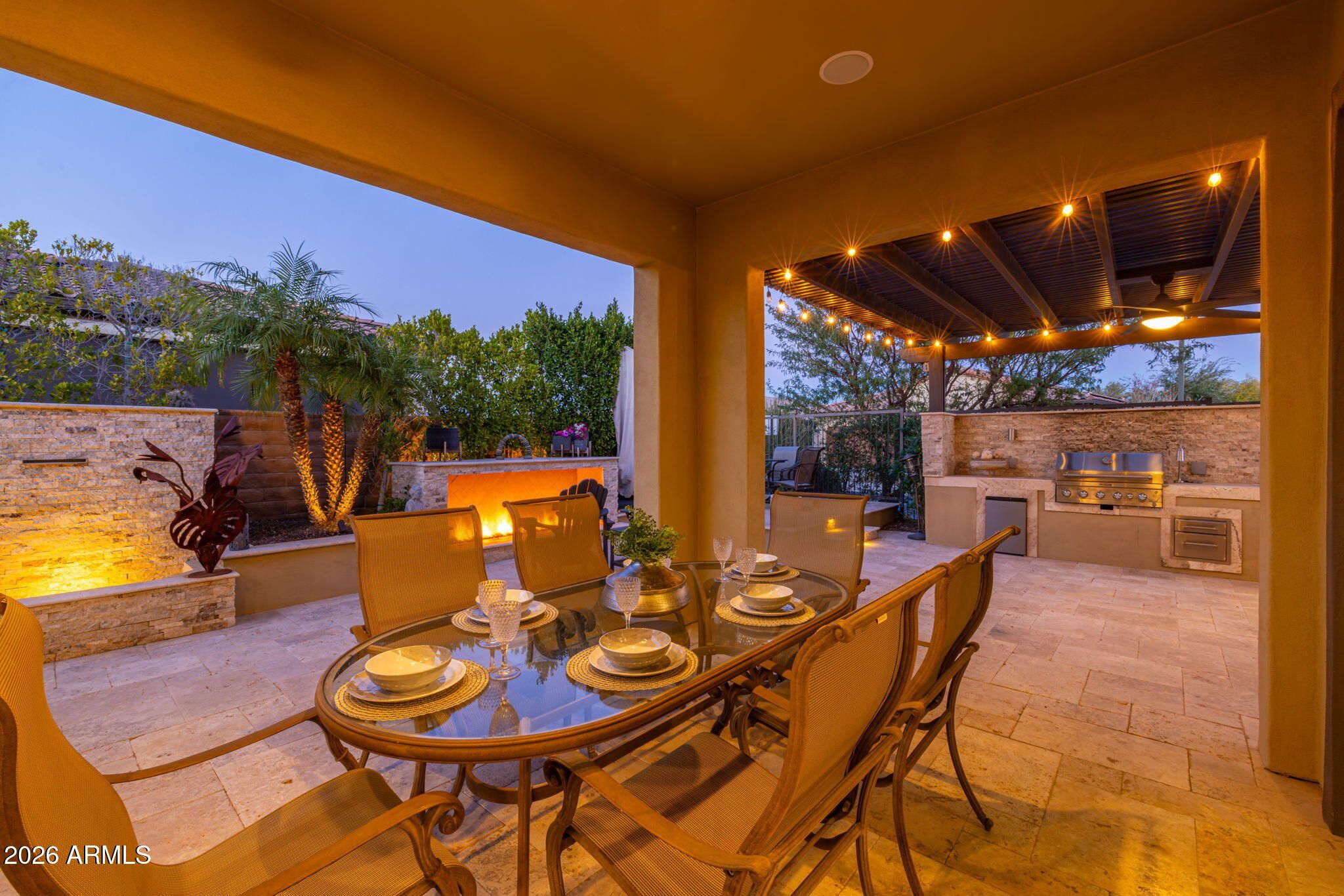 Exquisite Montage model located within the prestigious guard-gated Trilogy® at Vistancia, a premier golf community offering resort-style living. This refined floor plan features two private primary suites, a den with French doors and a custom smart room with dual built-in desks and cabinetry. Over $100K invested in professionally designed landscaping with outdoor kitchen, separate gas fire wall and decorative fountain, bocce court, putting green, and above-ground spa, ideal for elevated indoor-outdoor living. Chef's kitchen with leathered granite, dual built-in ovens, custom pull-out cabinetry, upgraded lighting, and wood-look tile flooring. A 12' disappearing glass wall opens to the private patio. Plantation shutters, surround sound, paid-in-full solar, soft water with RO, and extended garage with epoxy floors and built-ins complete this exceptional offering.