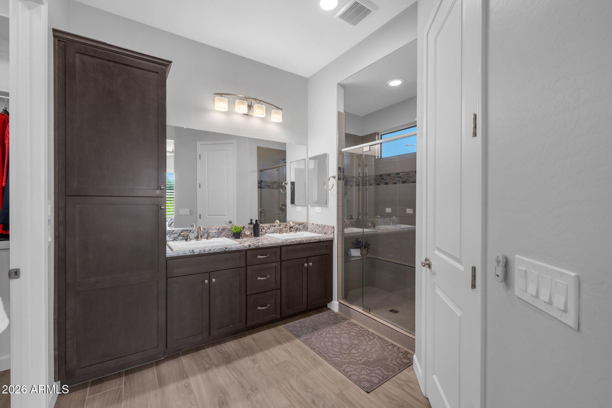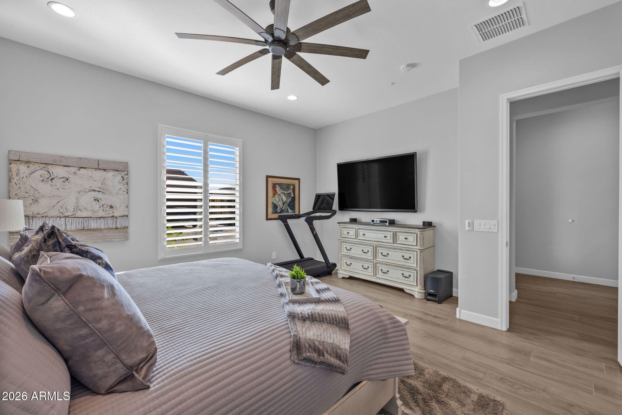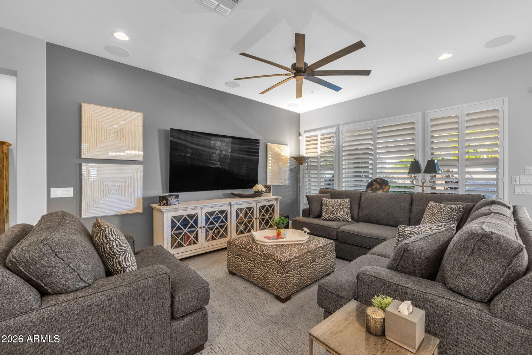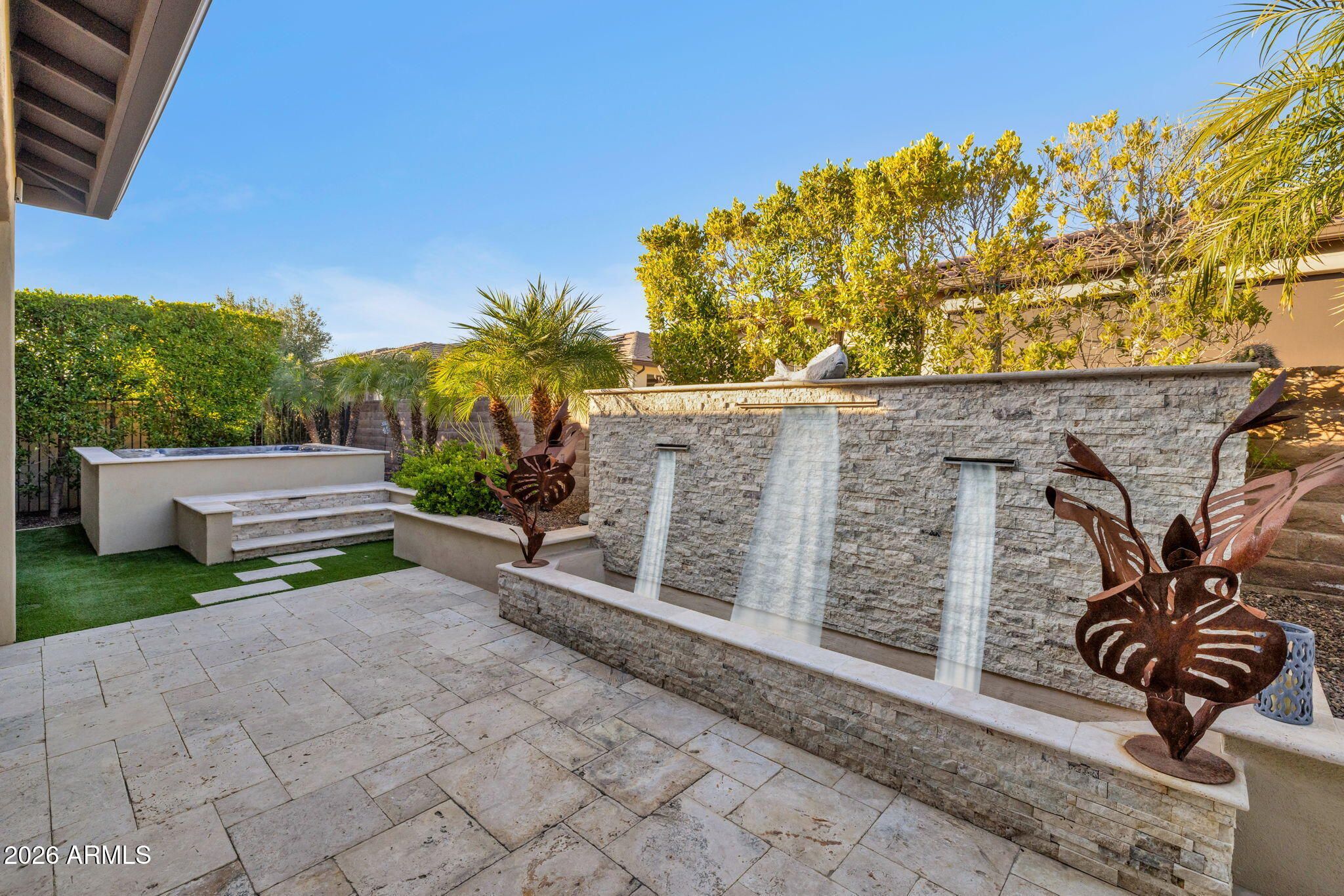Exquisite Montage model located within the prestigious guard-gated Trilogy® at Vistancia, a premier golf community offering resort-style living. This refined floor plan features two private primary suites, a den with French doors and a custom smart room with dual built-in desks and cabinetry. Over $100K invested in professionally designed landscaping with outdoor kitchen, separate gas fire wall and decorative fountain, bocce court, putting green, and above-ground spa, ideal for elevated indoor-outdoor living. Chef's kitchen with leathered granite, dual built-in ovens, custom pull-out cabinetry, upgraded lighting, and wood-look tile flooring. A 12' disappearing glass wall opens to the private patio. Plantation shutters, surround sound, paid-in-full solar, soft water with RO, and extended garage with epoxy floors and built-ins complete this exceptional offering.