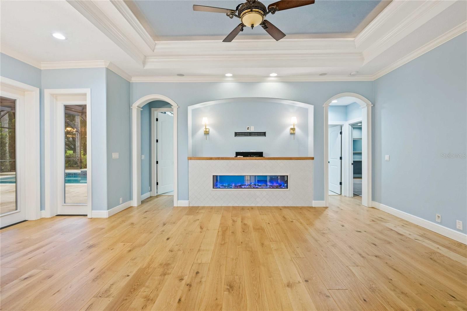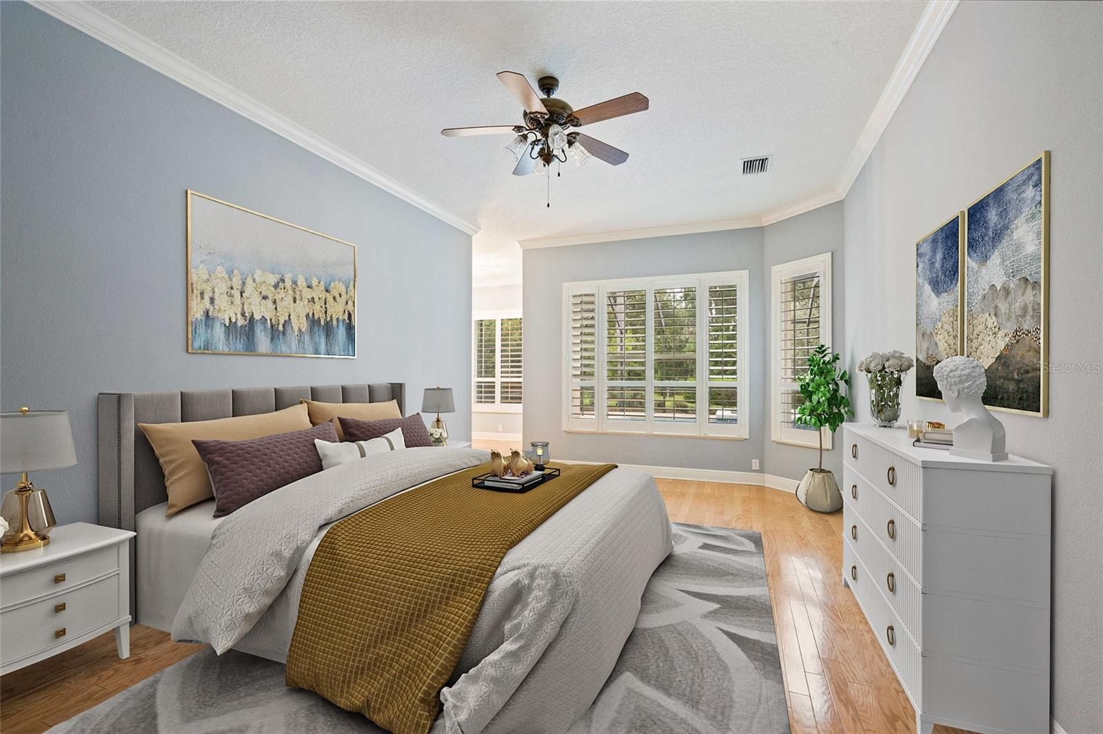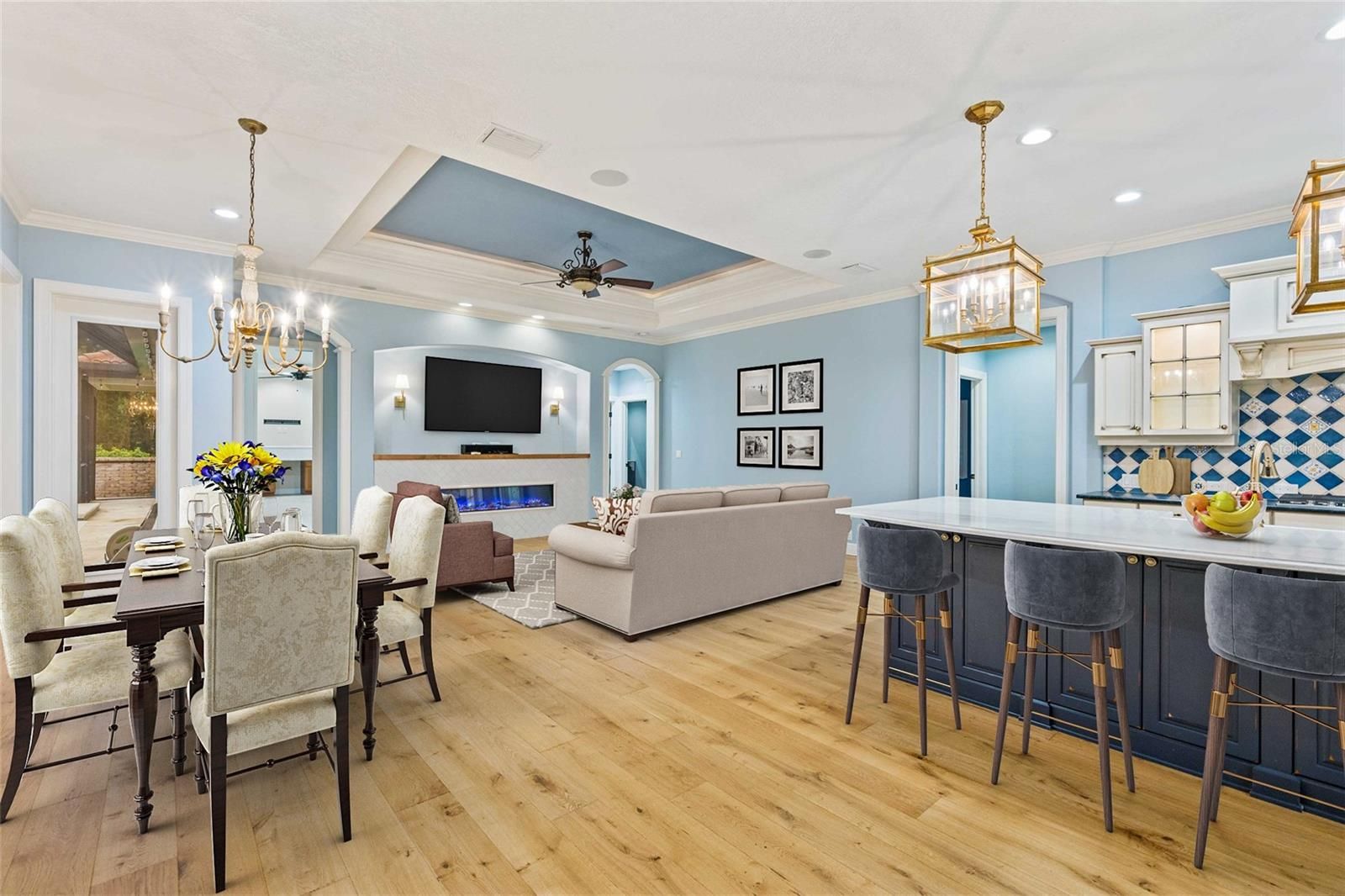 - Ceiling Fan(s), Crown Molding, Eat-in Kitchen, L-Shaped Dining Room, Open Floorplan, Main Level Primary, Solid Surface Counters, Tray Ceiling(s), Wet Bar