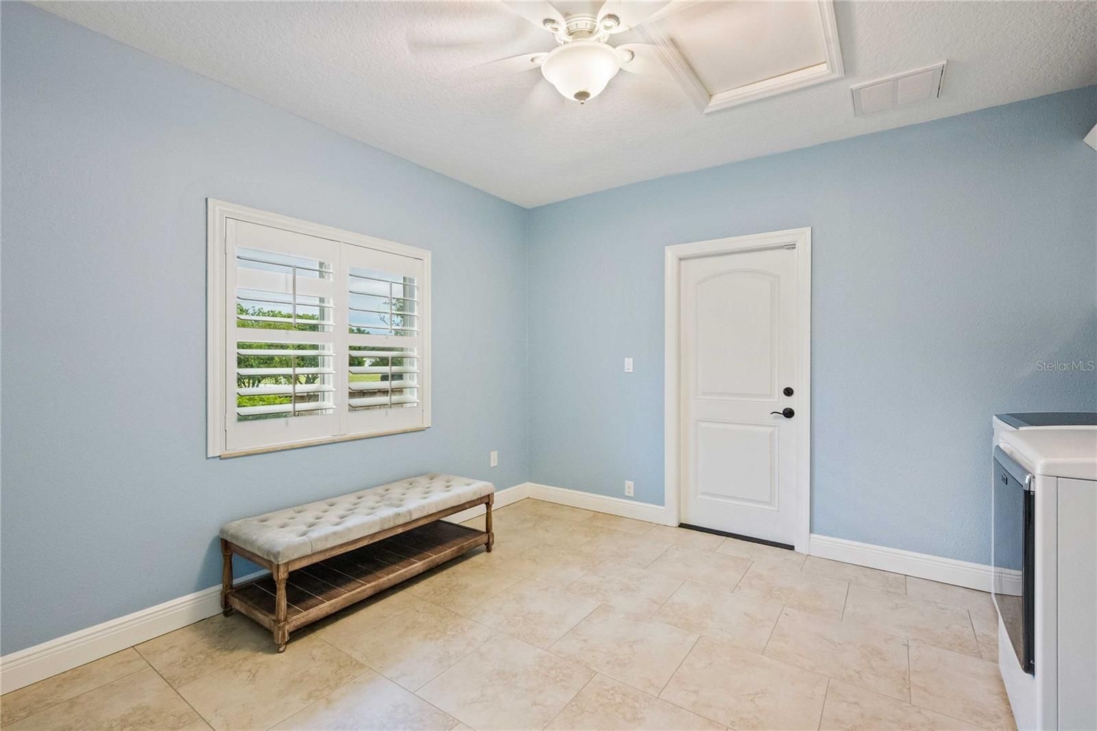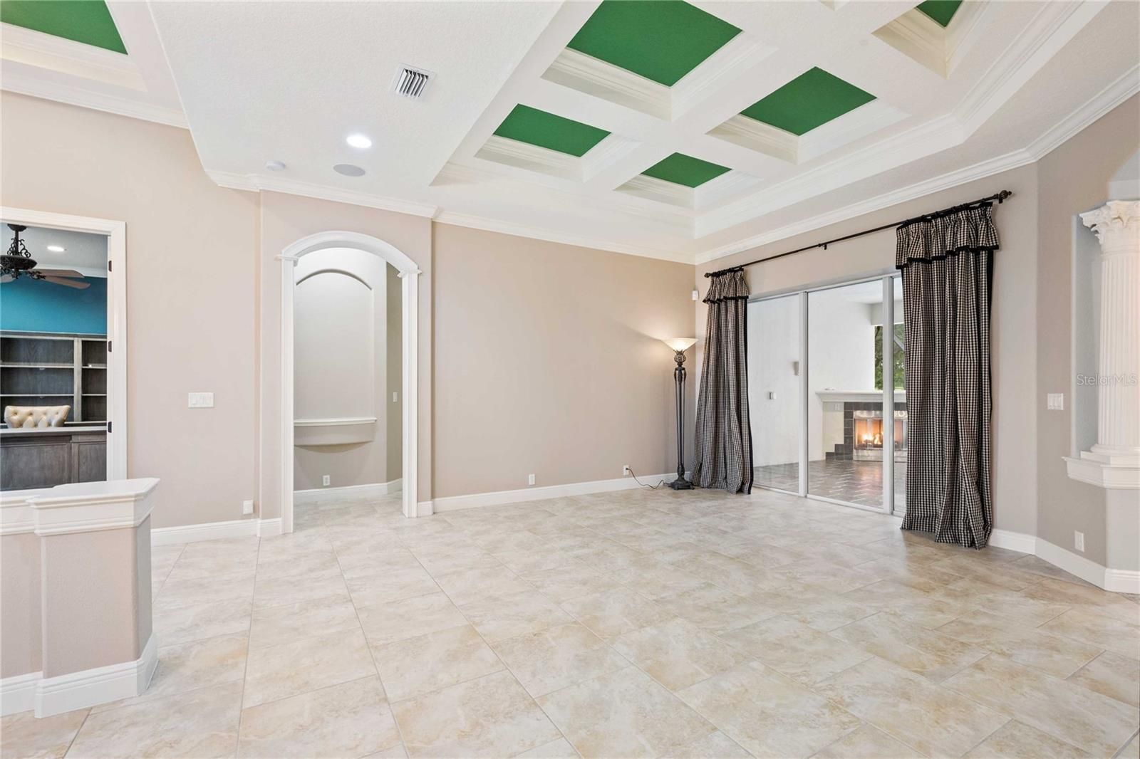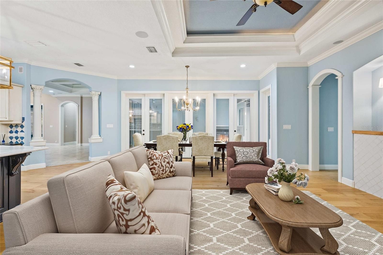 - Ceiling Fan(s), Crown Molding, Eat-in Kitchen, L-Shaped Dining Room, Open Floorplan, Main Level Primary, Solid Surface Counters, Tray Ceiling(s), Wet Bar