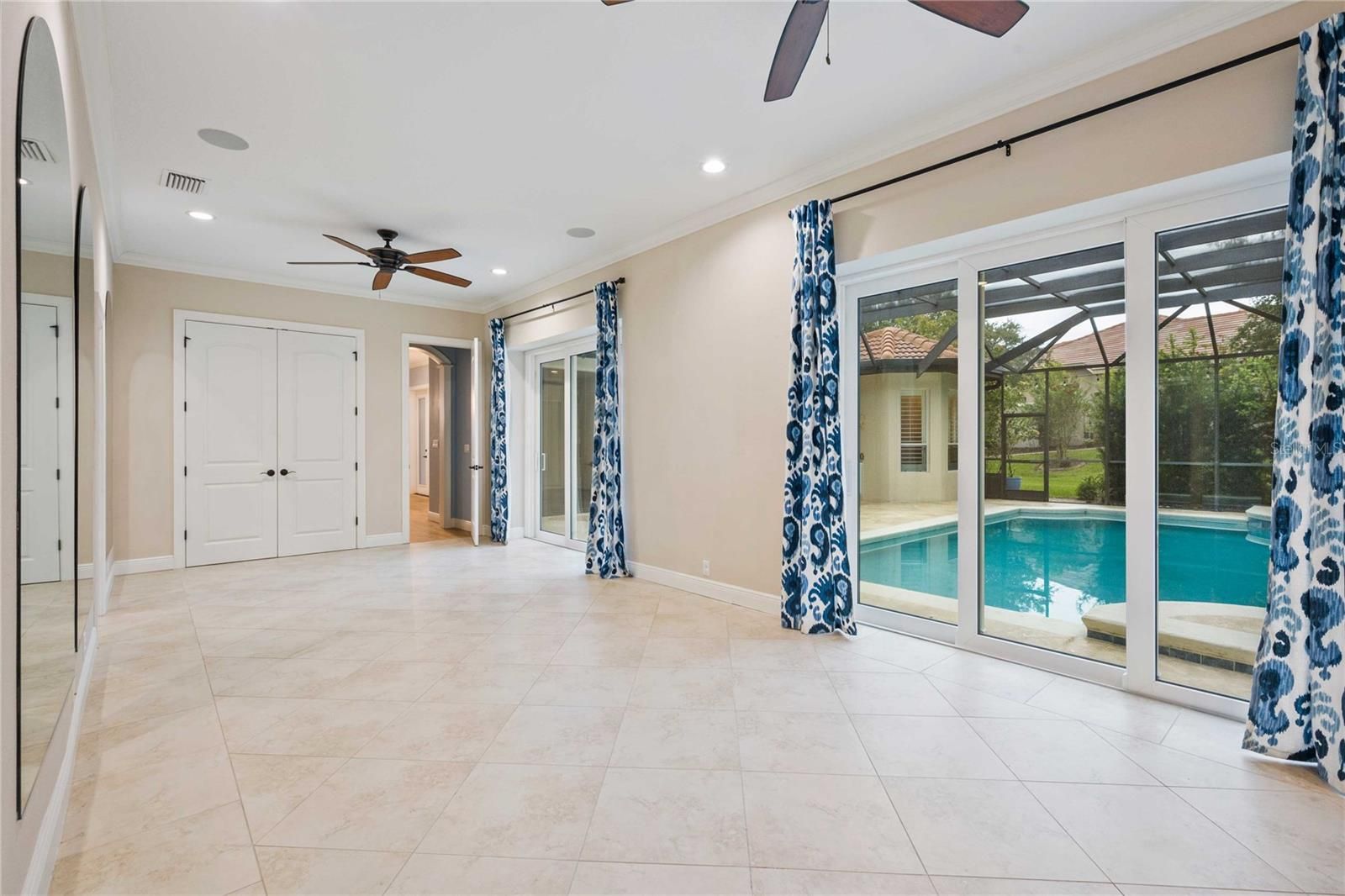 Tucked away on a spacious private lot in the guard gated community of Lake Jovita, this beautifully expanded home offers plenty of room to live, work, and play—with just the right blend of character, comfort, and flexibility. With six roomy bedrooms, a front office with closet and charming brick floors, and loads of adaptable spaces throughout, it’s designed to fit a variety of lifestyles, especially for families who appreciate warmth and privacy. In 2018, the home received a major refresh and addition, bringing in more bedrooms and baths, expanding the custom kitchen and family room, and adding a fabulous bonus space with a wet bar and dishwasher drawer—perfect for movie nights, entertaining, or simply kicking back. When you step through the welcoming double-door entry, and you’ll find a formal living and dining room with a striking tray ceiling, graceful crown molding, and wide-open views of the covered lanai, screen-enclosed pool and hot tub, and peaceful golf course beyond. The neighboring family room mirrors this elevated look with its own tray ceiling, cozy fireplace, and built-in surround sound, adding depth and ambiance to every moment. The heart of the home is the expanded kitchen, thoughtfully equipped with stainless steel KitchenAid appliances, double ovens, a walk-in pantry, soft-close drawers, a second pantry near the wet bar, and a butler’s pantry with cabinetry and a serving station. A large eat-at island anchors the space, while rich wood floors flow through the kitchen and family room, adding warmth and elegance. French doors from both the family room and breakfast nook open to the screened outdoor area, creating a seamless transition for indoor-outdoor living all year round. Two primary suites offer comfort and flexibility and the split plan layout could be perfect for joining or multi-generational families. The main retreat features a remodeled bath with jetted tub, dual walk-in closets, a private workout or flex space, and views of the pool, while the second suite is perfect for guests, teens, or extended family. Other highlights include a study nook with built-in lighting, two fireplaces, plantation shutters throughout, and two laundry rooms, including a primary laundry area off the garage with enough space to function as a convenient mud room. The home also features surround sound throughout with amplifier and control 4 system, enhancing daily life whether you're watching a film, listening to music, or setting the mood for a quiet night in. Continue the activities outside with your basketball goal and spotlight conveniently located in your driveway. The home also includes a home water softener and a WHOLE HOME GENERATOR for your peace of mind and uninterrupted power during unpredictable weather. End your days stepping outside on your lanai to experience the breathtaking sunset views down the 14th fairway of the North Course of Lake Jovita. Take advantage of NO CDD FEES and all Lake Jovita has to offer inclusive of a park with a one-third mile long track with exercise stations, pickleball courts, basketball courts, a playground area, a large open area for any use requiring a field, and two dog parks. The optional clubhouse memberships are also available to enjoy all the additional features of the community including any Club facility, such as the golf course, clubhouse, swimming pool, tennis courts or golf practice facilities. So much to offer in one home you must see it for yourself!