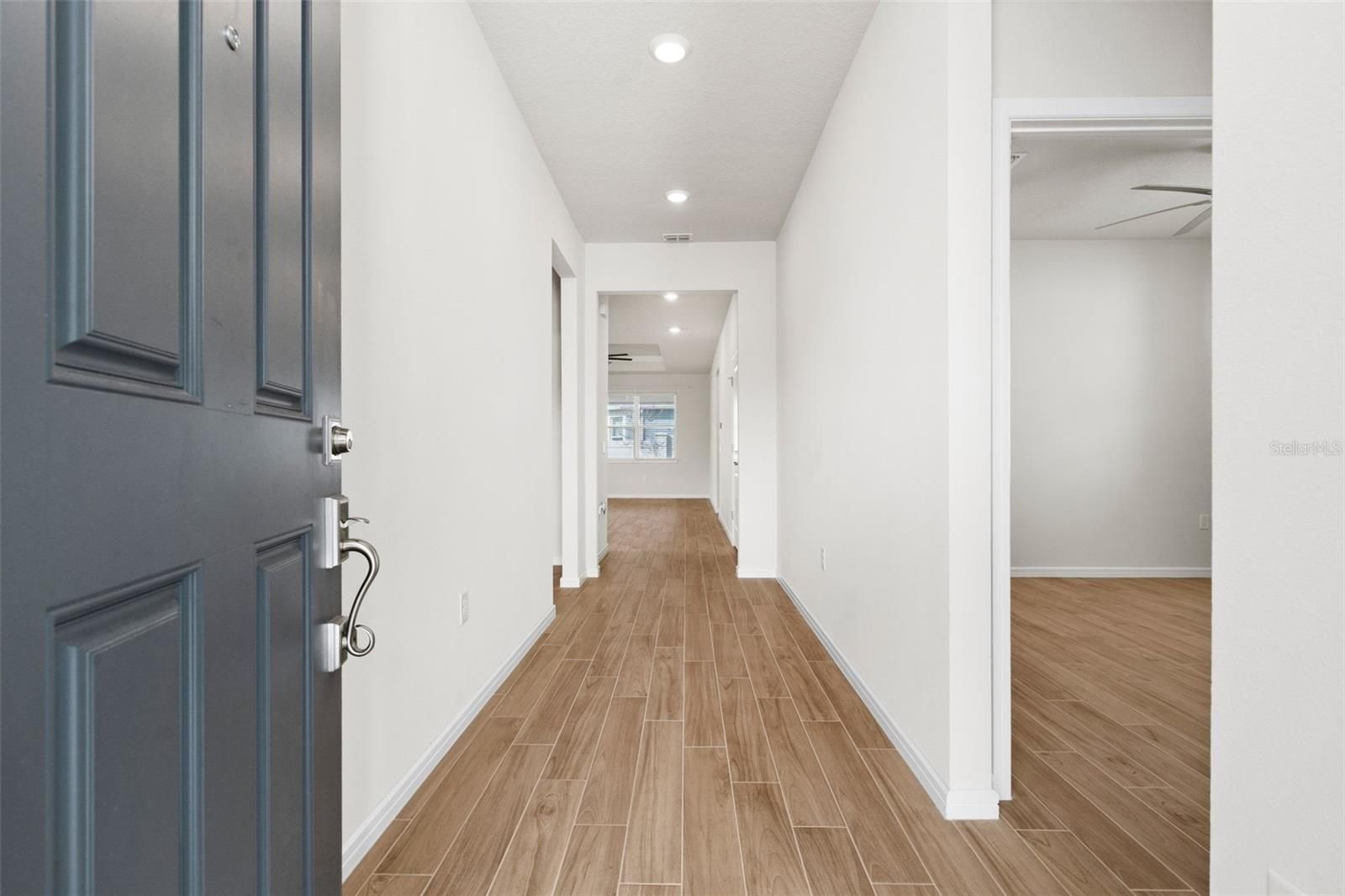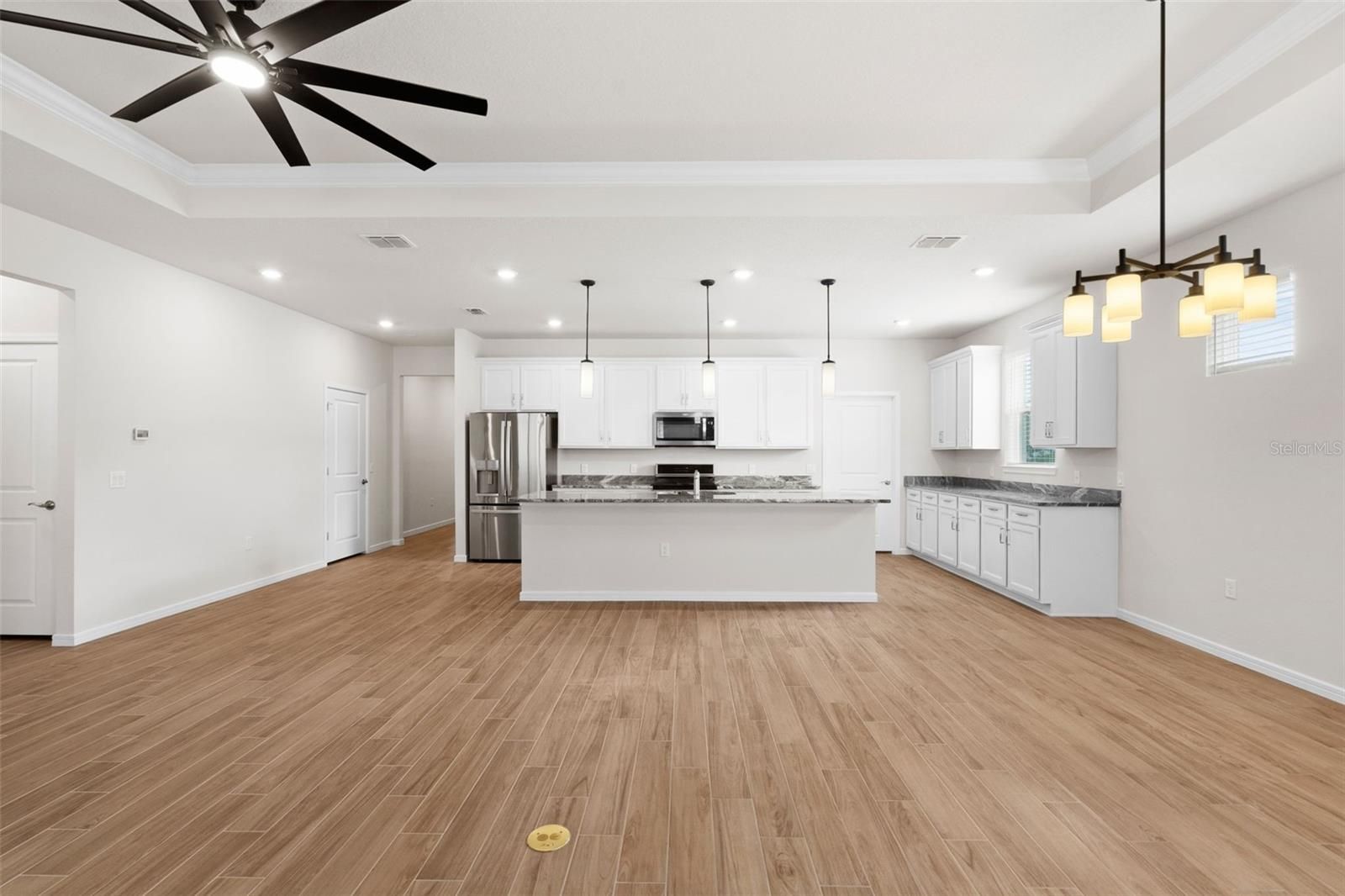 - High Ceilings, Kitchen/Family Room Combo, Living/Dining Room, Open Floorplan, In-Wall Pest Control, Main Level Primary, Smart Home, Solid Surface Counters, Solid-Wood Cabinets