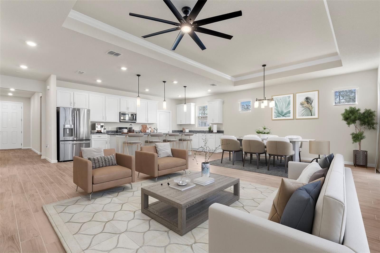 One or more photo(s) has been virtually staged. Experience the renowned 55+ lifestyle at Del Webb Oasis, a world-class, resort-style boutique community offering exclusive amenities, a prime Horizon West location, and natural gas single-family and villa homes nestled in wooded conservation. Residents enjoy a full calendar of social events led by a full-time Lifestyle Director, all centered around a stunning clubhouse. Amenities include a resort-style zero-entry pool with lap lanes and sun shelf, private poolside cabanas, spa, outdoor fire pits with fireworks views, fitness center, tennis and pickleball courts, and a walking trail with exercise stations. Just minutes from Flamingo Crossings, Disney, and major new-construction neighborhoods, Del Webb Oasis is ideally located within one of Central Florida’s fastest-growing master-planned communities, with rising home values throughout the area. Every inch of this thoughtfully designed single-story Palmary floorplan is crafted to make life better, happier, and easier. The home features 3 bedrooms, 2 bathrooms, an open-concept kitchen, café, and gathering room, a covered lanai, and a 2-car garage, offering both comfort and functionality for effortless living and entertaining. Step through the impressive foyer into the heart of the home, where the kitchen, café, and gathering room flow seamlessly to the covered lanai for ideal indoor/outdoor living. The kitchen is appointed with 42” soft-close cabinets, granite countertops, a white center island, built-in stainless-steel appliances, sink and faucet, pendant lighting, and a corner walk-in pantry—perfect for making meals and memories.The private Owner’s Suite features a spacious walk-in closet and a luxurious en suite bathroom with dual-sink granite-topped vanity, private water closet, linen closet, and a luxe super shower. Toward the front of the home, the secondary bedrooms, a full bathroom with shower, and laundry room provide privacy and space for everyone. This home is loaded with functional luxury, including a patio extension, kitchen and owner’s bath, laundry room enhancements, interior doors, electrical upgrades, tile flooring throughout, and professionally designed selections throughout. Located on Sunny Retreat Lane, this home is part of a desirable cluster of 2021–2023 builds with strong appreciation. Get spoiled at Del Webb Oasis—after all, this is your time. Your dream home awaits—schedule your visit today!