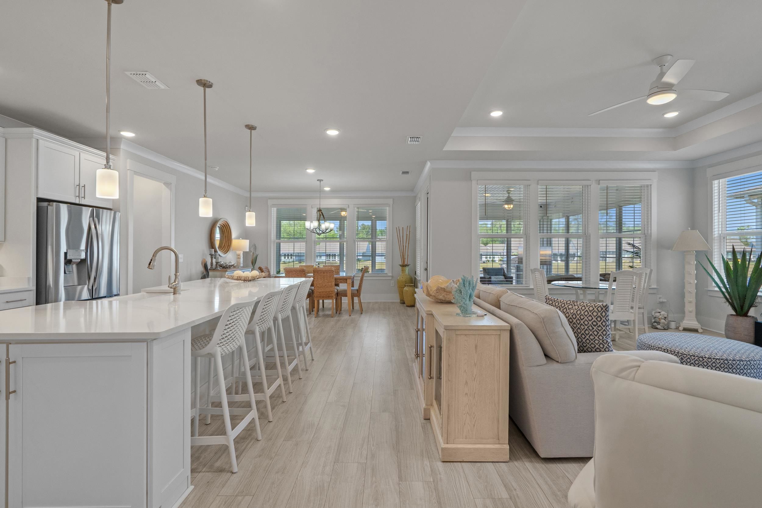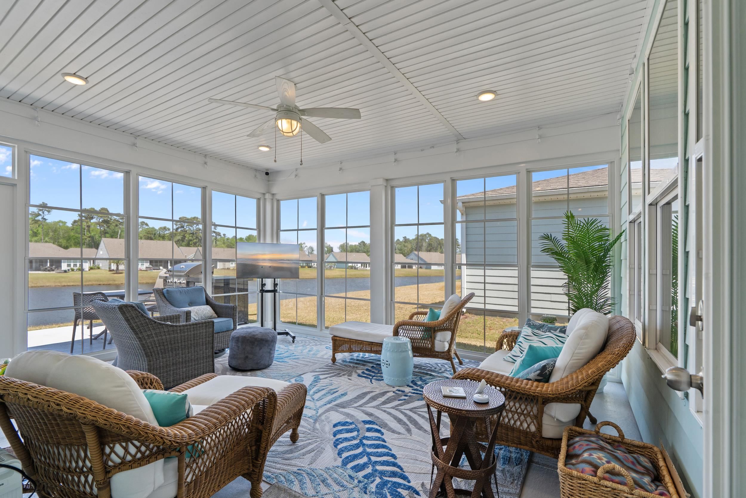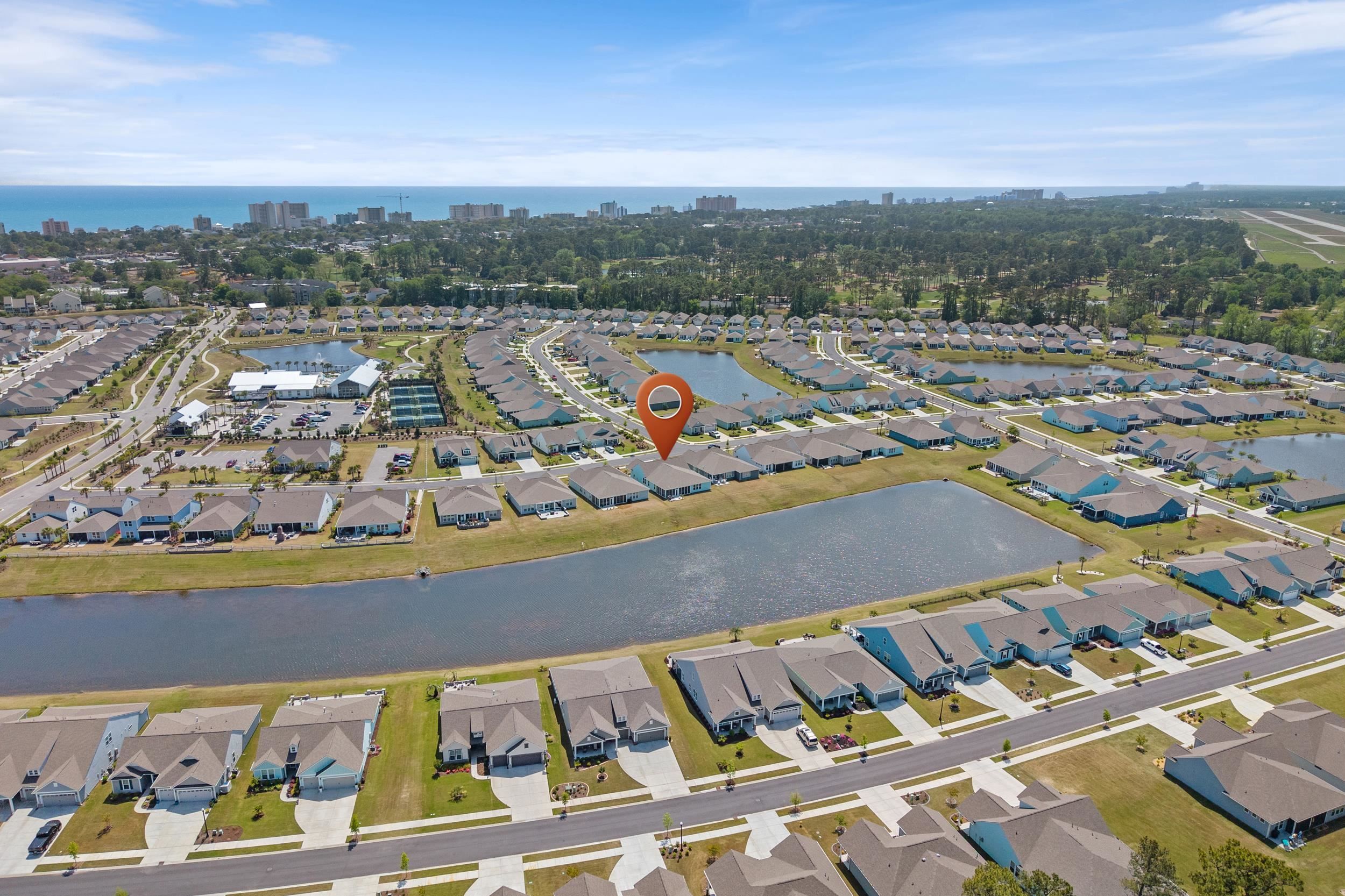 Welcome to your dream home nestled on a beautiful pond lot in the vibrant Del Webb 55+ community, just a mile from the beach! This modern, move-in ready residence was built in 2023 and boasts 3 spacious bedrooms, an office with elegant French doors, and 3.5 bathrooms, perfect for comfortable living. The home also features a spacious three-car garage for ample storage and parking, along with a charming front porch that adds to its curb appeal and provides a welcoming entrance. As you enter, you'll be greeted by an open floor plan that seamlessly connects the kitchen, living room, and dining area, all showcasing stunning views of the picturesque pond. The home is designed with crown molding, large baseboards, modern lighting, and high-quality LVP flooring throughout, providing a polished and sophisticated atmosphere. The kitchen is a chef's delight, featuring luxurious quartz countertops, an extended island with seating for four, a farmhouse sink, and top-of-the-line Kitchenaid appliances, including a gas range, double oven, and a stylish range hood. With ample storage from the extra cabinets and a walk-in pantry, this kitchen is both functional and beautiful. The kitchen is further enhanced by under cabinet lighting, adding a warm glow. Additionally, the kitchen includes a delightful coffee bar and a wine bar featuring a wine rack and a mini fridge, perfect for entertaining and enjoying your favorite beverages. The inviting dining area, conveniently located just off the kitchen, offers lovely views of the pond, creating the perfect setting for enjoying meals and entertaining guests. The primary suite is located in the rear of the home, with stunning pond views. Enjoy two walk-in closets, including one that conveniently connects to the laundry room, along with a linen closet. The luxurious primary bathroom features a large zero-entry tile shower, a separate water closet, and dual sinks. The guest bedrooms each have their own bathroom—one equipped with a tile shower and the other with a tub/shower combo—ensuring comfort and privacy. Enjoy serene pond views from the oversized E-Z Breeze lanai, where you can unwind or entertain. Outside, enjoy cooking on your gas BBQ grill, and enjoy low-maintenance living as the HOA takes care of mowing the lawn. Del Webb's community amenities enhance your living experience with a fitness center, an indoor pool, an outdoor saltwater pool, bocce courts, a putting green, and eight pickleball courts. Engage in exciting activities organized by a full-time lifestyle director. The community is golf cart-friendly and welcomes pets, ensuring a lively and inviting environment. With convenient access to dining, shopping, marinas, and medical facilities, this meticulously maintained home offers everything you need for comfort and convenience, all while enjoying a laid-back coastal lifestyle. Plus, Myrtle Beach International Airport is less than 30 minutes away, making travel a breeze. Don’t miss this opportunity to own a piece of paradise! Schedule your tour today!