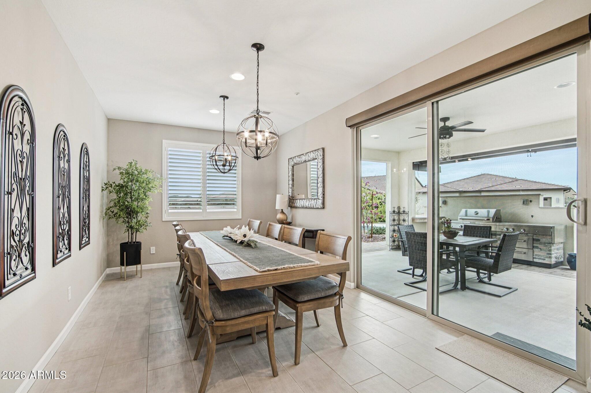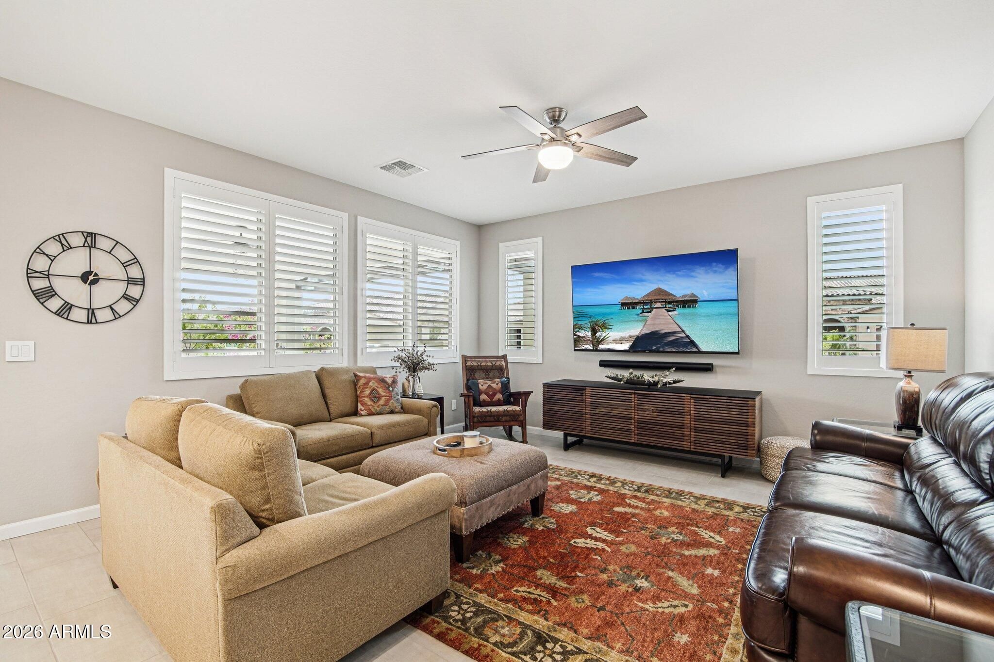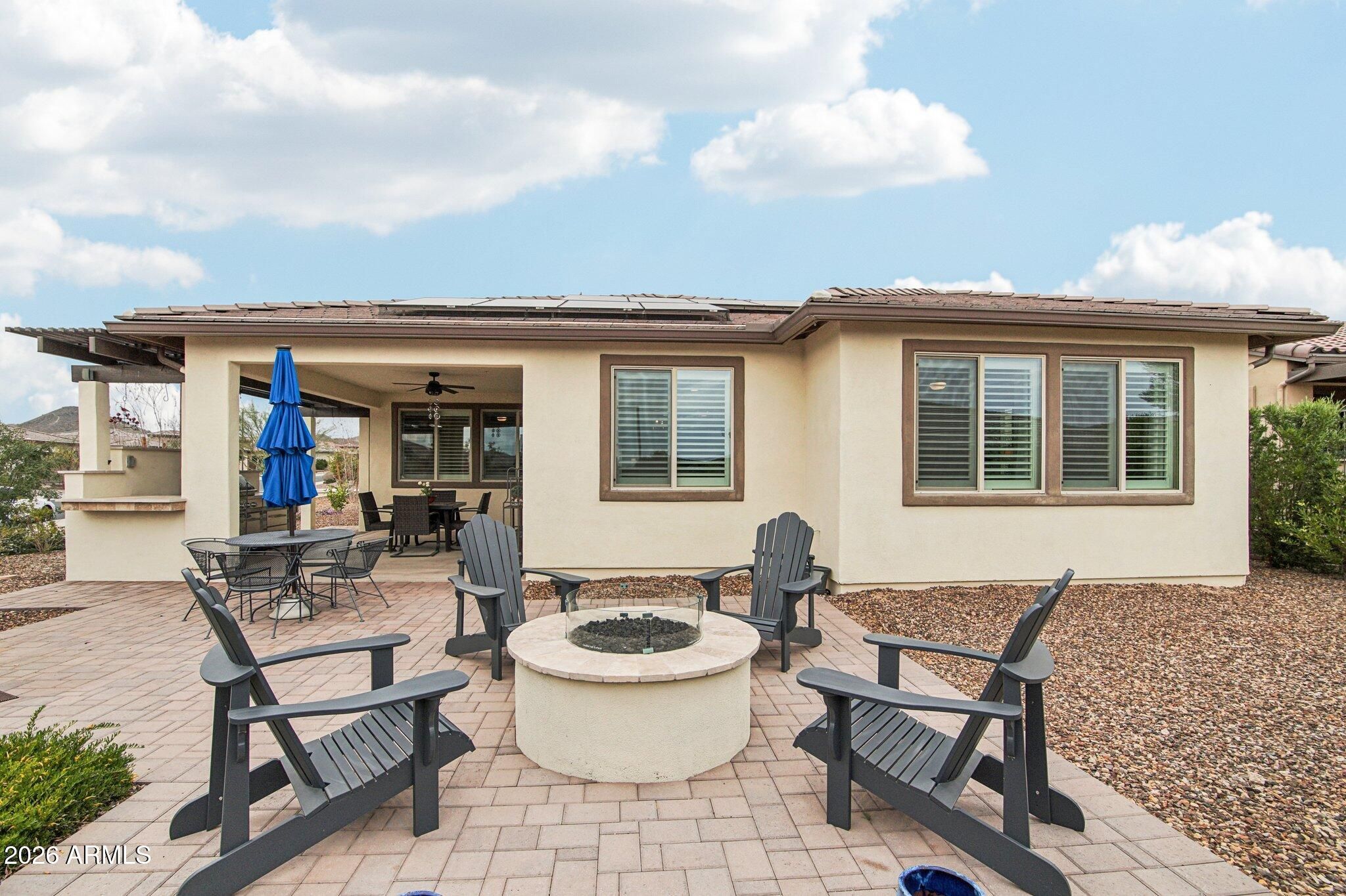 Mosaic model featuring 2 bedrooms, 2 bathrooms, and a dedicated office/den in Trilogy at Vistancia, a 55+ active adult community. Built in 2022 and offering 1,926 sq ft, this single-story home is located on an oversized corner lot and includes owned solar. Interior features include wood shutters throughout, an automatic blind at the sliding glass door, quartz countertops, stainless steel appliances, and built-in cabinetry in the laundry room with desk and wine storage. The extended garage includes built-in cabinets, overhead storage racks, and a mini split system. The backyard features a pergola, firepit, and in-ground Sonos speaker system.